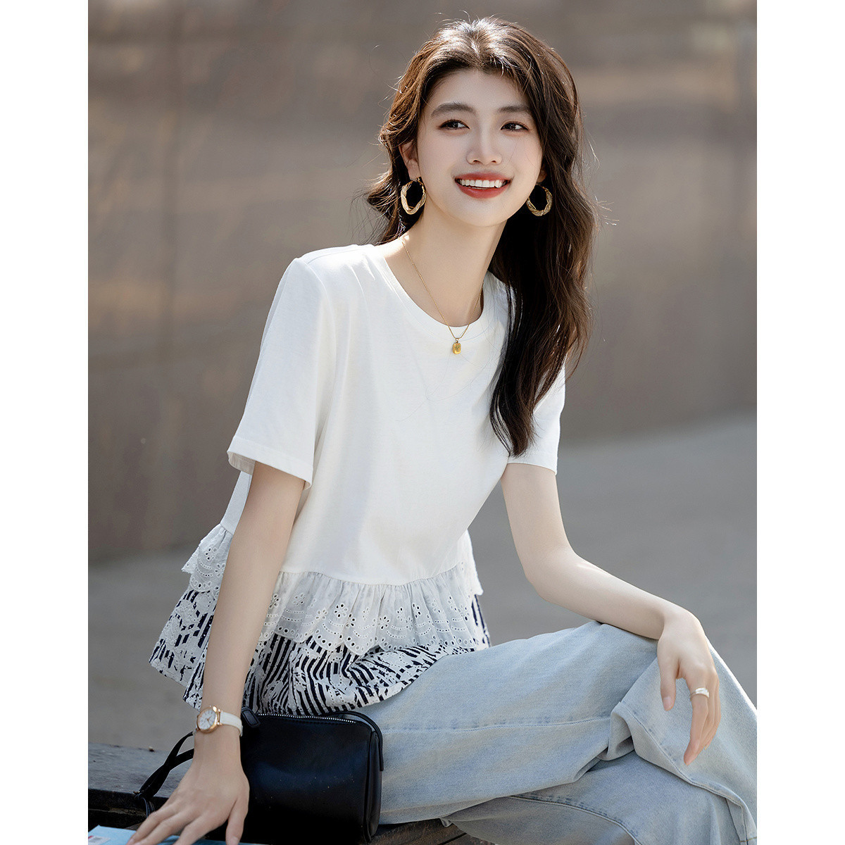 "Oxygen" 프리 2025 여름 패셔너블 스플리싱 바텀 셔츠 라운드 넥 루즈 반팔 여성 티셔츠