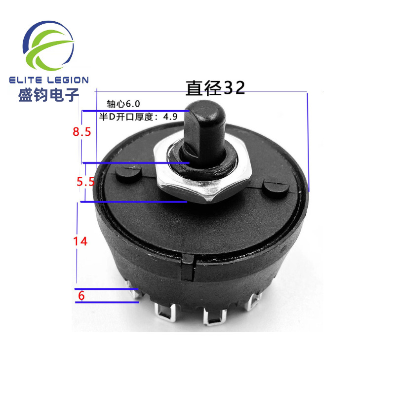 此款开关可用于料理机、破壁机、碎冰机、绞肉机等等...MFR01-A1系列直径32mm,旋转角度36度,固定孔距22mm,最多可做10档360度旋转,点动功能可做到7档带点动。