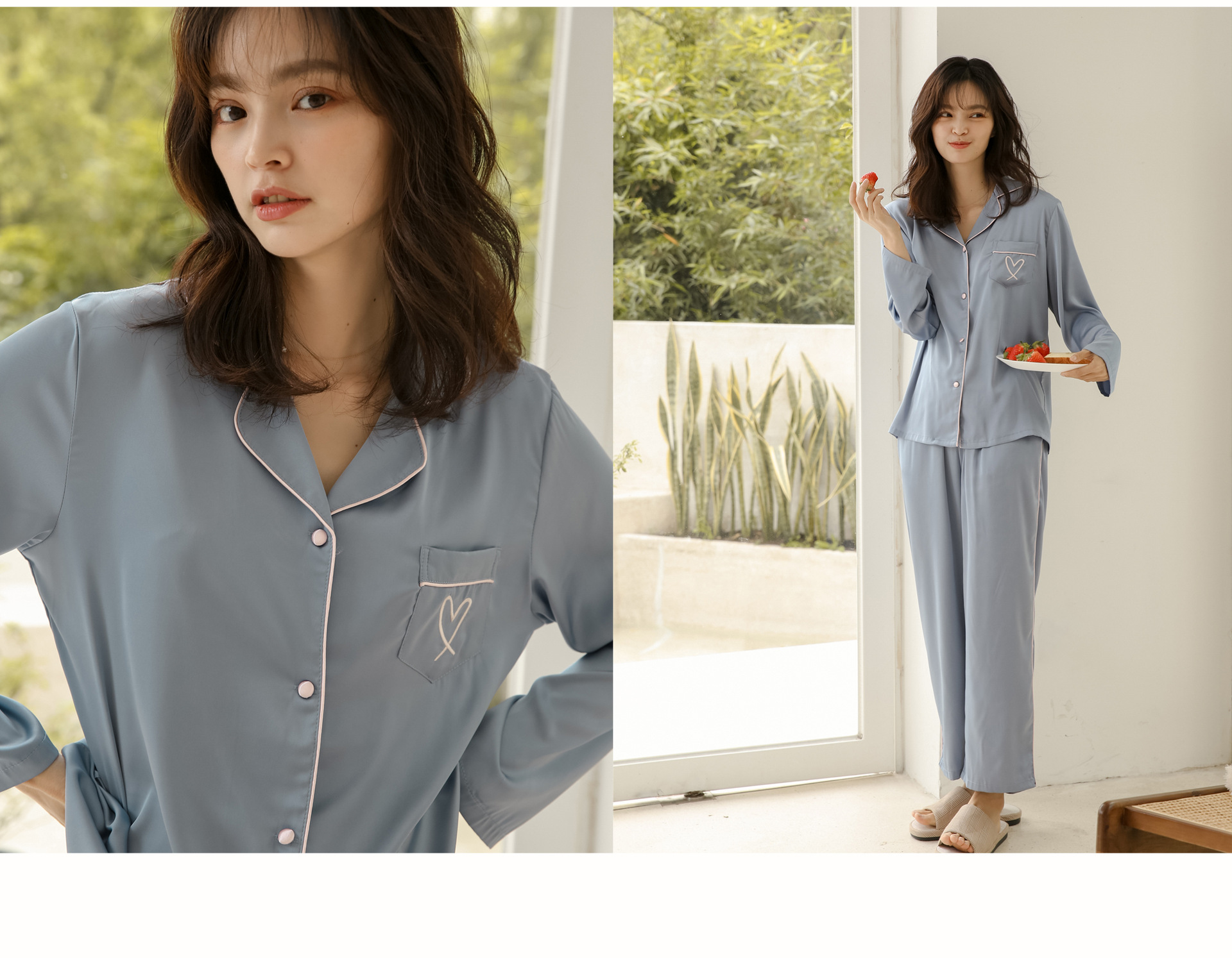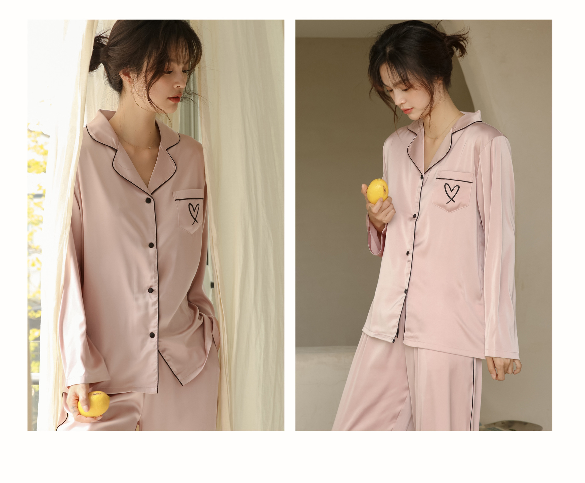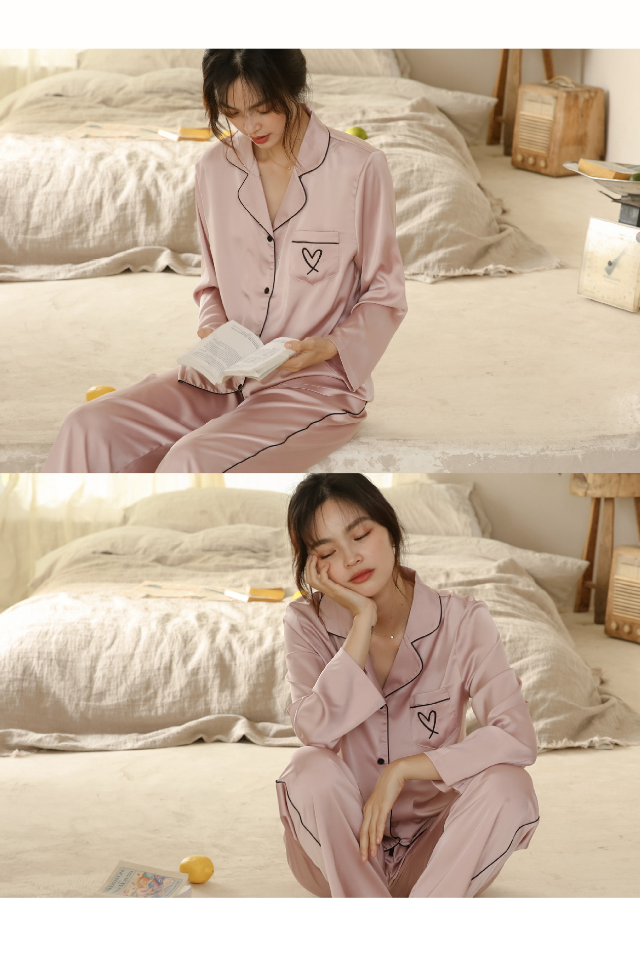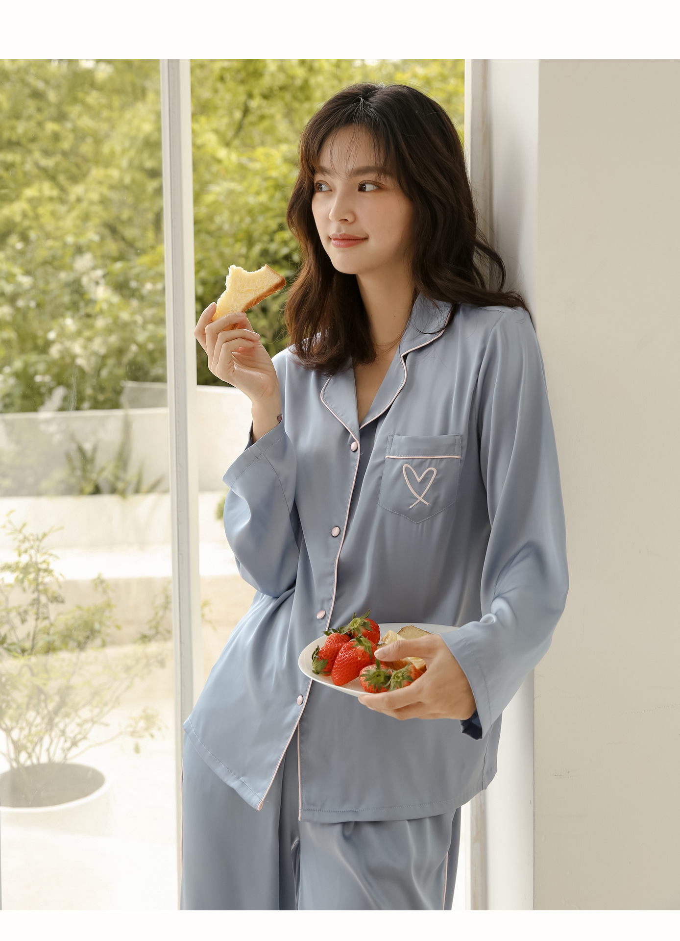 자수 하트 무늬 여성용 얇은 시원한 아이스 실크 긴팔 긴바지 투피스 실크 여성 홈웨어 캐주얼