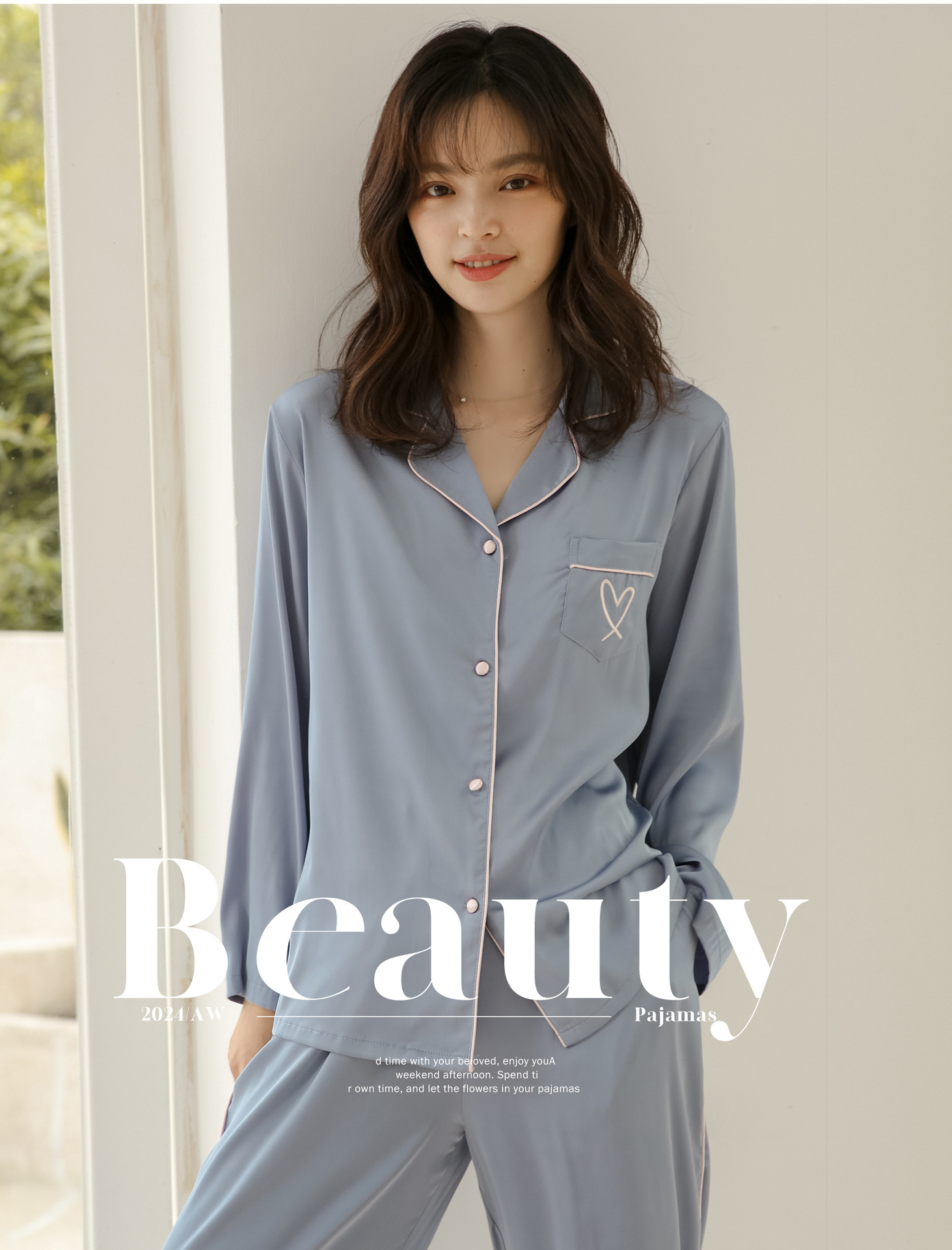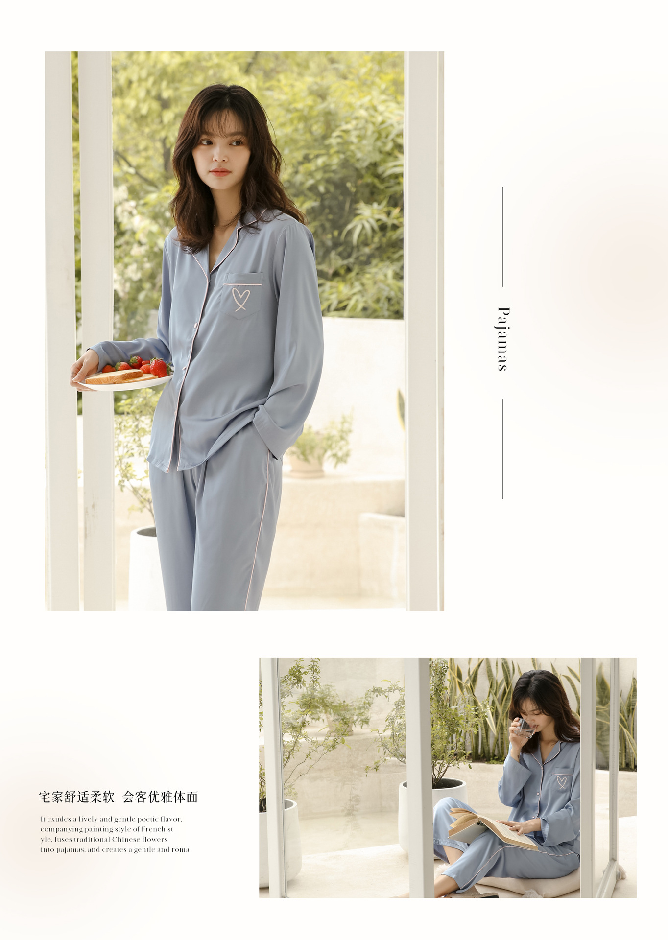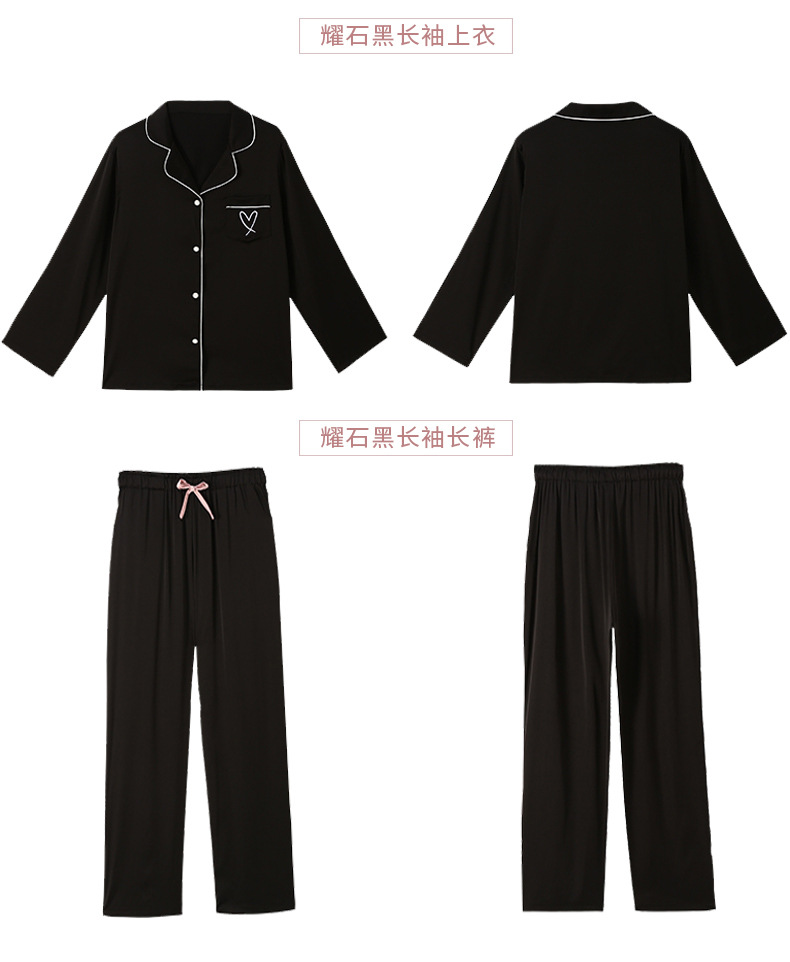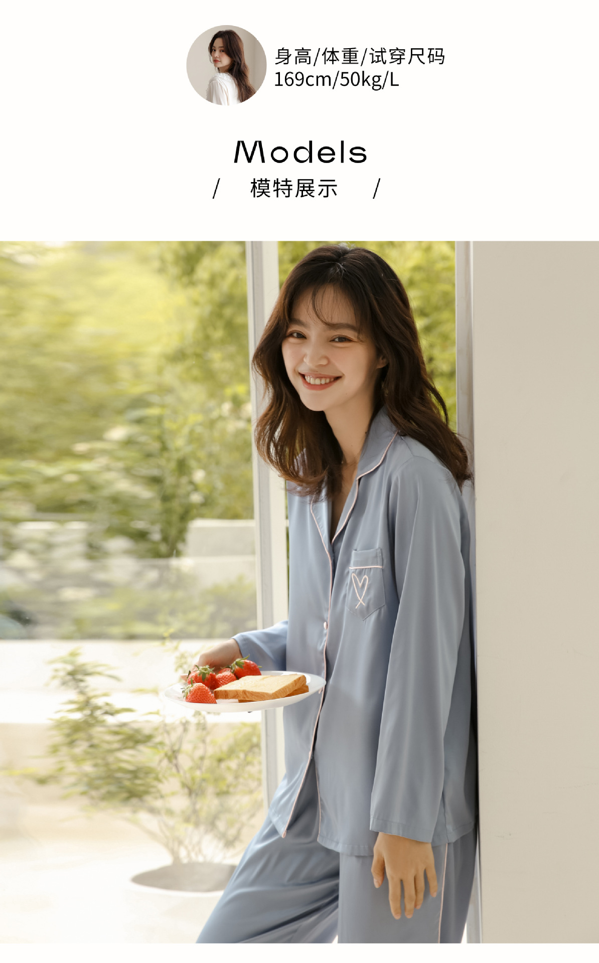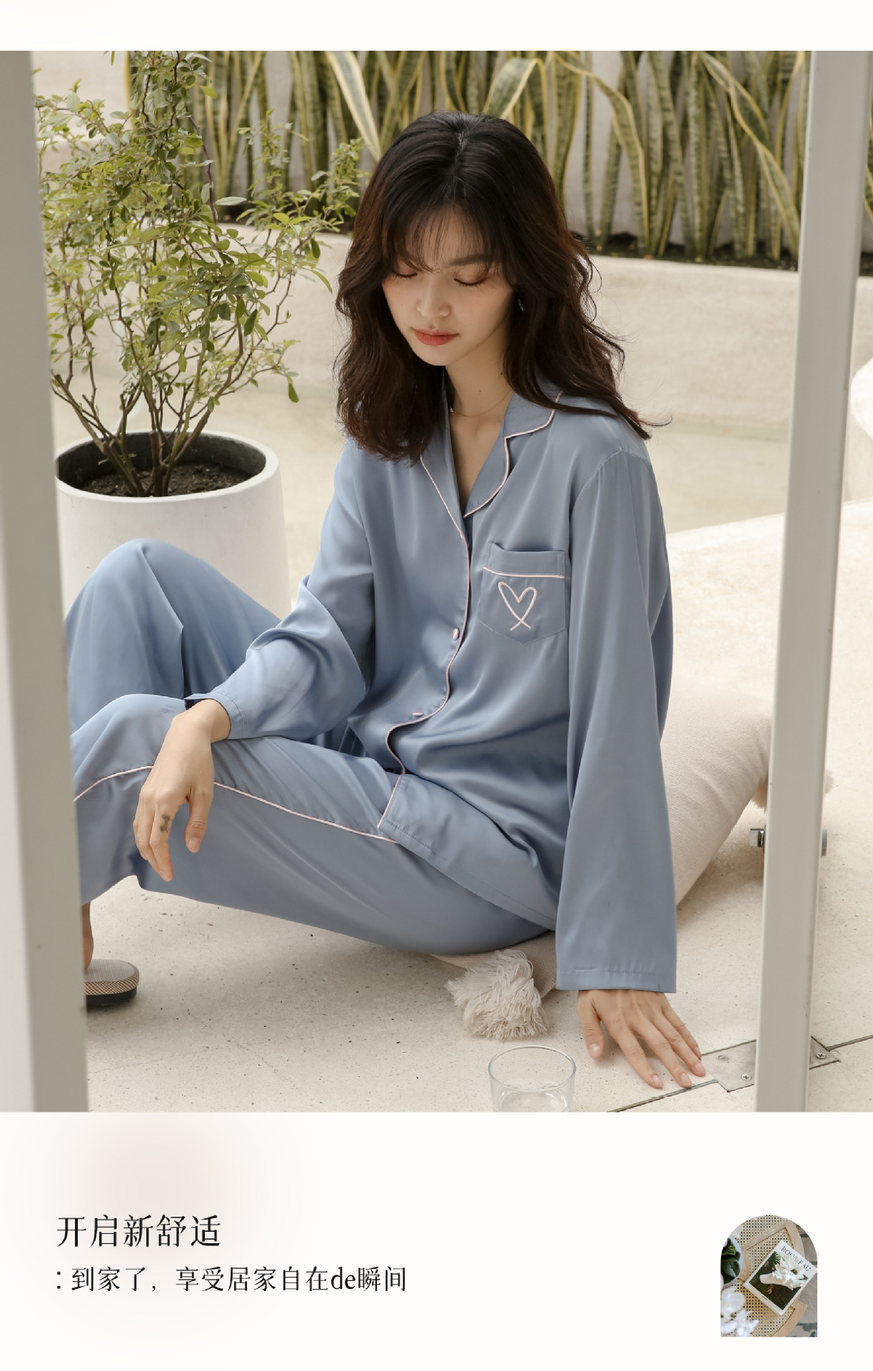 자수 하트 무늬 여성용 얇은 시원한 아이스 실크 긴팔 긴바지 투피스 실크 여성 홈웨어 캐주얼