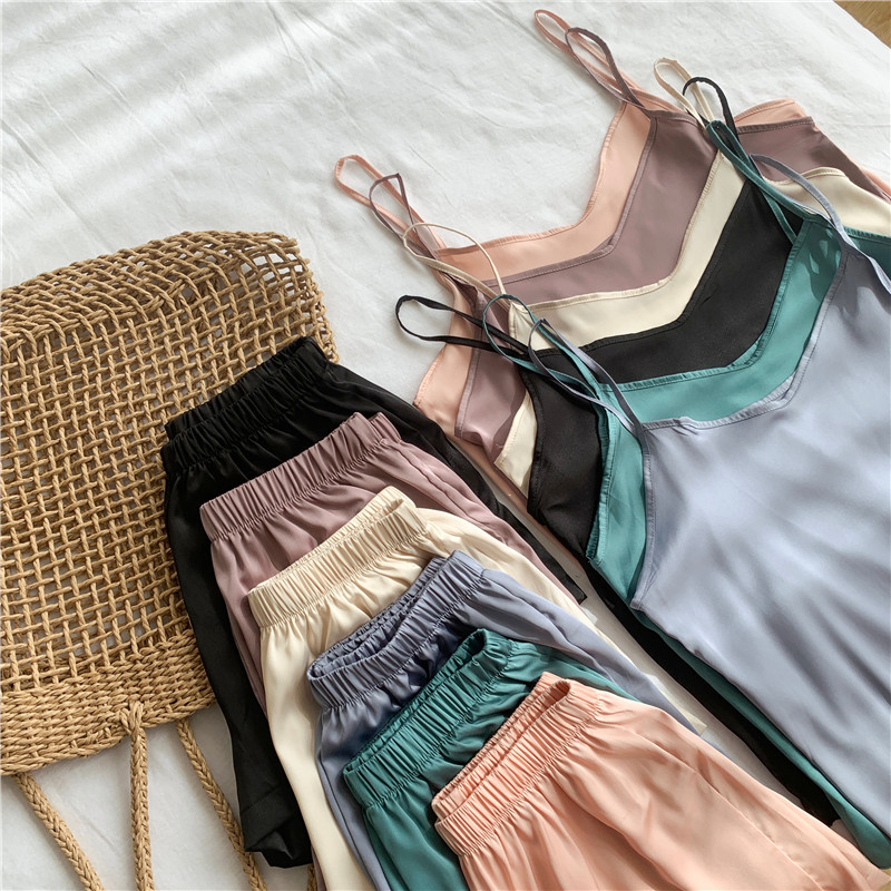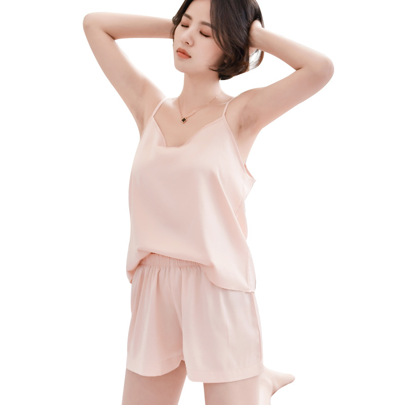봄과 여름 실크 새로운 여성 캐주얼 쉬폰 여성 슬링 잠옷 단색 2 종 세트 작은 조끼
