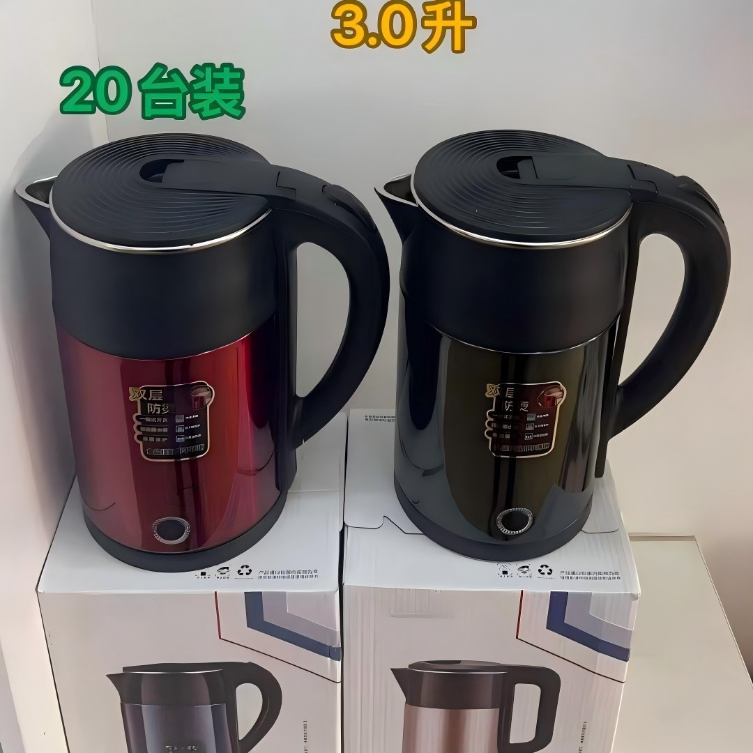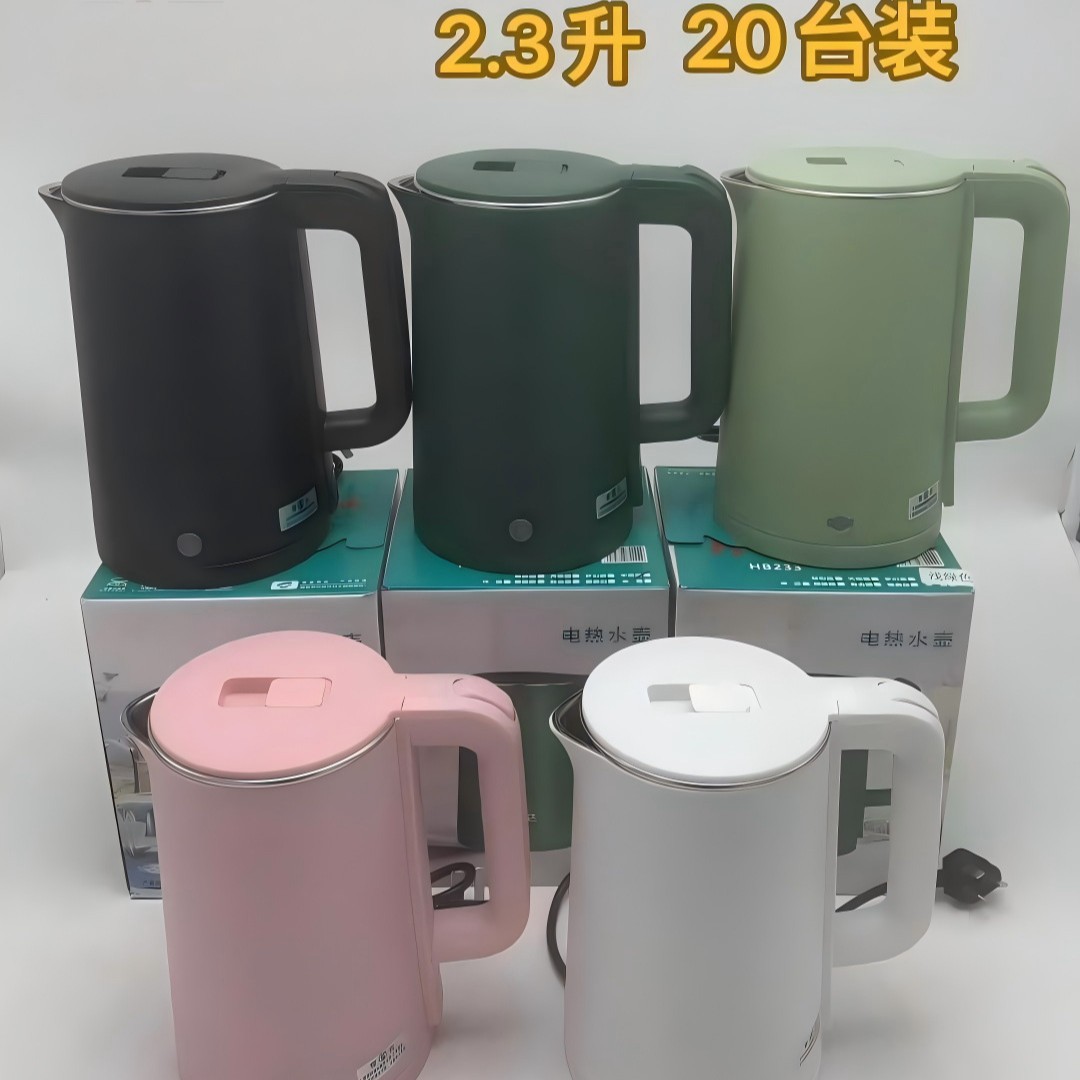 双层防烫电热水壶,大口径2.3升,一箱20个,颜色默认随机发货,可以发普通货运物流,支持物流运费到付,支持一件代发,支持丝印LOGO.