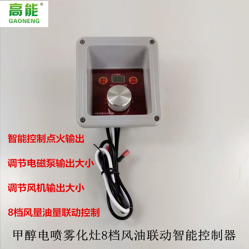 本控制器为整体塑壳防潮结构,自带引出线,用于风机醇油雾化炉灶,除可实现常规的点火输出、电磁泵输出、风机输出等功能外,8档火力随心动、控制自如的效果。