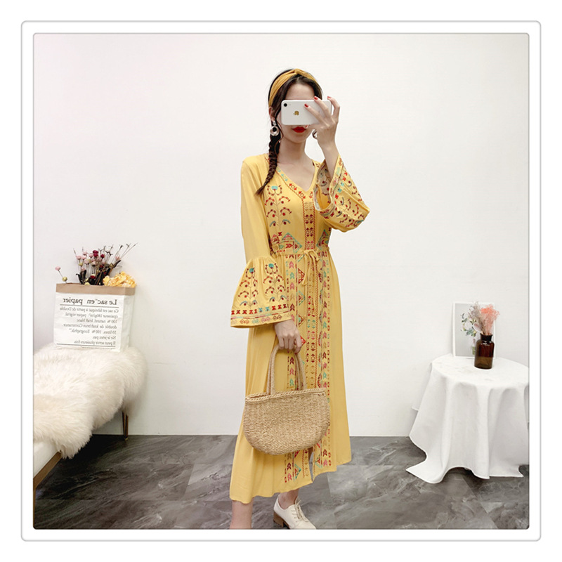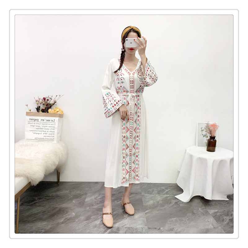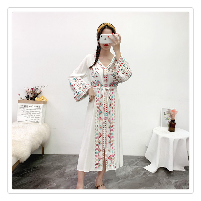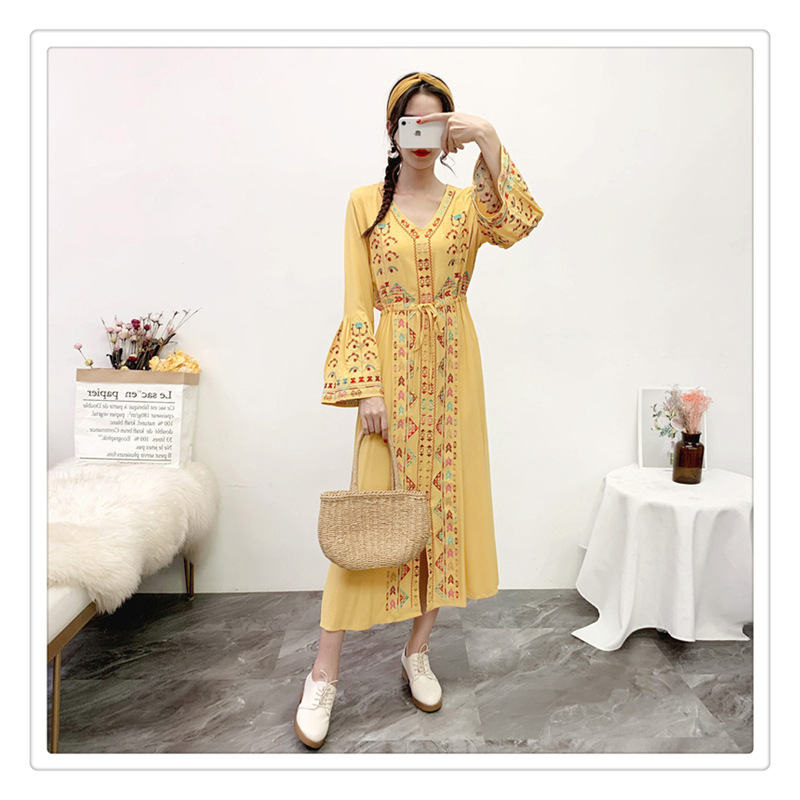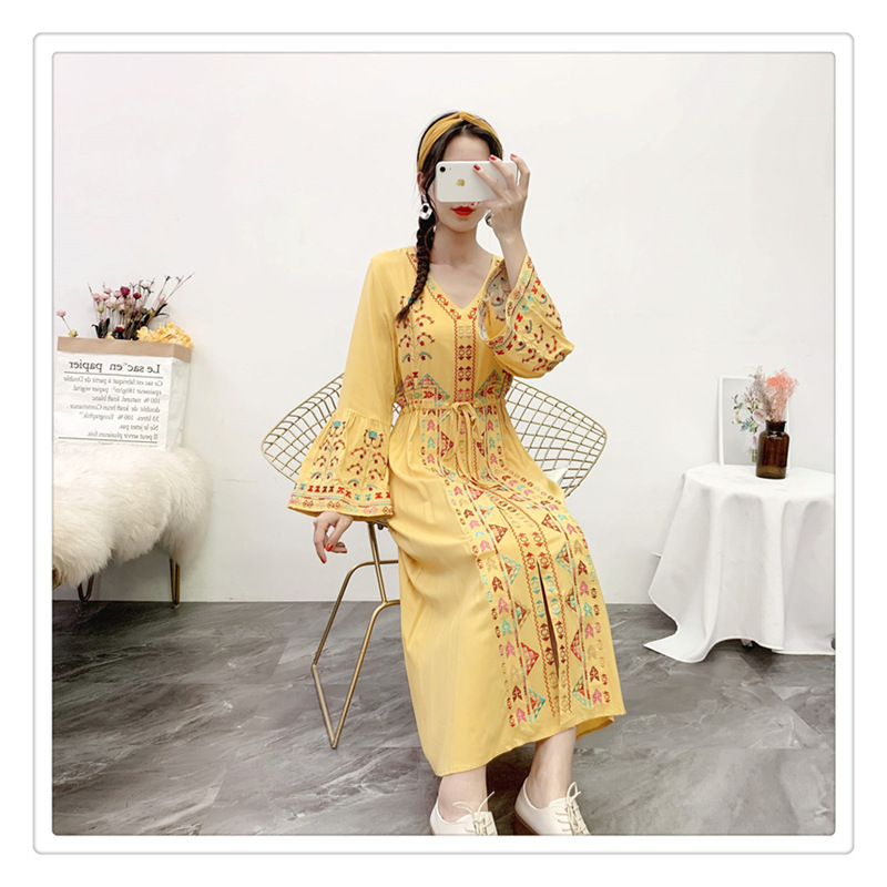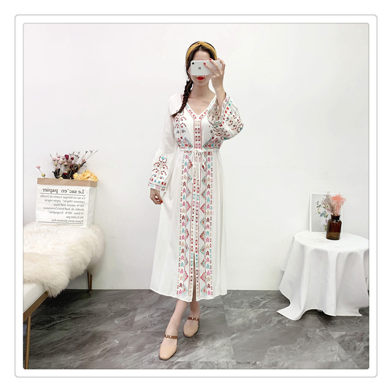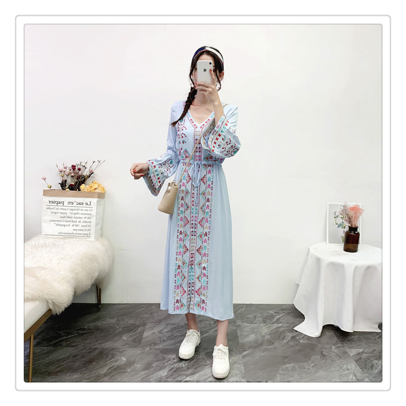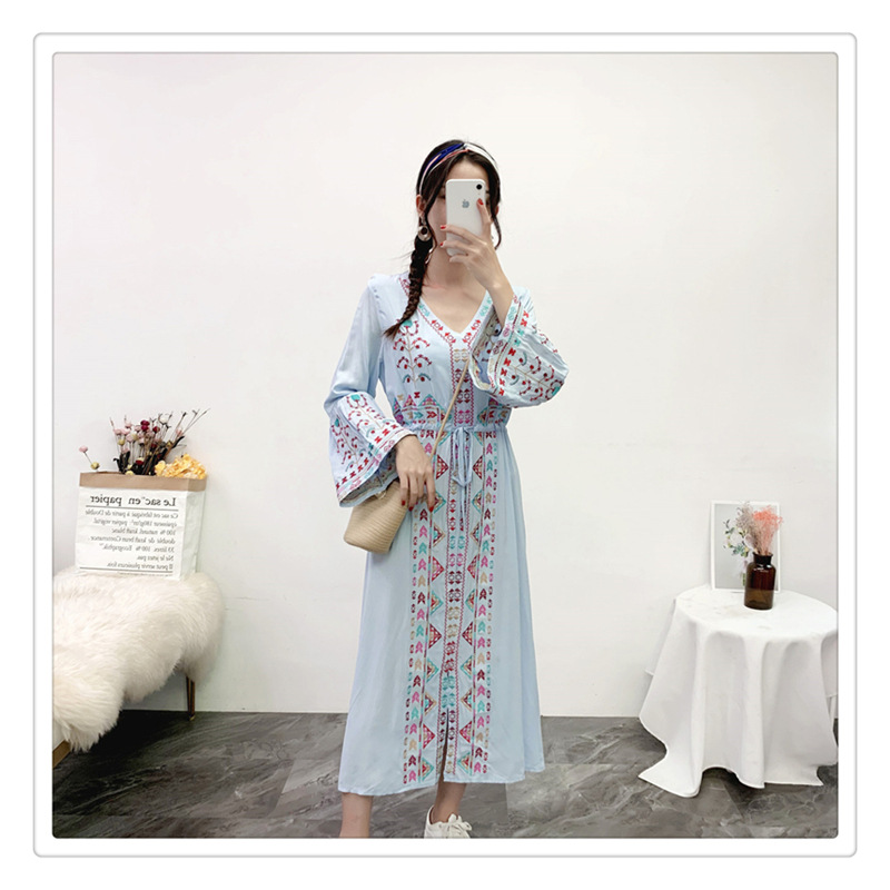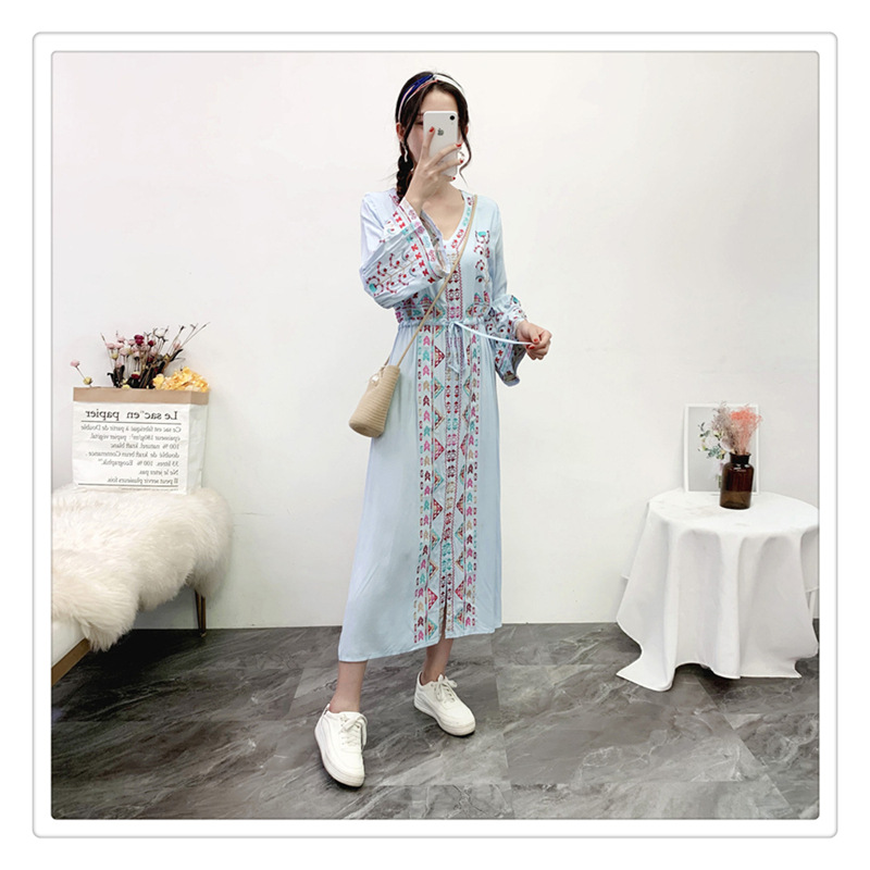 9604 여름 새로운 스타일 타이 홀리데이 비치 긴 원피스 여성의 보헤미안 민족 스타일 유럽과 미국 복고풍 자수 원피스