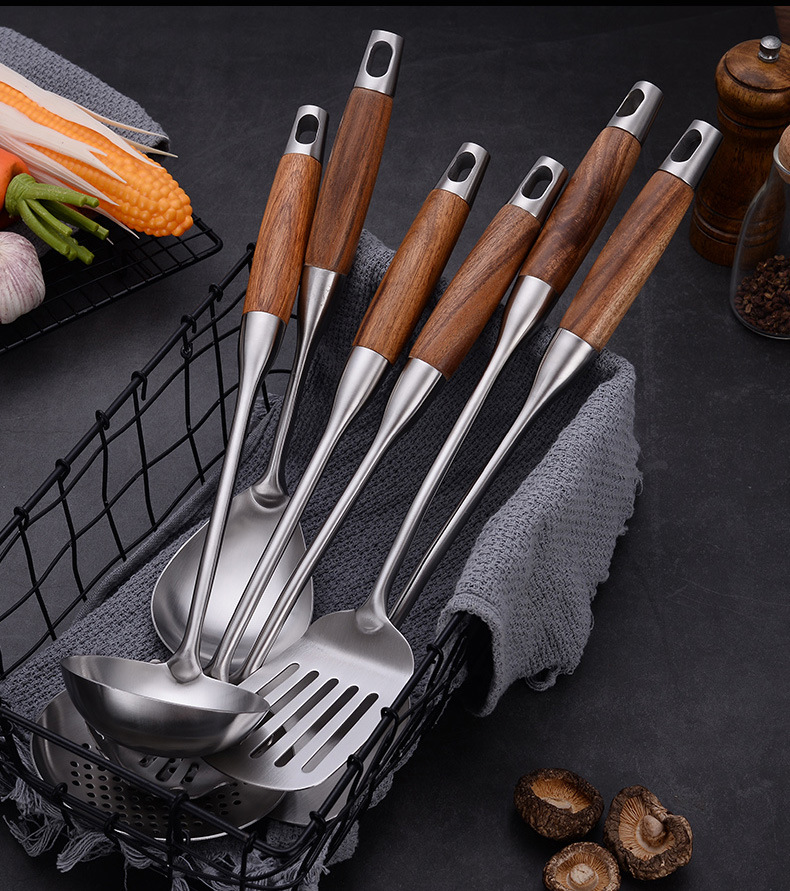 304 스테인레스 스틸 스푼 주걱 소쿠리 주방 용품 배 나무 손잡이 두꺼운 단열 요리사 요리 주걱 스푼