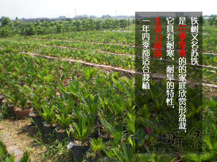 苏铁属常绿植物。茎干都比较粗壮,植株高度可以达到8m。花期在7~8月。雌雄异株,雄花在叶片的内侧,雌花则在茎的顶部。喜强烈的阳光、温暖湿润的环境。要求肥沃、沙质、微酸性、有良好通透性的土壤。耐寒性较差,多是栽种在南方。