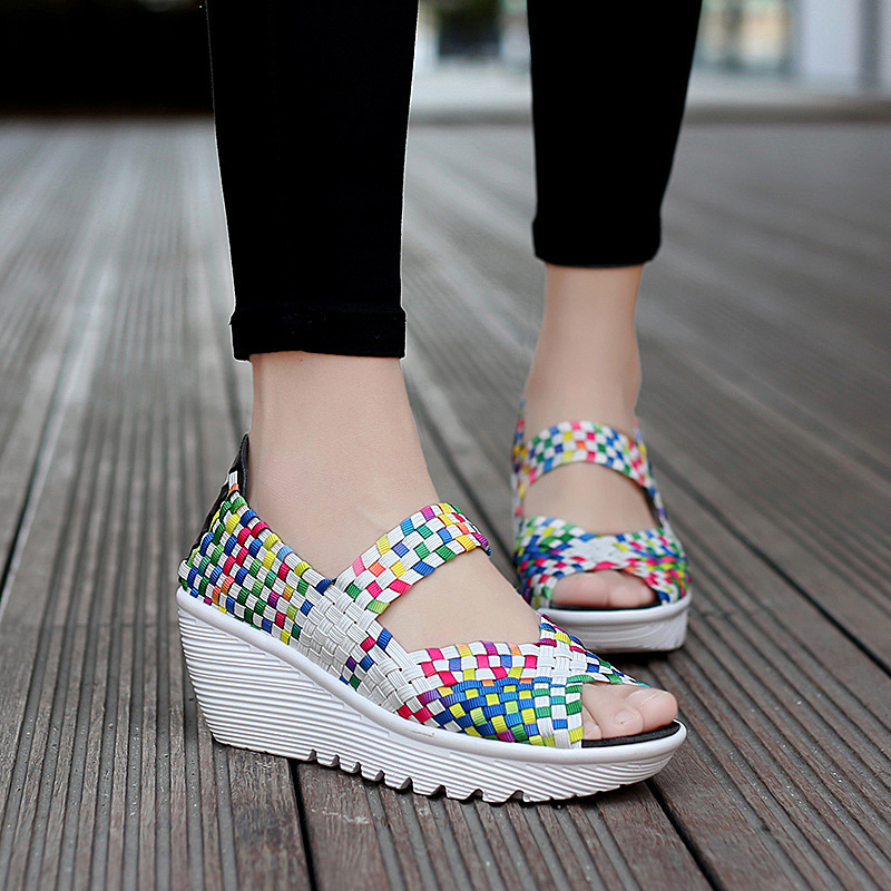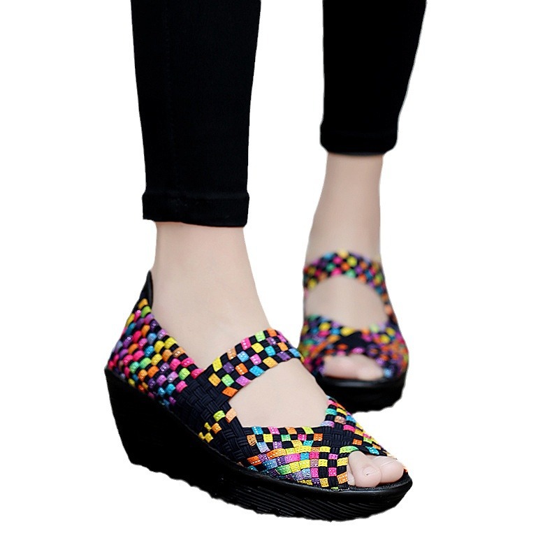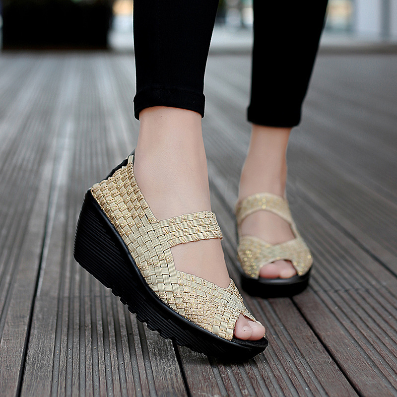 크로스 보더 플러스 사이즈 손으로 짠 신발 여성 신발 웨지 힐 두꺼운 밑창 캐주얼 한국 스타일 여성 엿봄 발가락 신발 중공 통기성