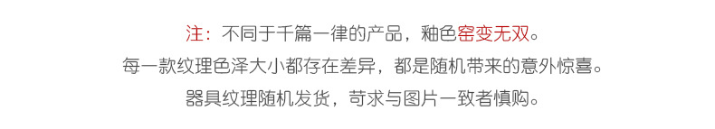 陶瓷杯子为批量手工制作,窑变釉尤其受温度湿度影响较大,批次不同颜色花色都会有所差异,无法避免!!介意者慎拍!