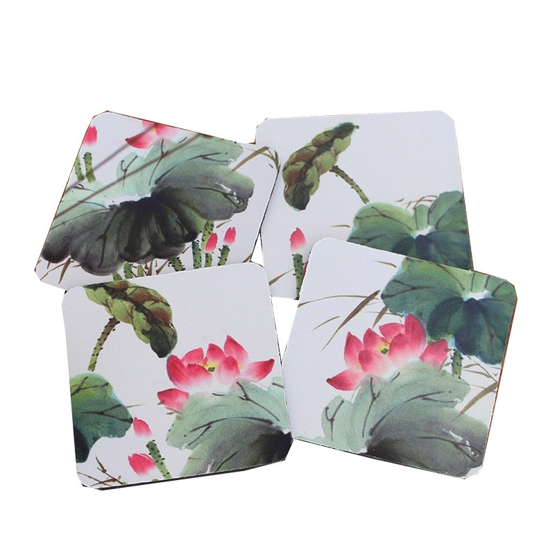 中纤板杯垫:3mm中纤板+1mm软木+铜版纸印刷过光胶+油边,价格是杯垫里较高的材质,厚度是4mm,平滑好,硬度好好,多为景物杯垫,优雅大方,除了作杯垫隔热用途,更可作为家居摆设,看似简单的杯垫,也需经过进料、制刀板、开料、打磨、制版、印刷等复杂的工艺才能完成。在刀板的制作上,我们使用了精度0.005毫米的FANUC高精数控铣床,保证产品的圆度;圆角打磨先由机械完成大形,后由手工完成细部;