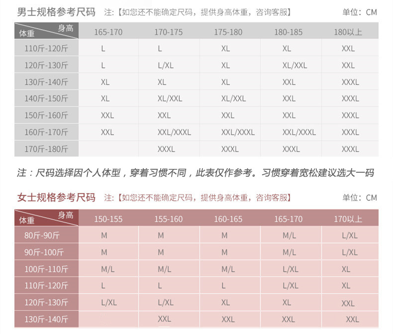 女:160/85-M,165/90-L,170/95-XL, 175/100-XXL