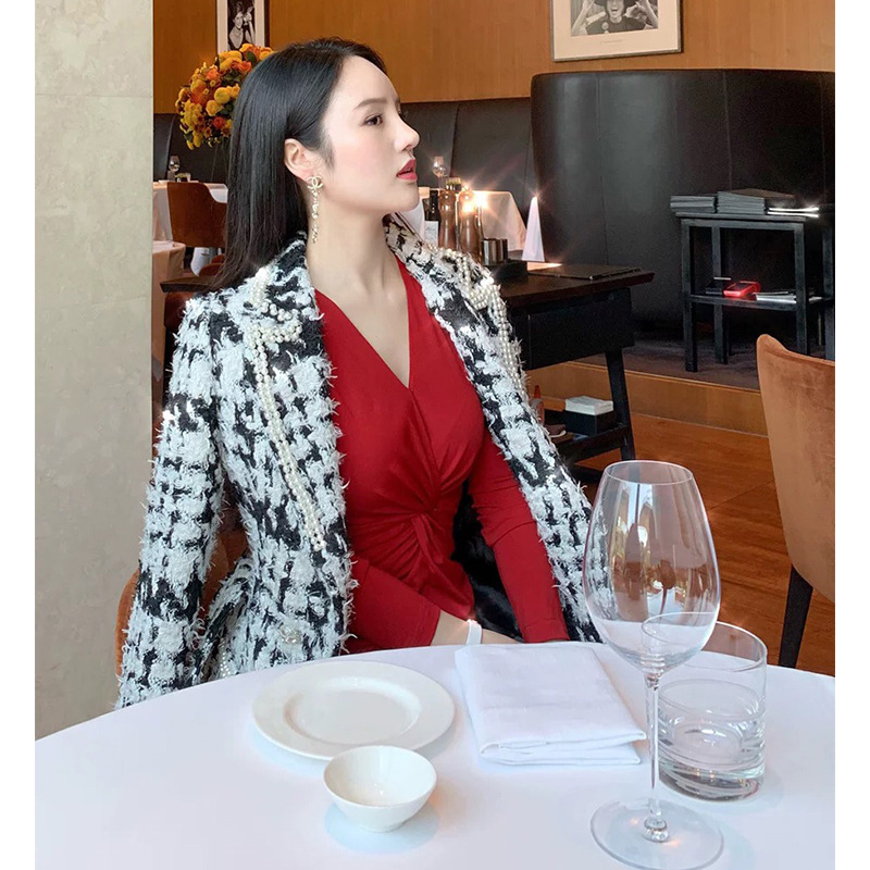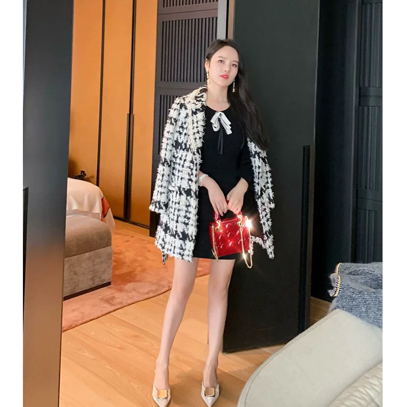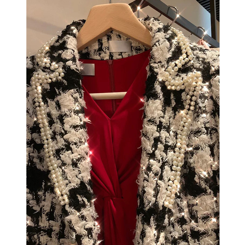 2020 가을과 겨울 새로운 중공업 수제 페르시 벨트 사교계 기질 흑백 격자 대비 색 긴 울 코트