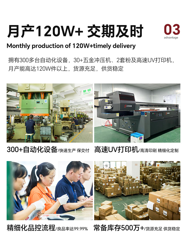 각 제품은 색상 상자, 5개 제품/내부 상자, 20개 제품/외부 상자에 포장됩니다.