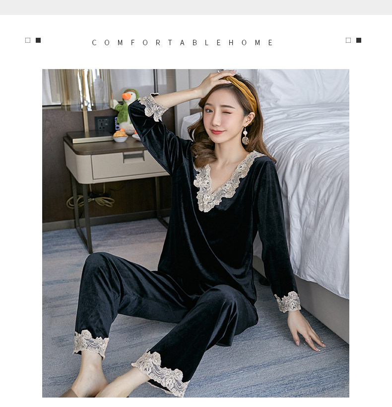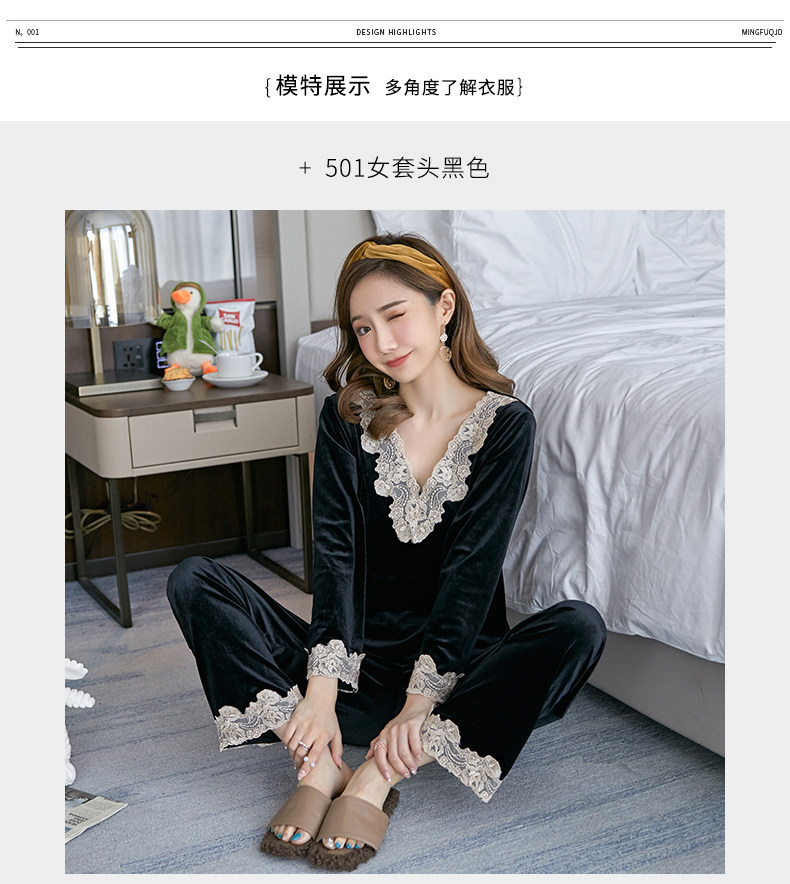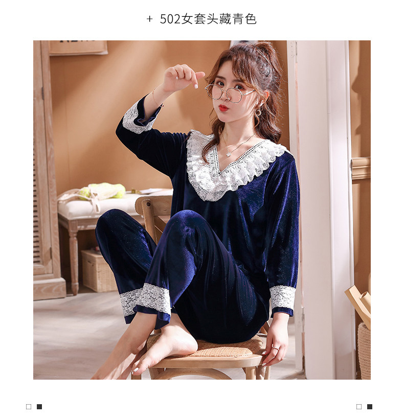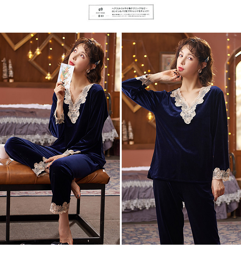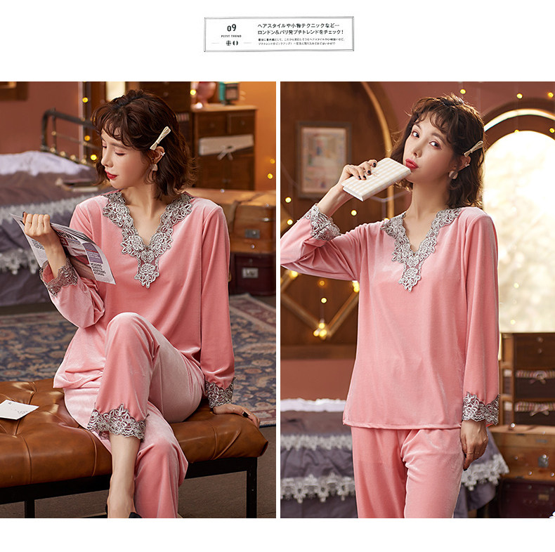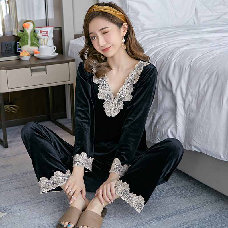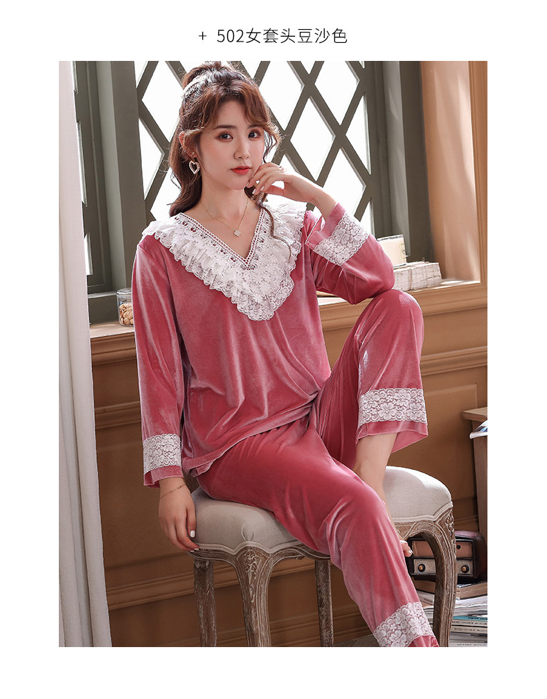 가을과 겨울 여성의 골드 벨벳 잠옷 긴팔 한국 얇은 풀오버 레이스 산호 벨벳 홈 의류 세트 플러스 사이즈