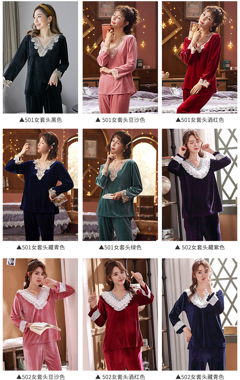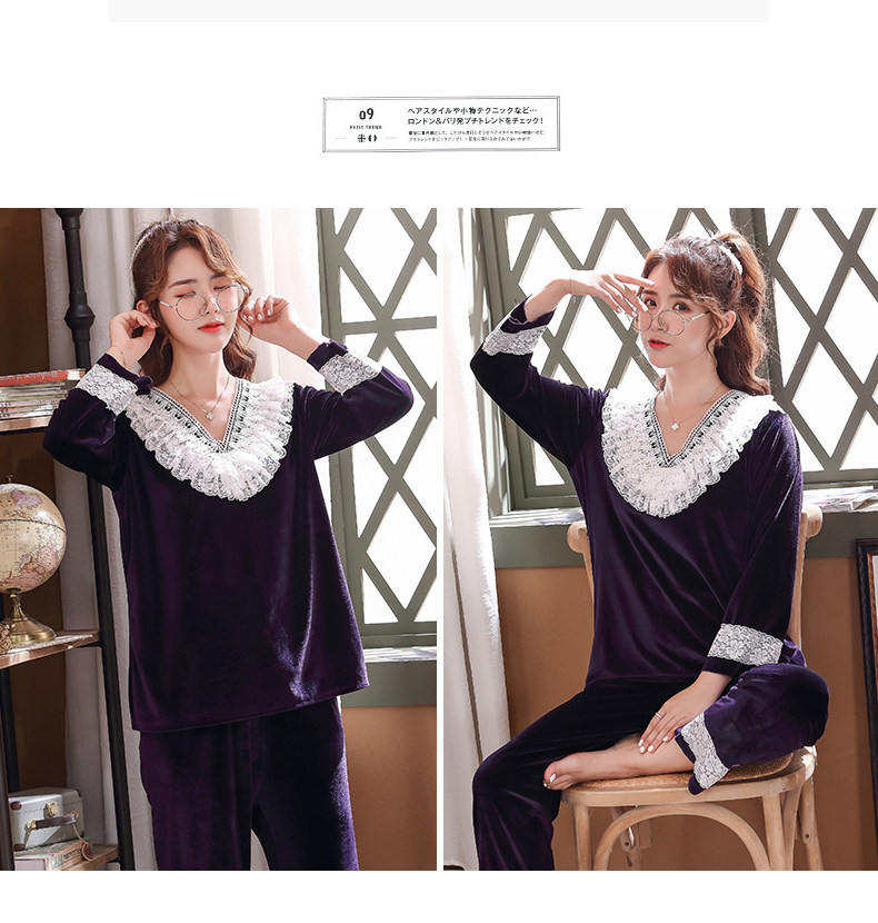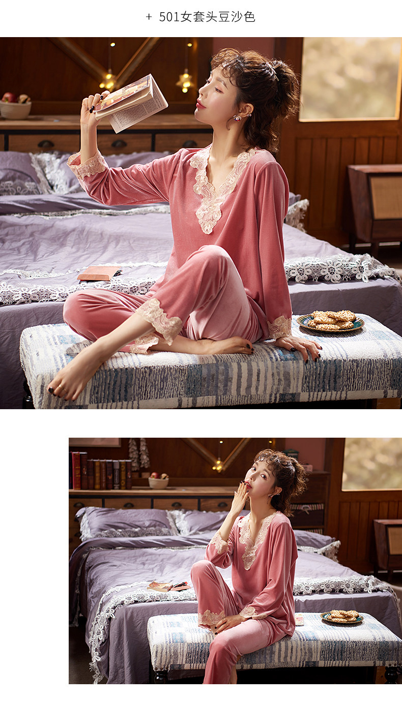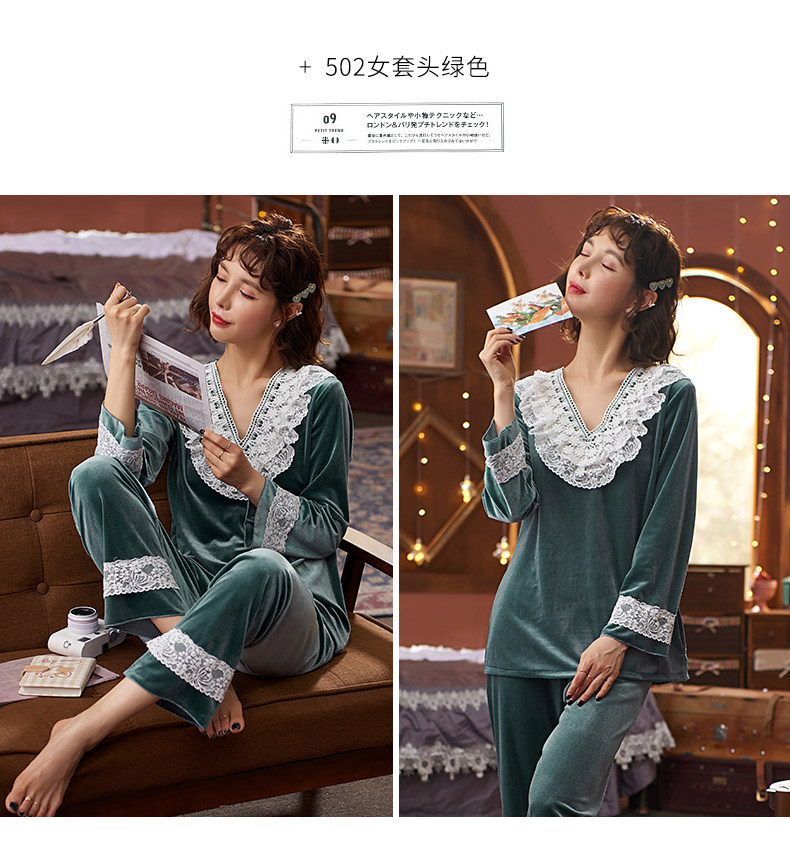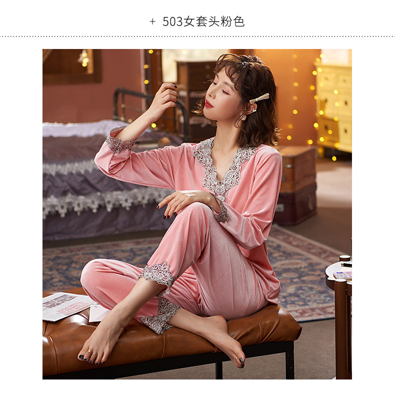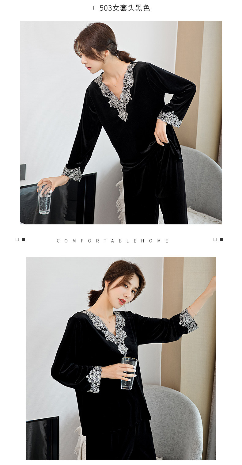 가을과 겨울 여성의 골드 벨벳 잠옷 긴팔 한국 얇은 풀오버 레이스 산호 벨벳 홈 의류 세트 플러스 사이즈