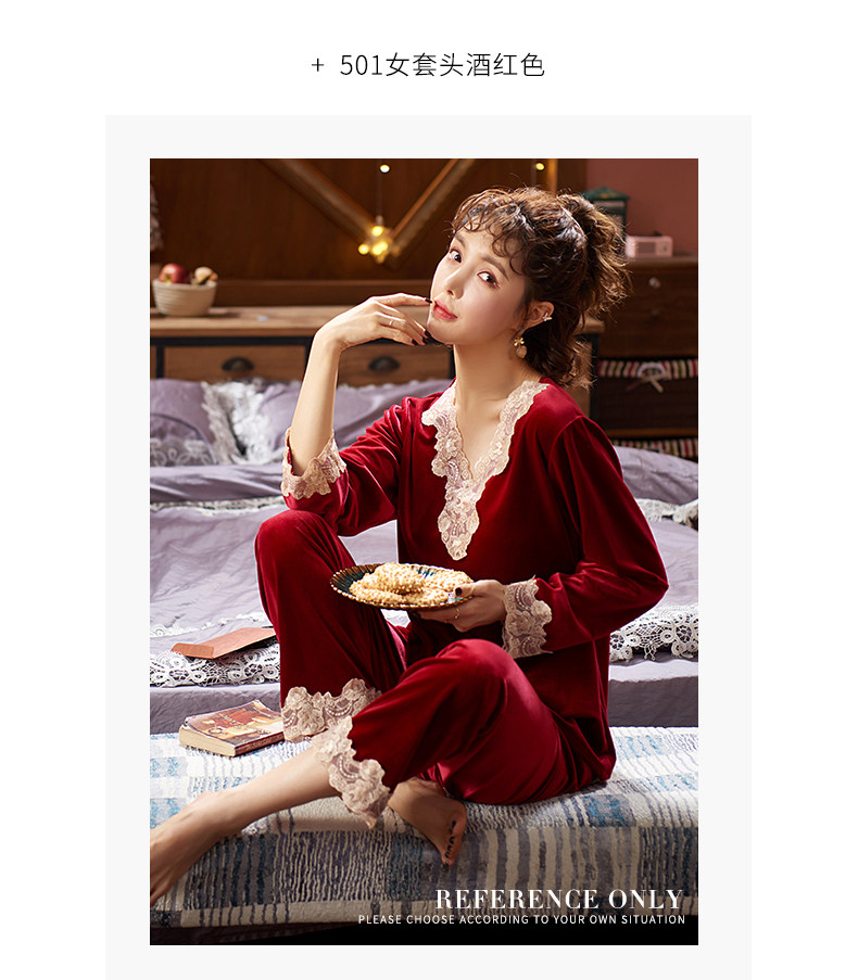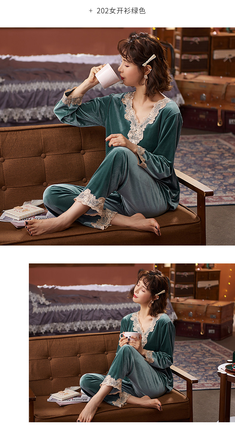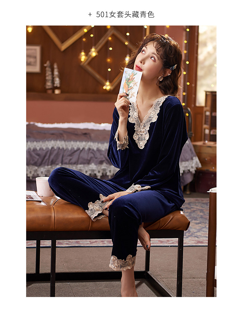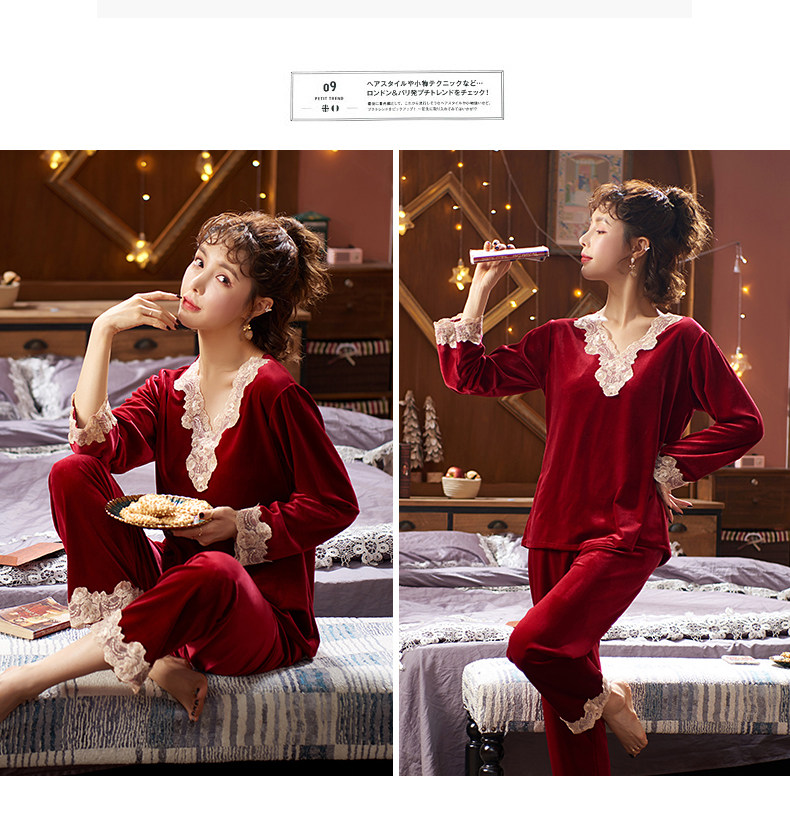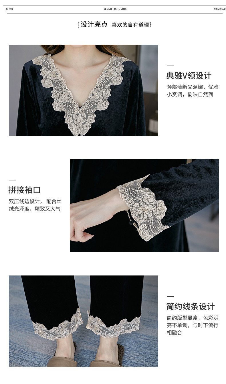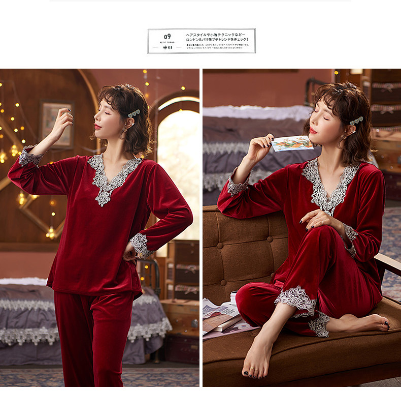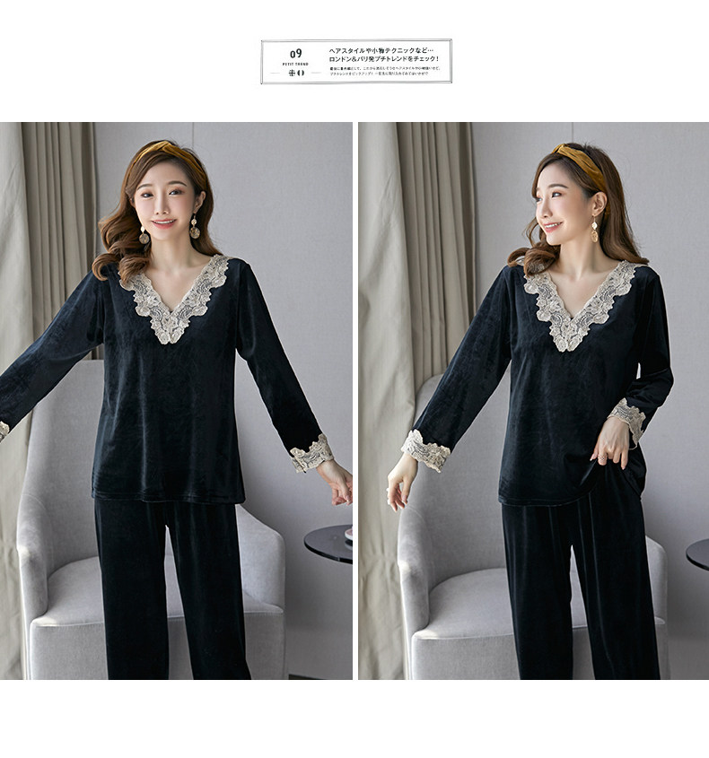 가을과 겨울 여성의 골드 벨벳 잠옷 긴팔 한국 얇은 풀오버 레이스 산호 벨벳 홈 의류 세트 플러스 사이즈