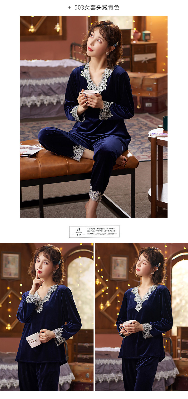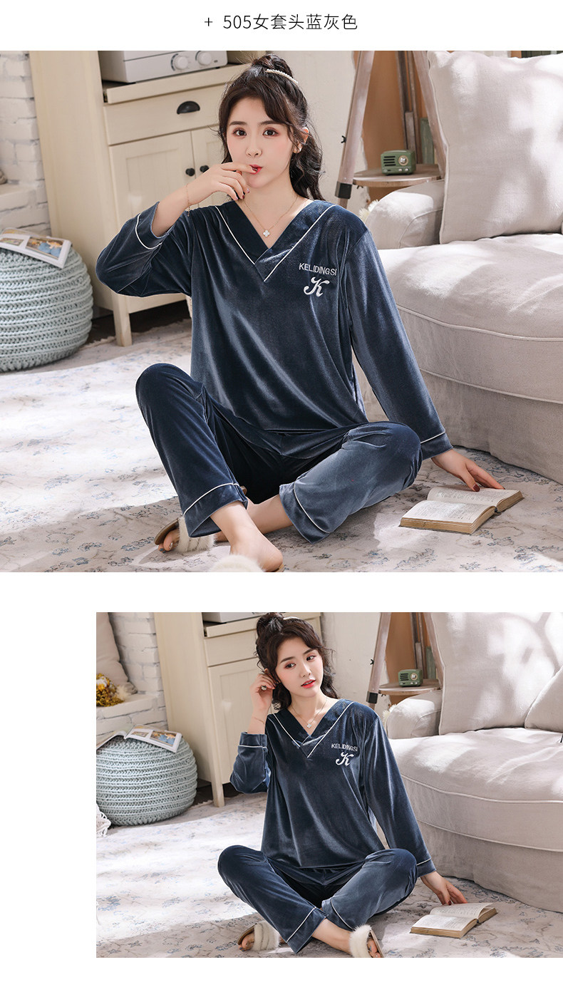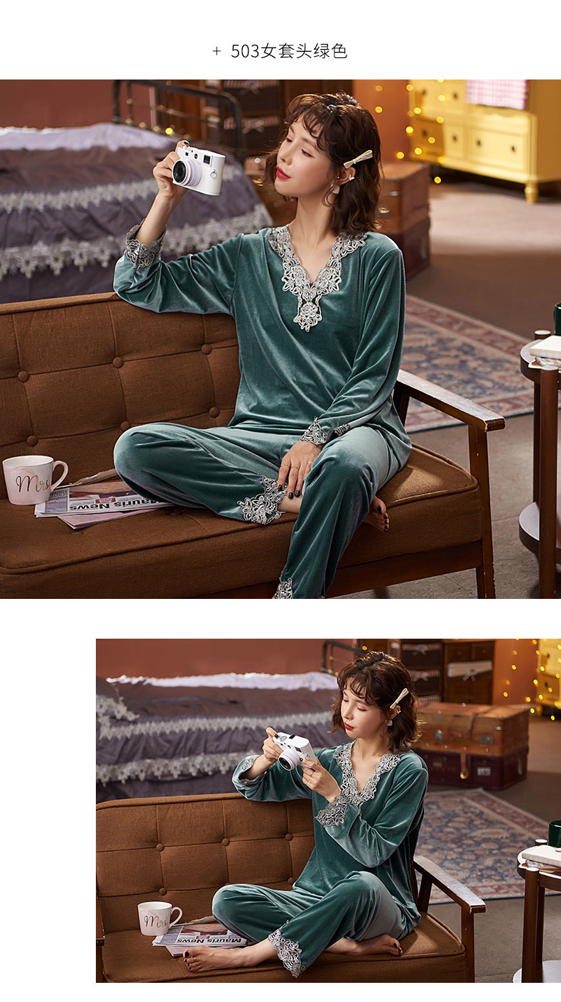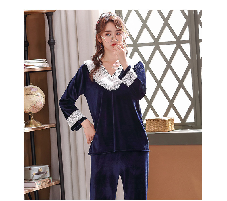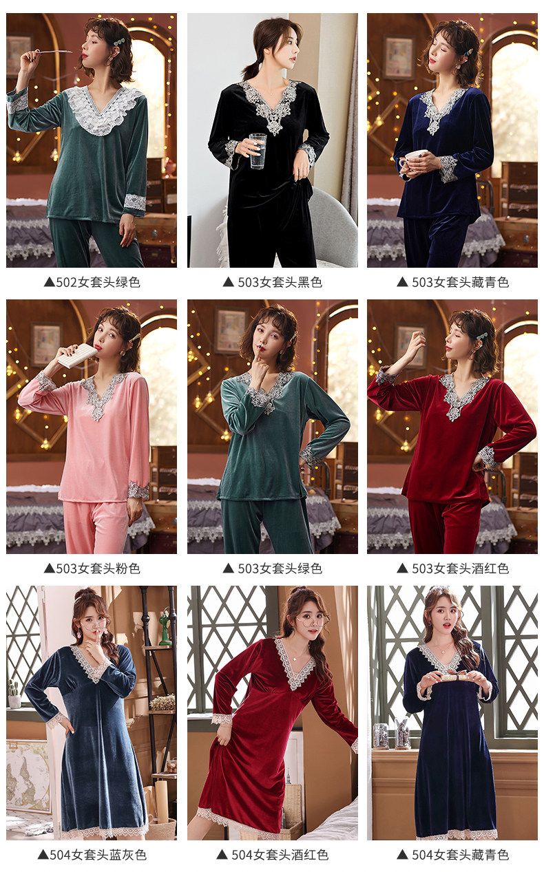 가을과 겨울 여성의 골드 벨벳 잠옷 긴팔 한국 얇은 풀오버 레이스 산호 벨벳 홈 의류 세트 플러스 사이즈