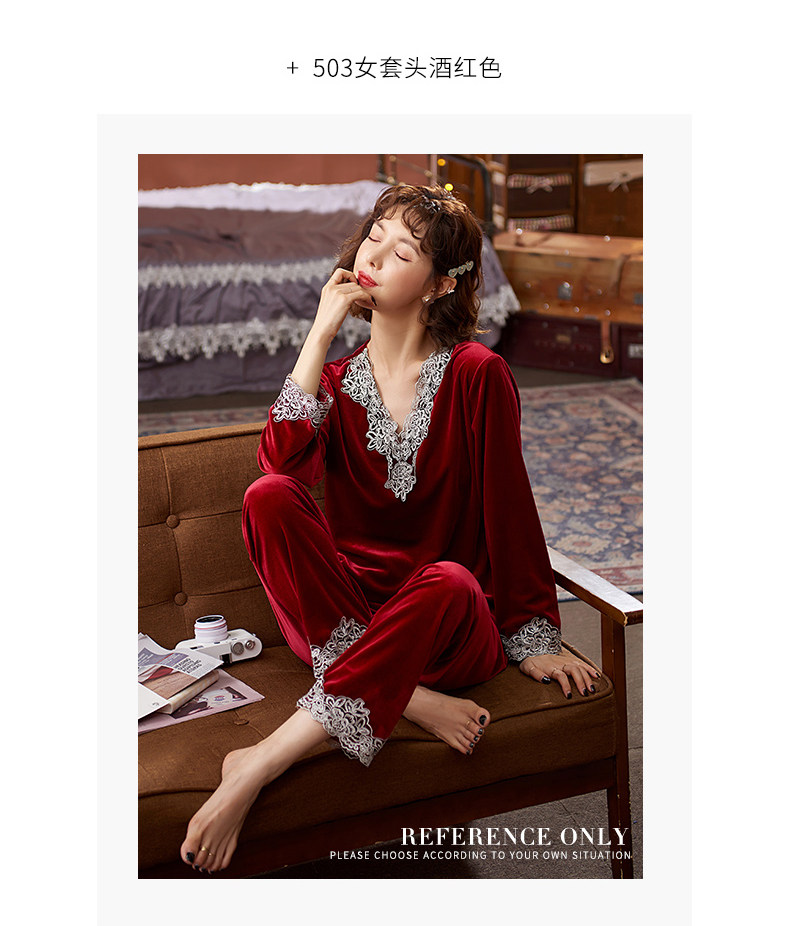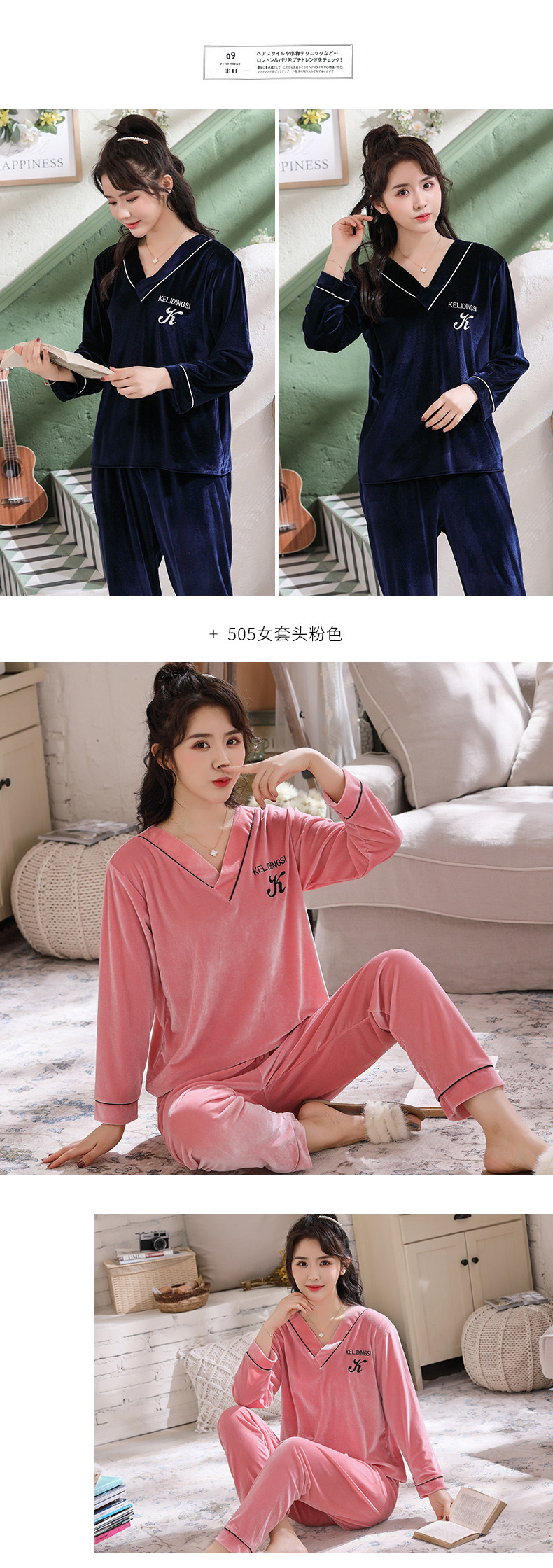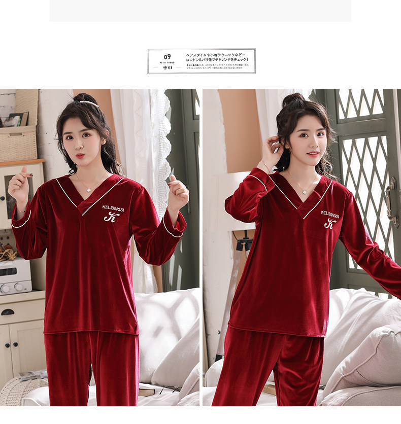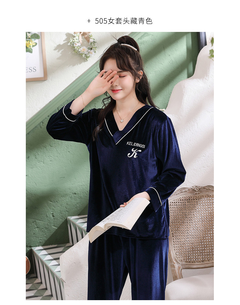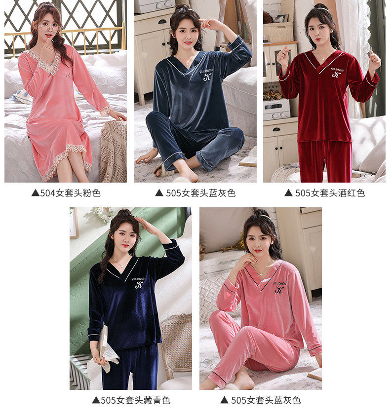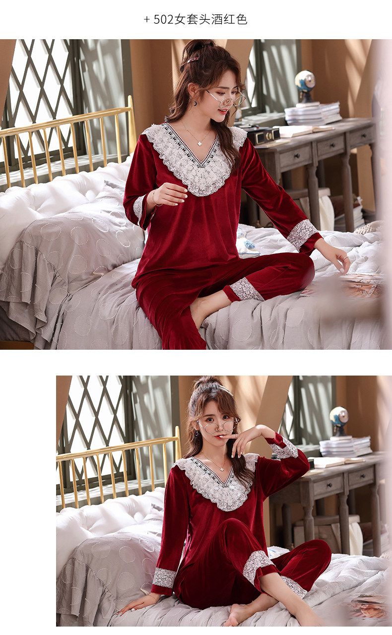가을과 겨울 여성의 골드 벨벳 잠옷 긴팔 한국 얇은 풀오버 레이스 산호 벨벳 홈 의류 세트 플러스 사이즈