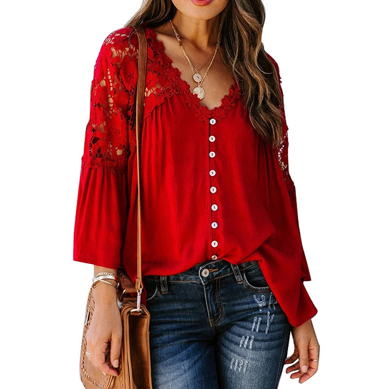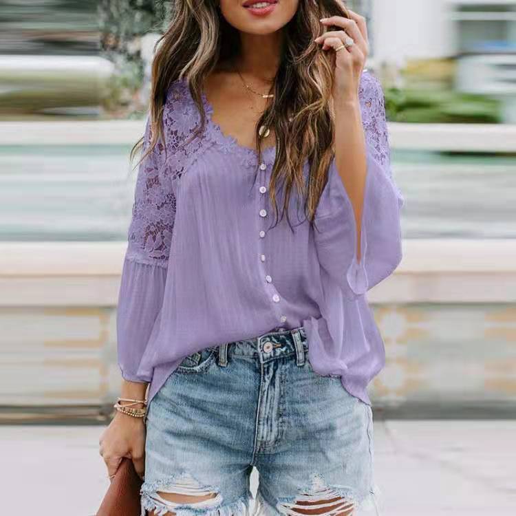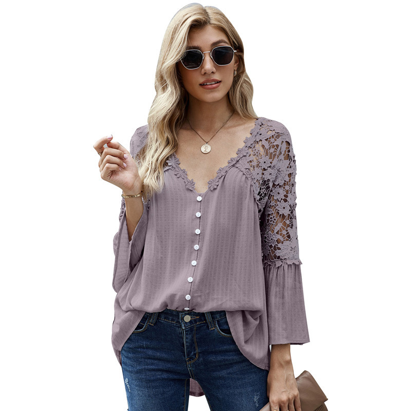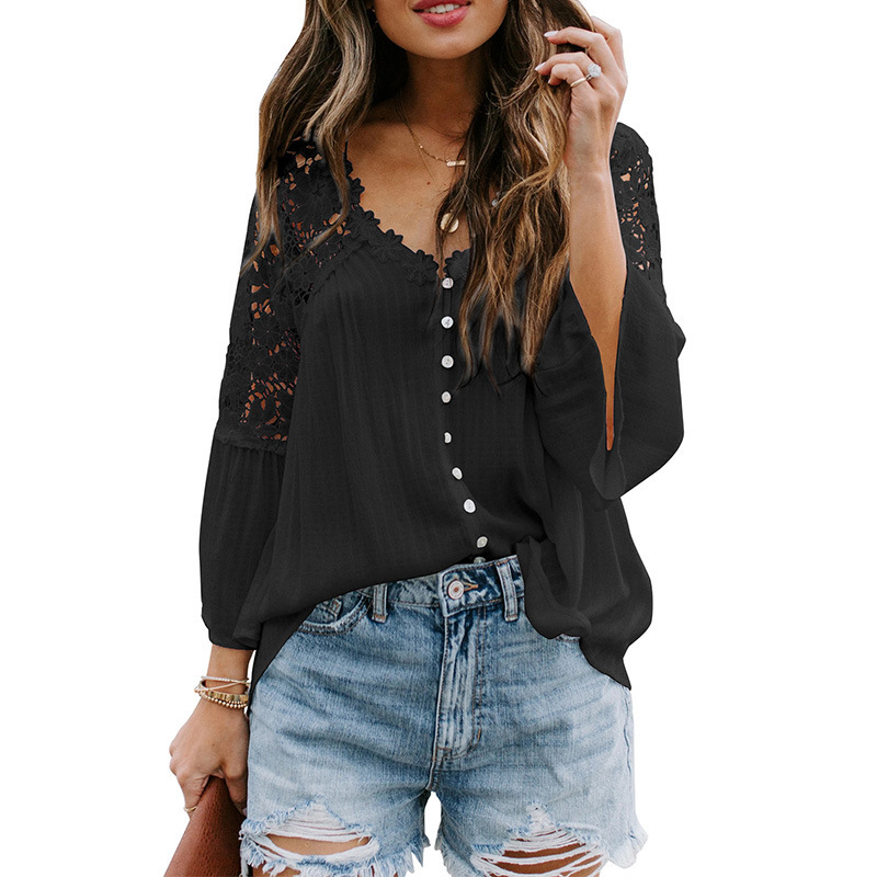 欧美跨境宽松大码蕾丝衫女长袖纯色深V套头雪纺衫厂家直销