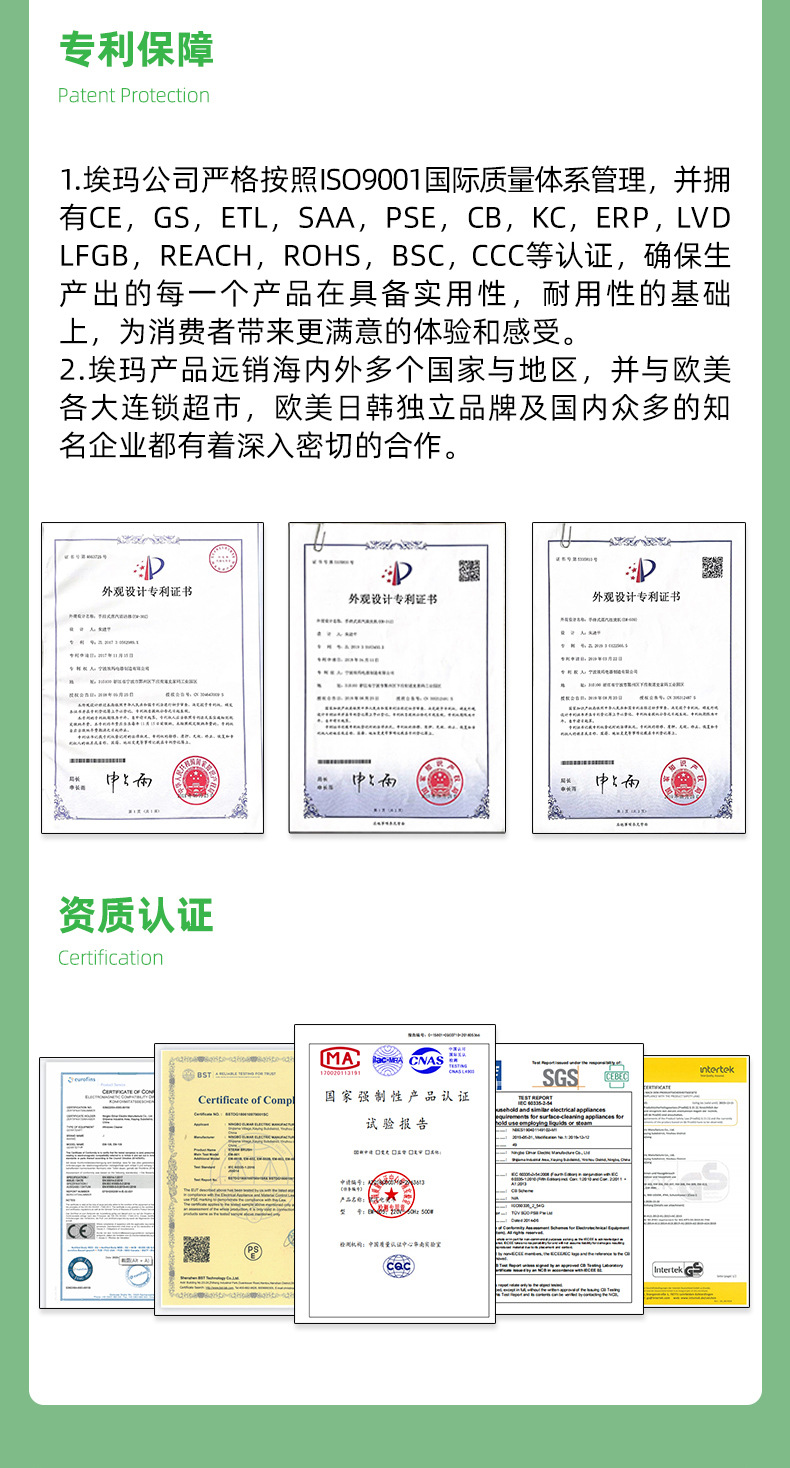 且都有CE、ROSH等相关检测认证证书。