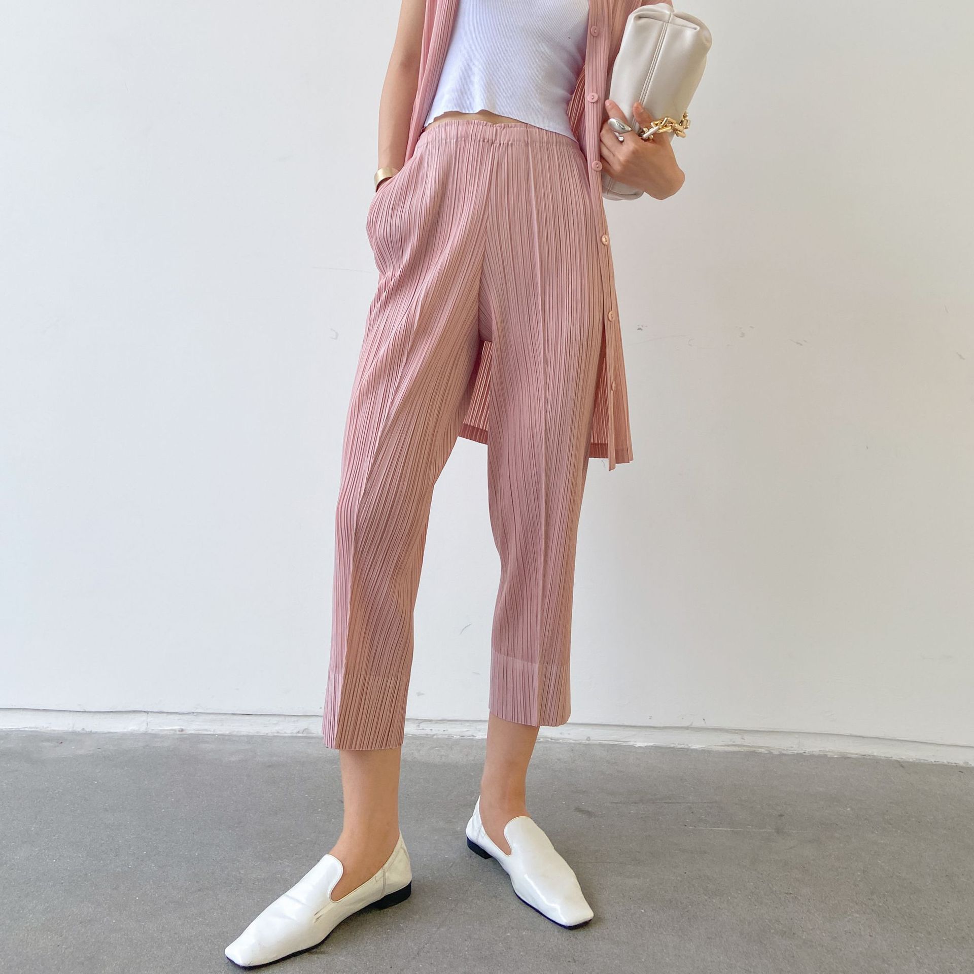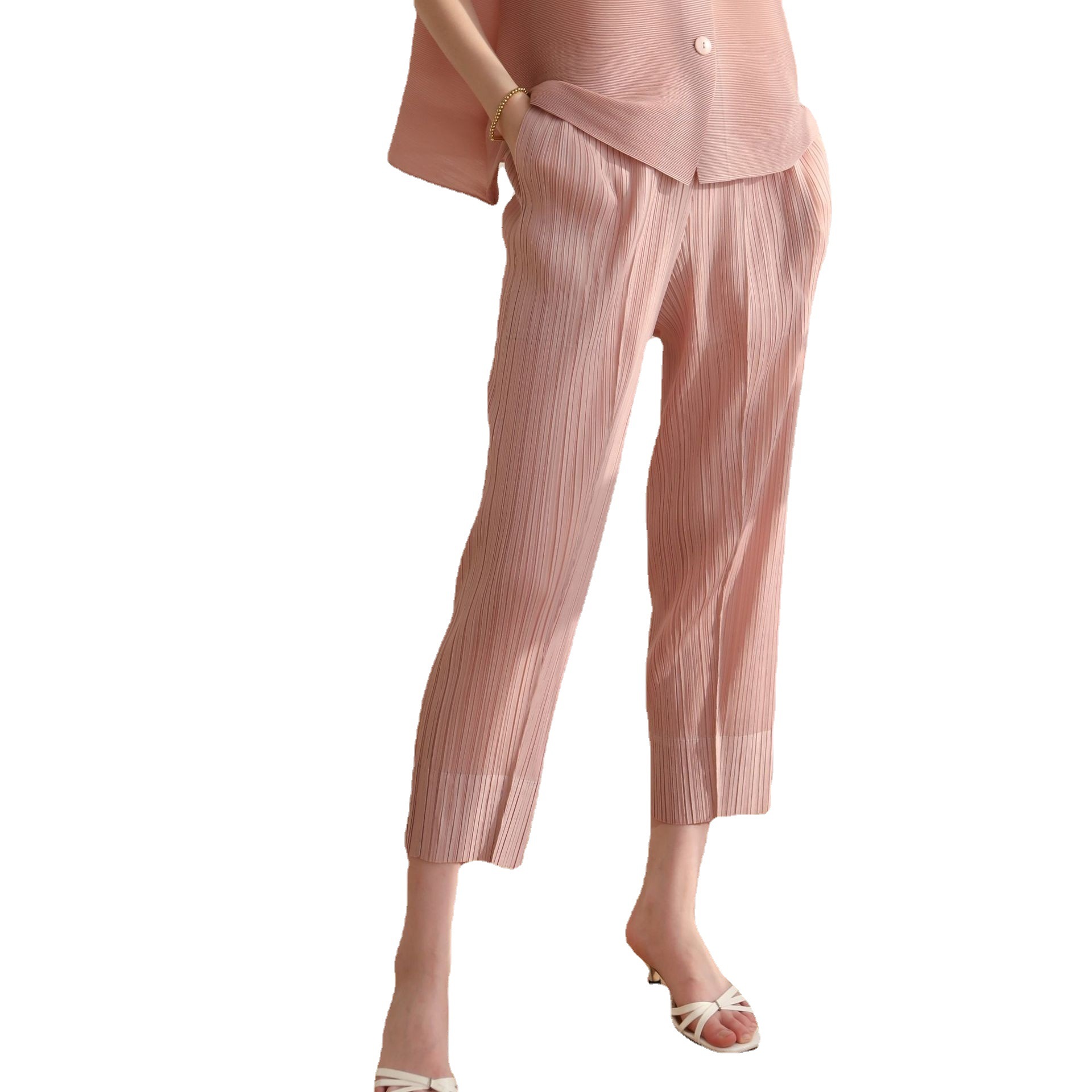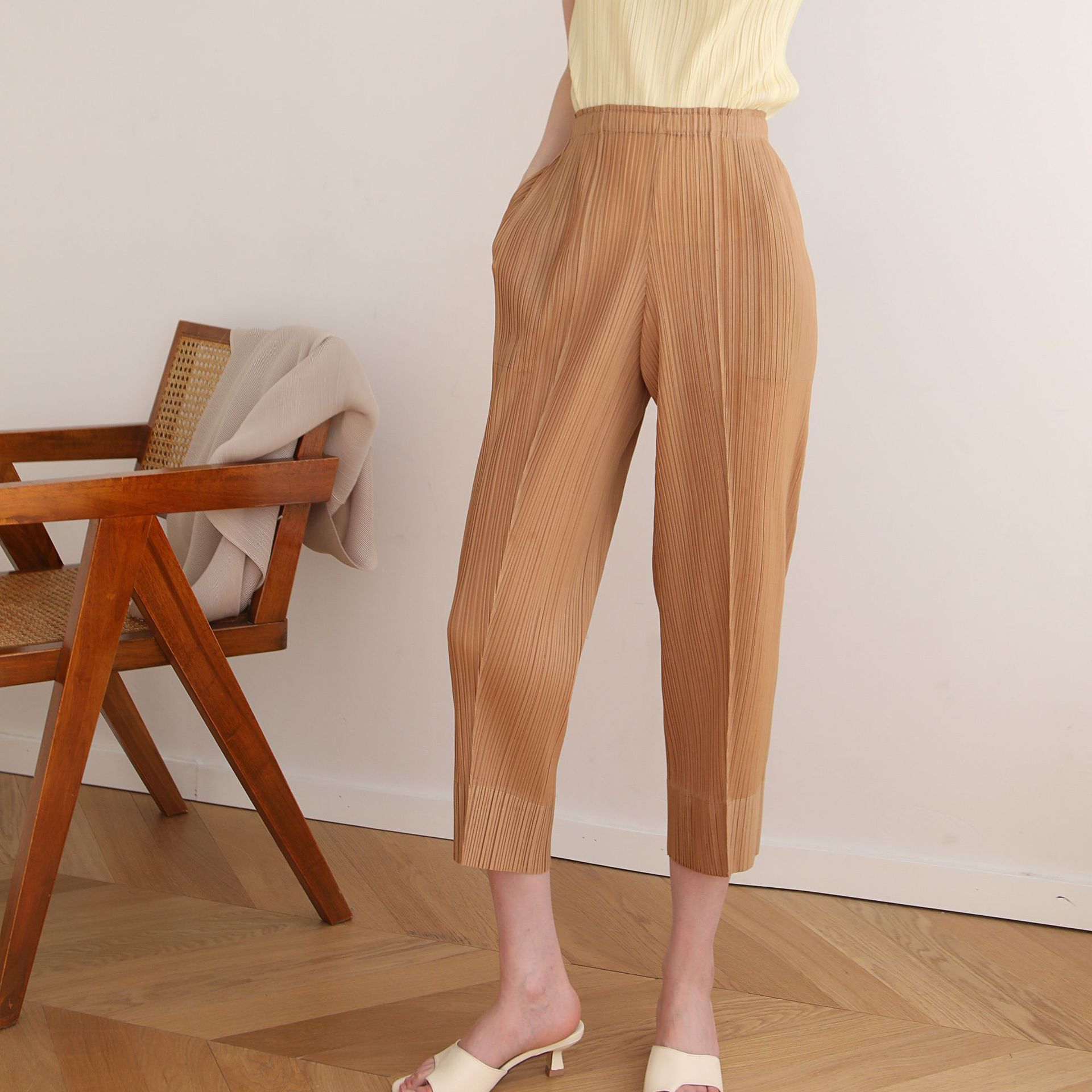 2024년 가을, 봄, 여름 3계절 착용 가능한 고급 주름 드레이프 신축성 있는 허리 다용도 캐주얼 스트레이트 팬츠 9부 팬츠