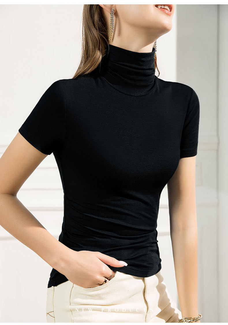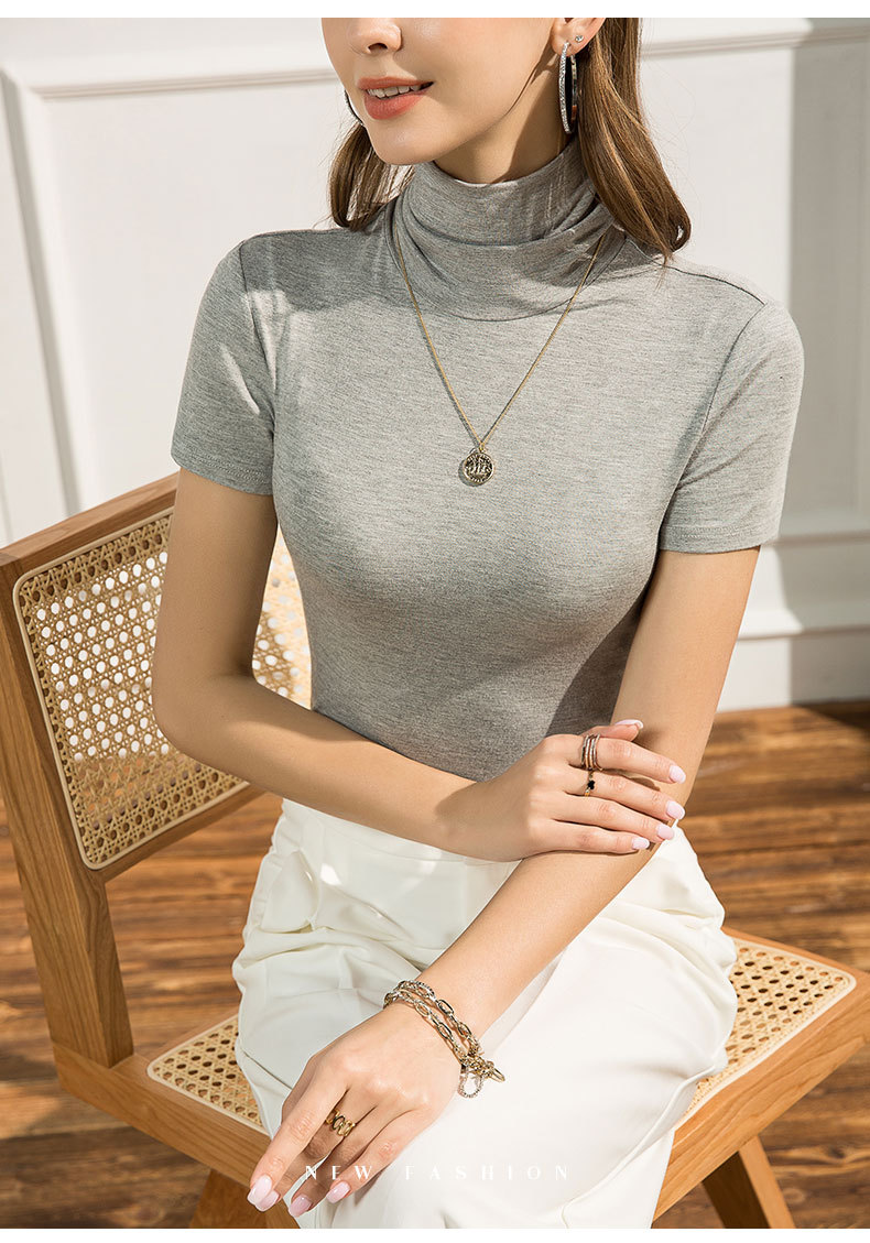 봄 새로운 스타일 파일 칼라 모달 반팔 티셔츠 여성 하이 넥 슬림 한국 스타일 솔리드 컬러 다목적 바닥 셔츠