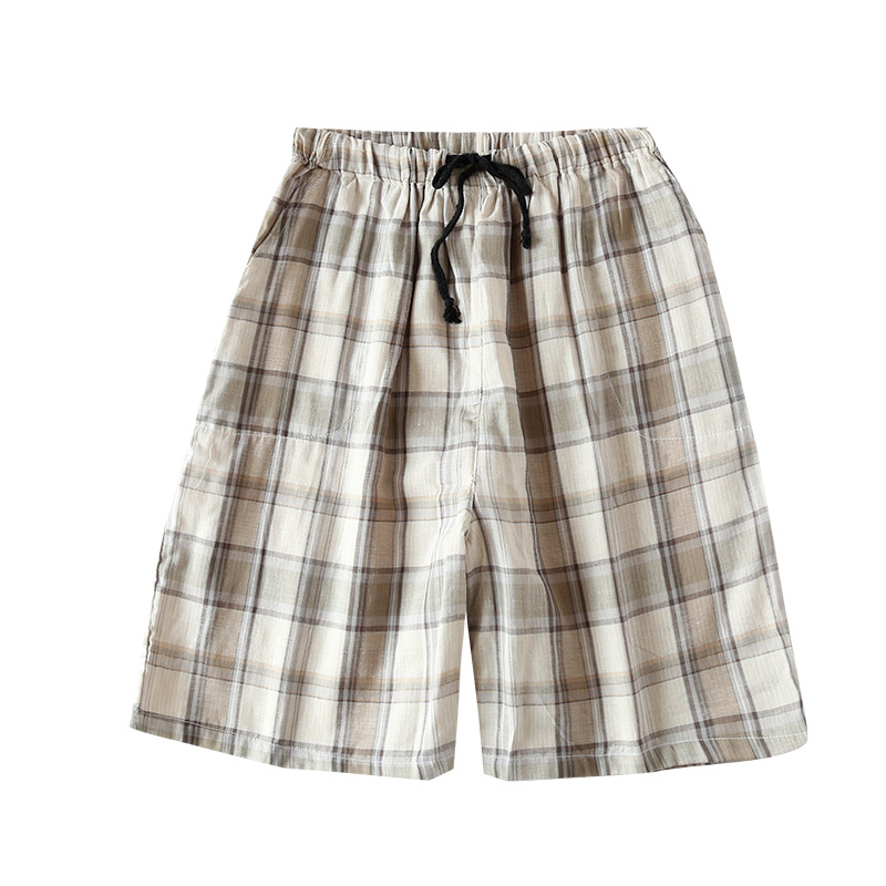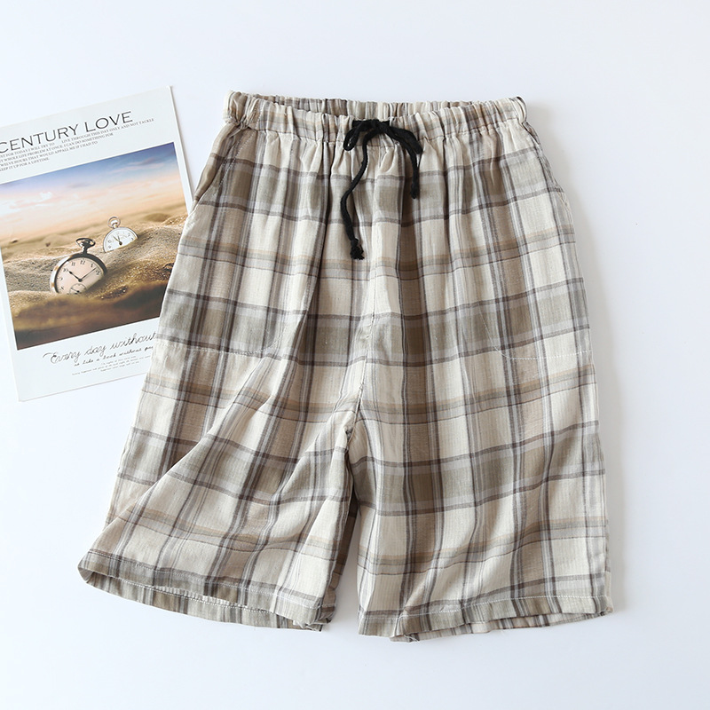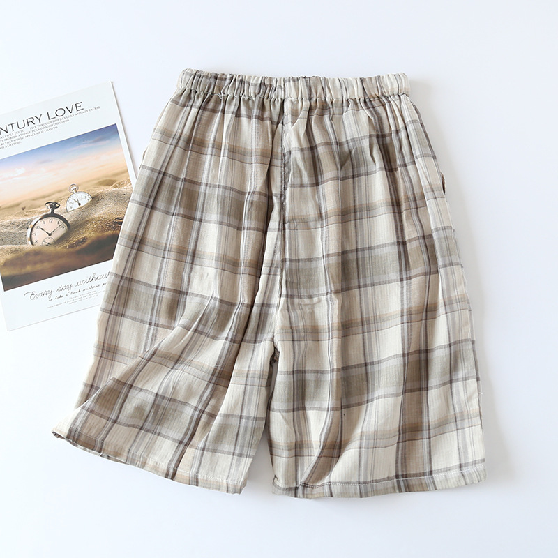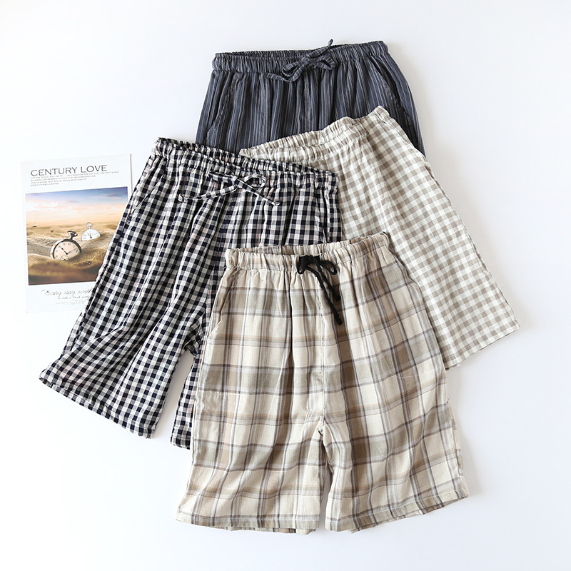 일본식 파자마 바지 남성용 반바지 여름 면 더블 레이어 거즈 면사 격자 무늬 홈 바지 홈 잠자는 얇은 대형 바지