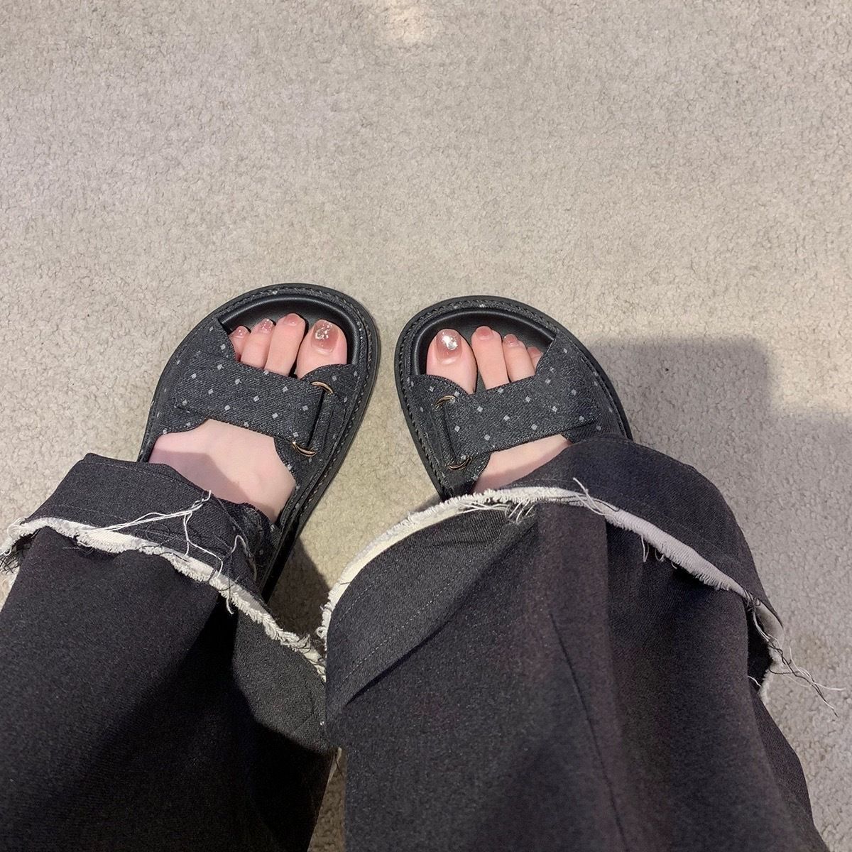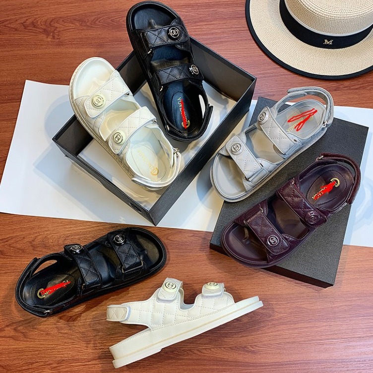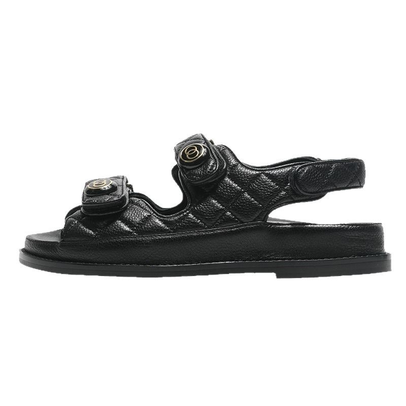 2025년 신상 여성 여름 샌들, 플랫, 샤넬 스타일, 벨크로, 다용도, 마름모 무늬, 부드러운 가죽, 두꺼운 밑창