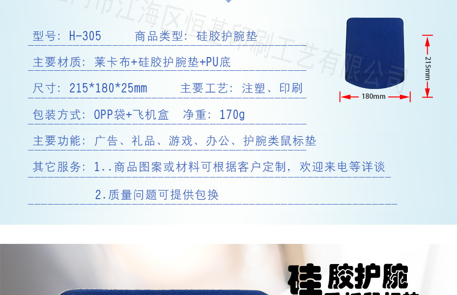 江门市恒基工艺品有限公司作为2008年新成立的一家集自主研发、生产与销售为一体的制造型企业,产品类别 以办公、IT配套产品及广告宣 传、商务礼品为主,注重质朴、简约、环保、积极倡导“以人为本,诚信经营, 质量保证”的企业理念,产品开发设计类别包括各类平面鼠标垫、键盘垫、护腕垫、护腕鼠标垫、防滑垫、桌垫\吧台垫、杯垫、 冰箱贴、广告扇及各类礼(赠)品等等,传达出本然质朴的文化价值。为了追求理想的产品,其产品从设计、寻找可靠 的材料、到手工制作及包装设计都用心斟酌并自主完成,充分考虑了人们的生活品位、方便实用的自然需求,并在经久 耐用的过程中见证主人的传奇人生。
