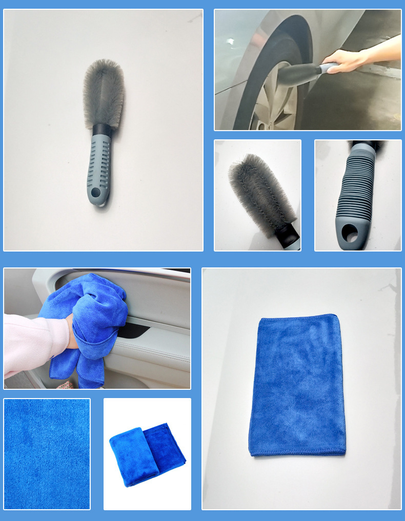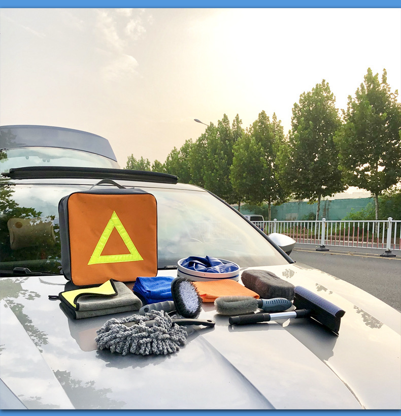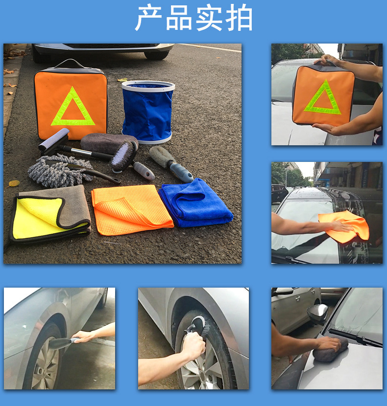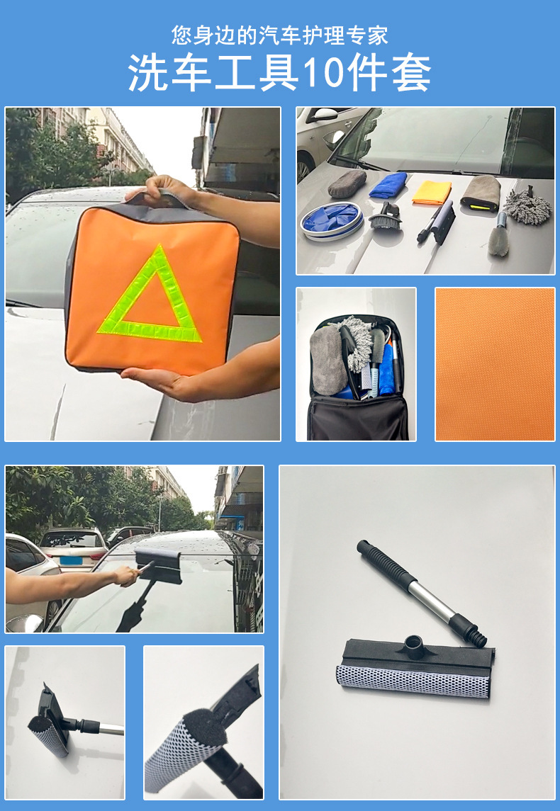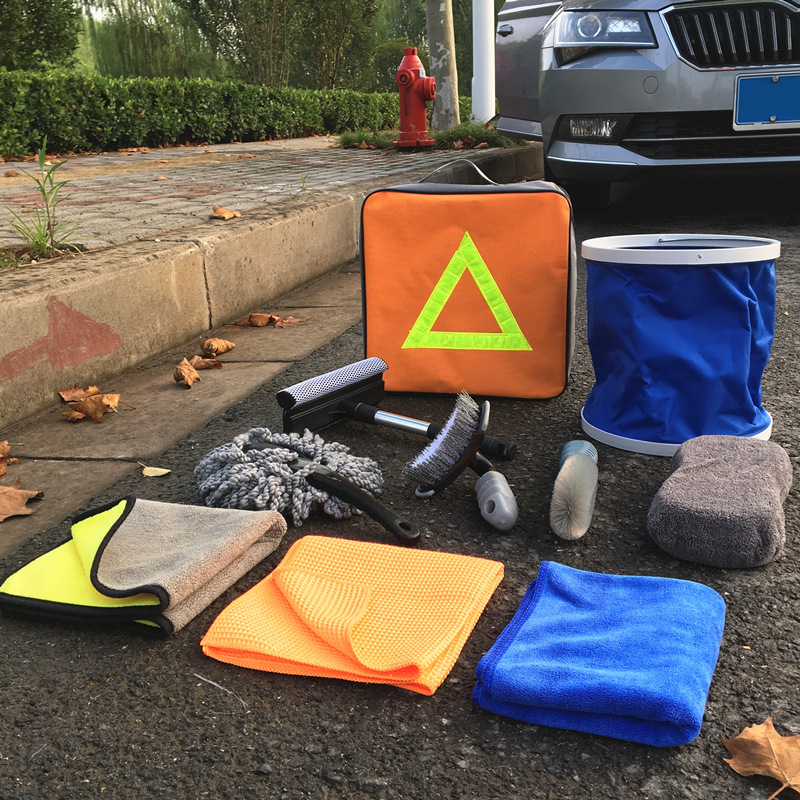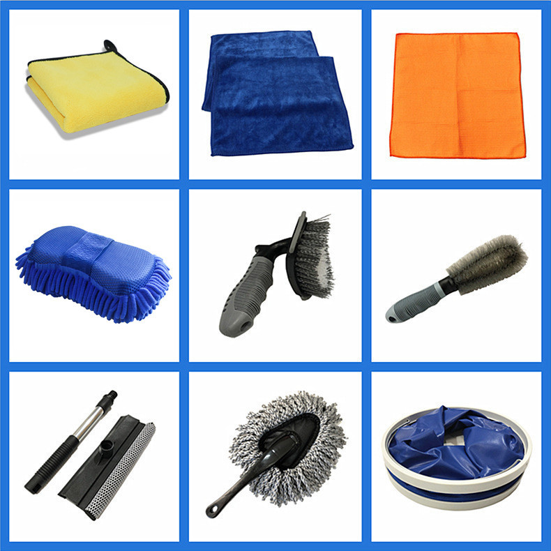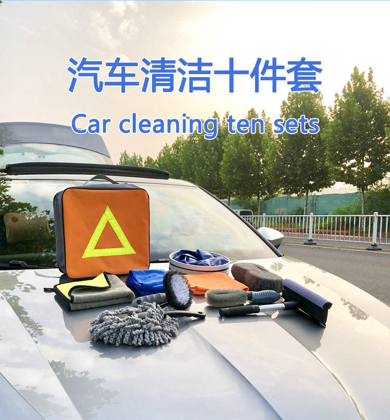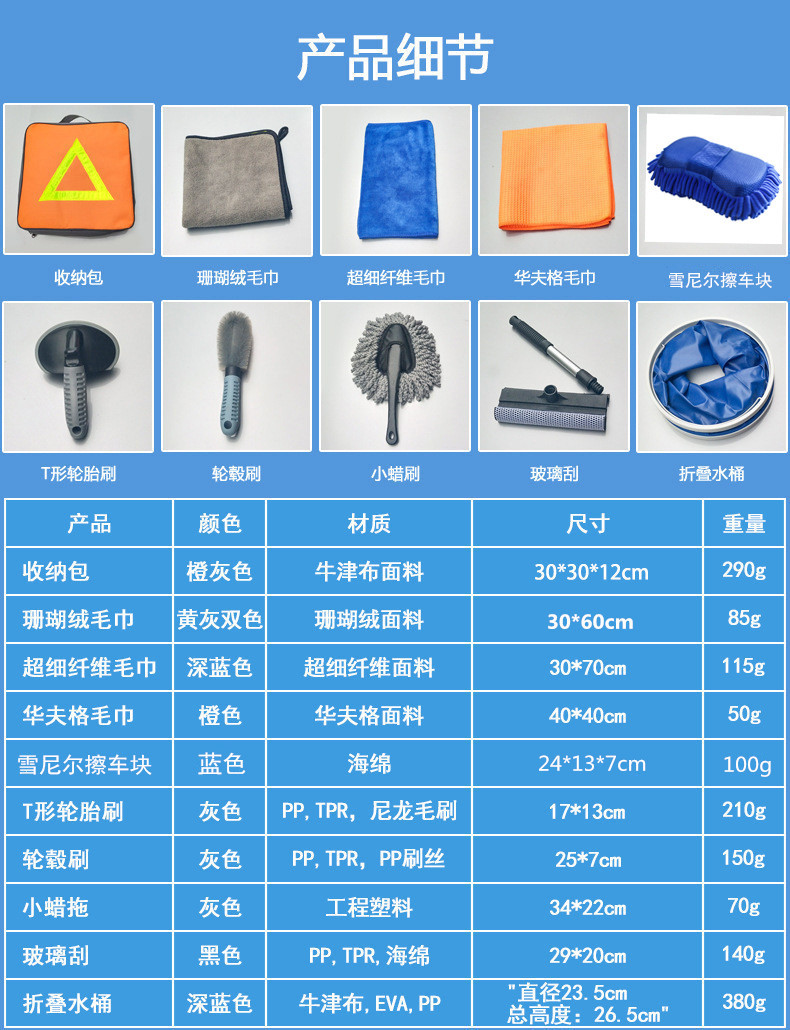 珊瑚绒毛巾+超细纤维毛巾+华夫格毛巾+雪尼尔擦车块+T形轮胎刷+轮毂刷+小蜡拖+玻璃刮+折叠水桶11L+收纳包包,共10款产品组成。