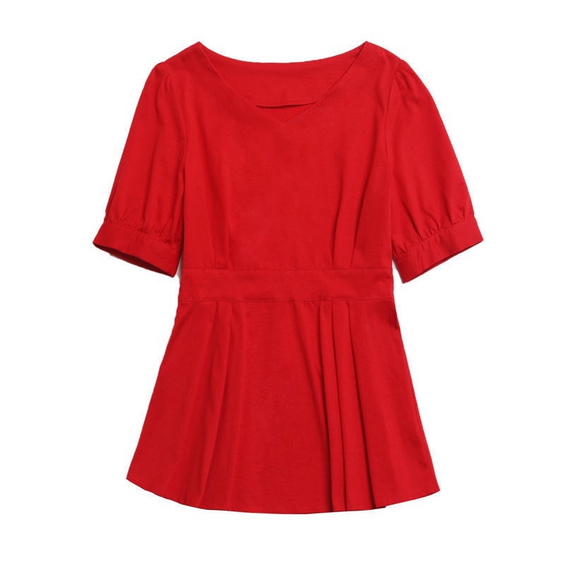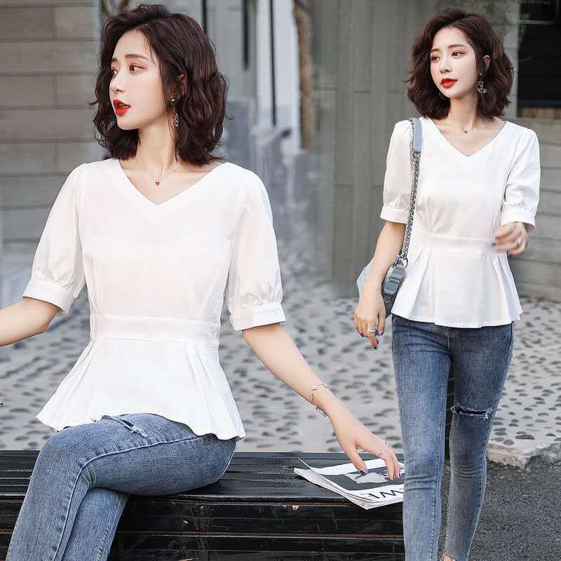 여성용 얇은 반팔 셔츠 2024 여름 루즈한 허리 지퍼 풀오버 화이트 셔츠 V넥 슬림핏
