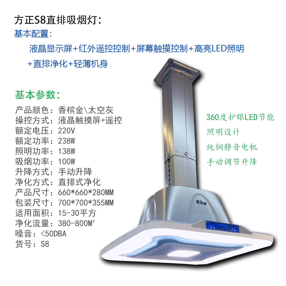 2、“内循环吸烟灯”使用遥控升降杆,升降杠的长度有以下四种:0.25米、0.8米、1.2米和2.0米。