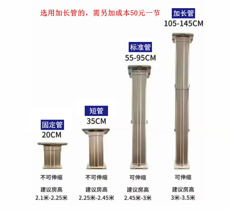 1、外排式吸烟灯所用伸缩管有以下几种:25CM、35CM、95CM和145CM,标配为95CM管子。
