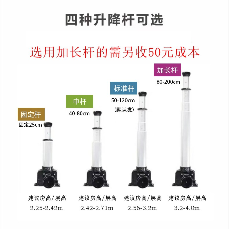 0.25米的为固定杆,不可遥控升降,其它长度的升降杆可遥控升降。