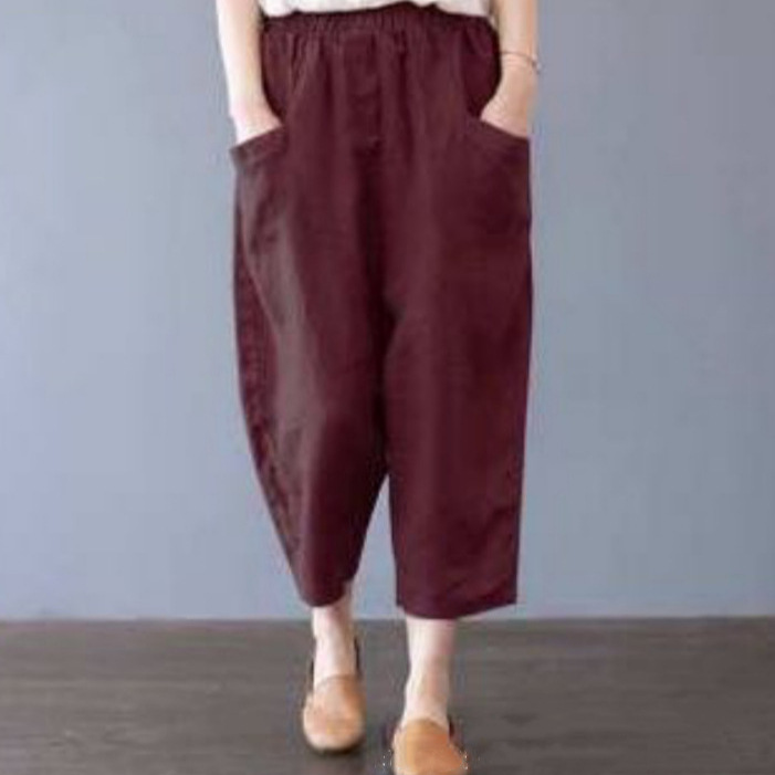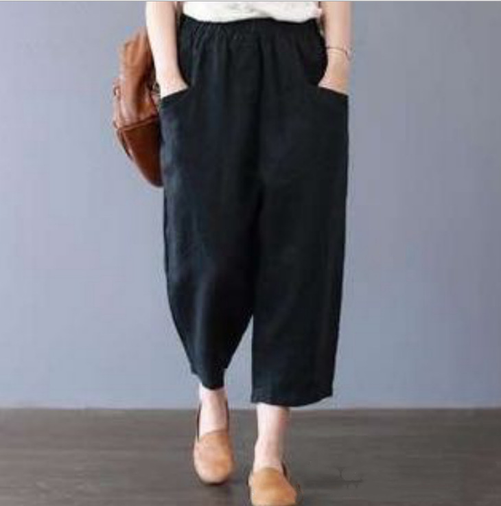AliExpress 이베이 아마존 해외 무역 크로스 보더 여성용 단색 플러스 사이즈 느슨한 하이 웨이스트 포켓 코튼 린넨 캐주얼 바지
