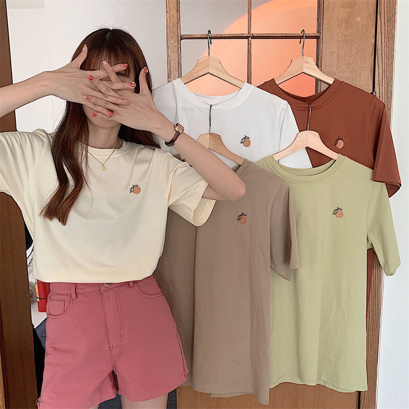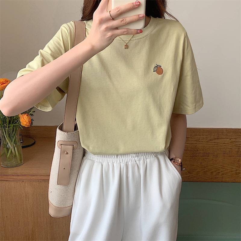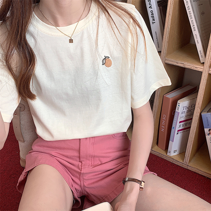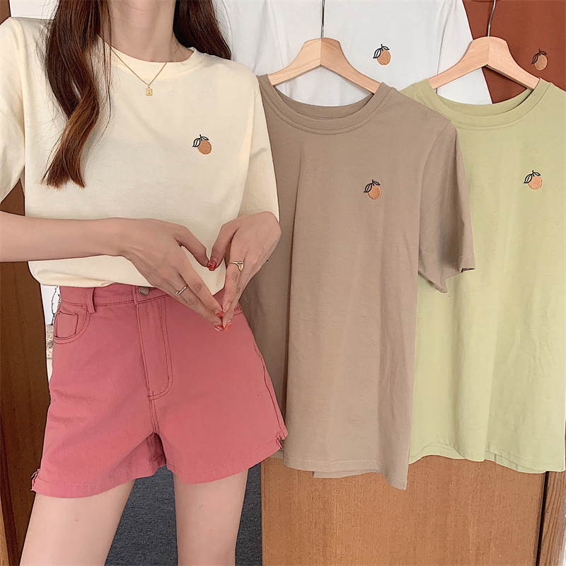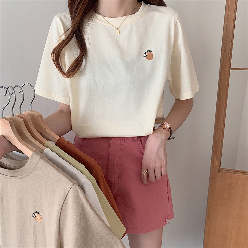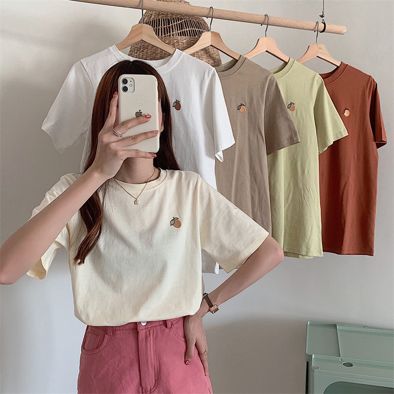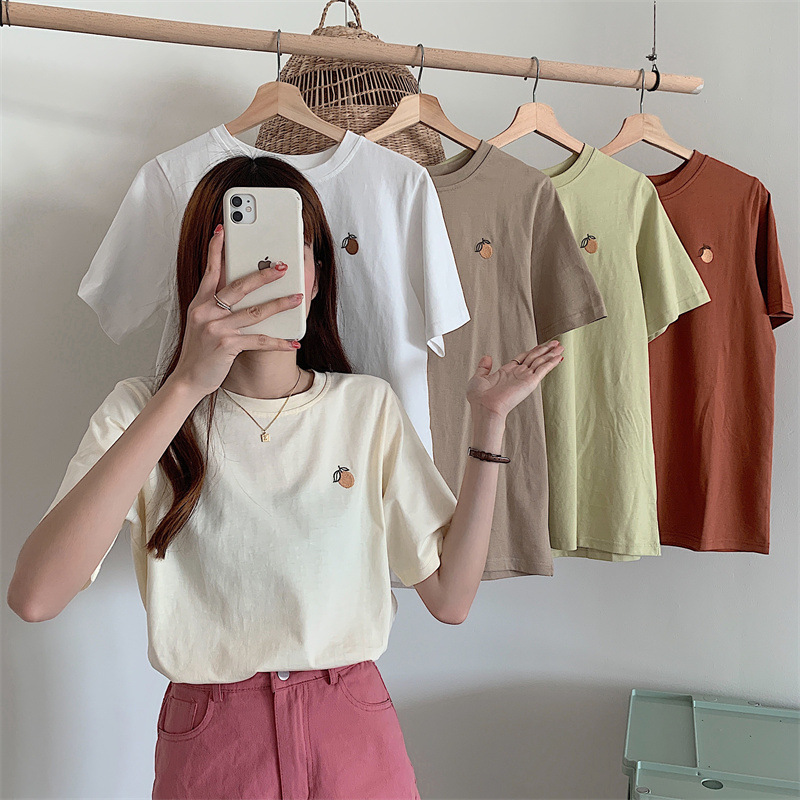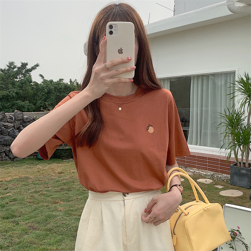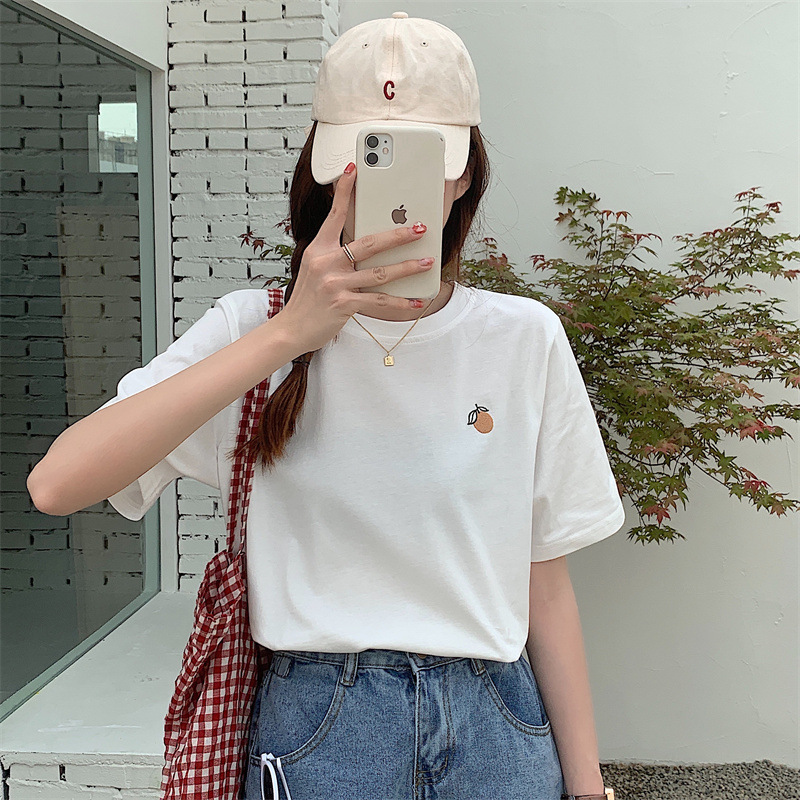 여성을위한 순수 코튼 오렌지 자수 반팔 티셔츠 여름 새로운 느슨한 작은 신선한 학생 바닥 셔츠 탑