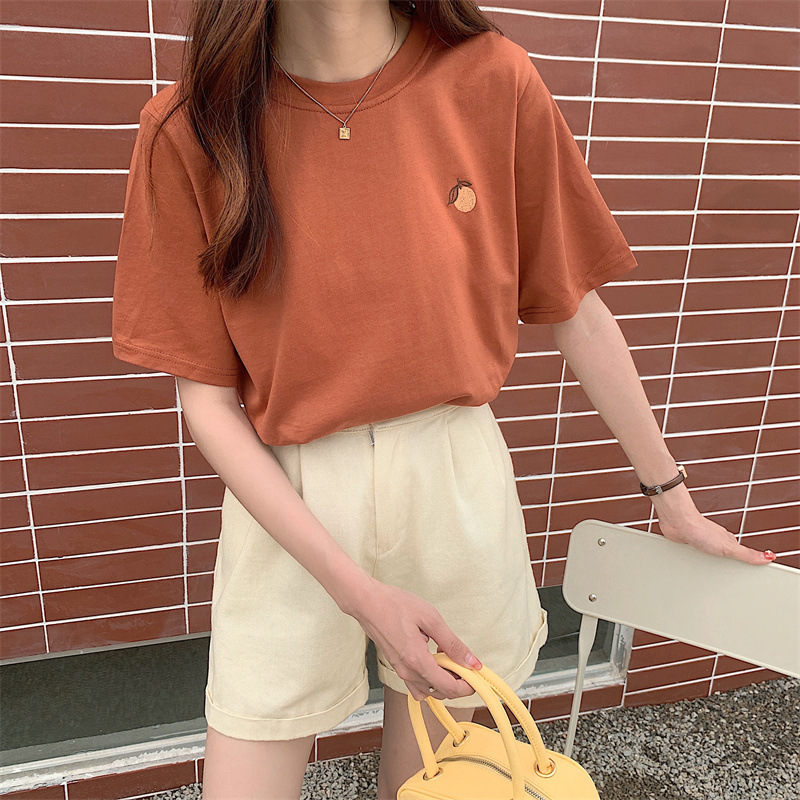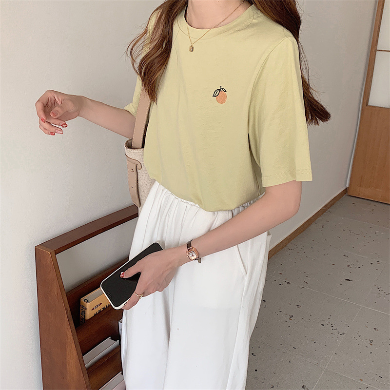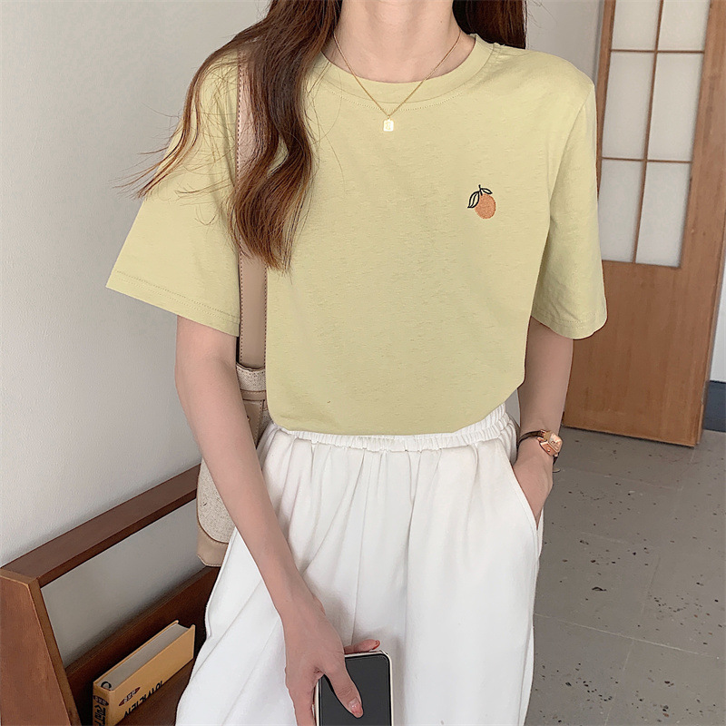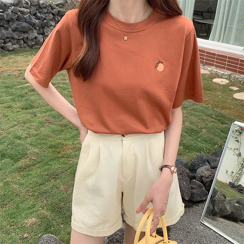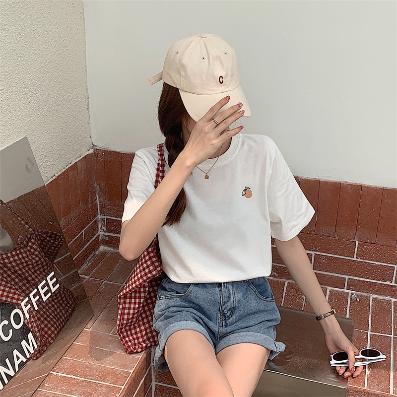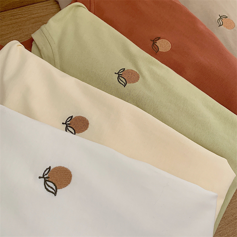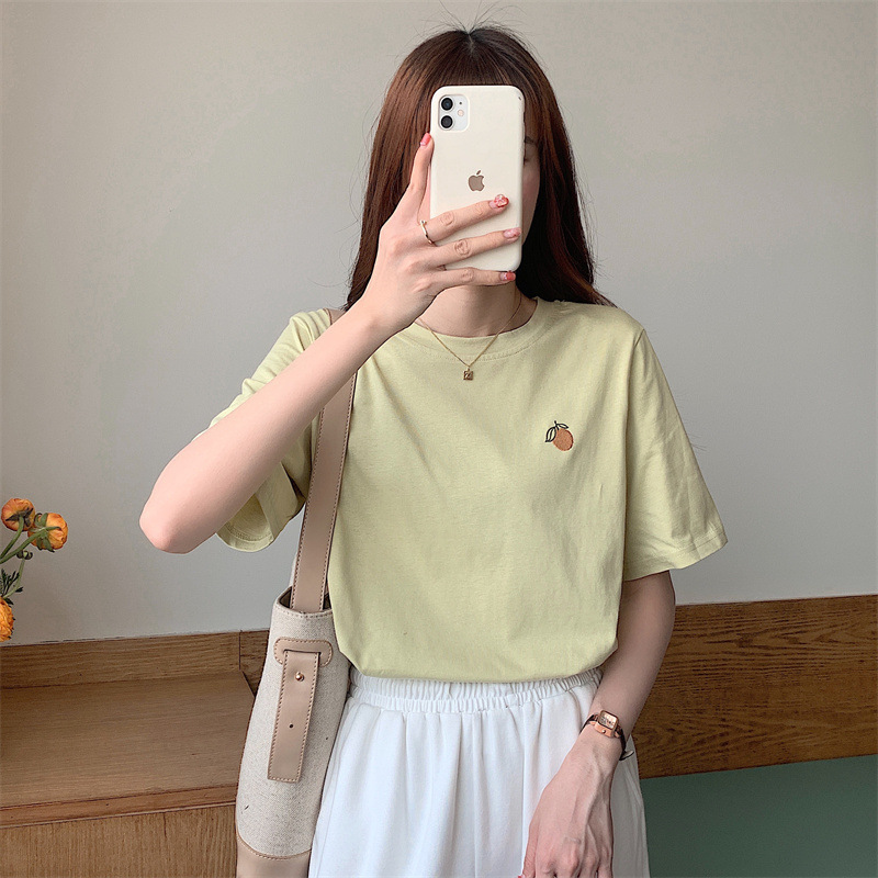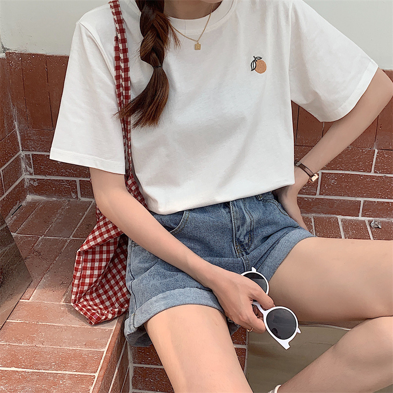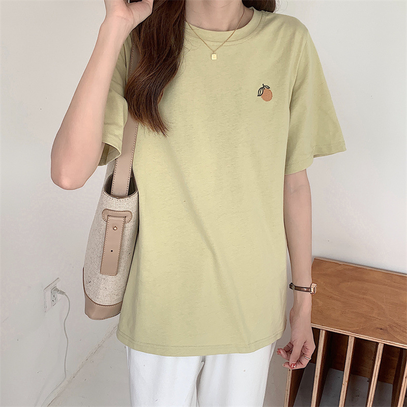 여성을위한 순수 코튼 오렌지 자수 반팔 티셔츠 여름 새로운 느슨한 작은 신선한 학생 바닥 셔츠 탑