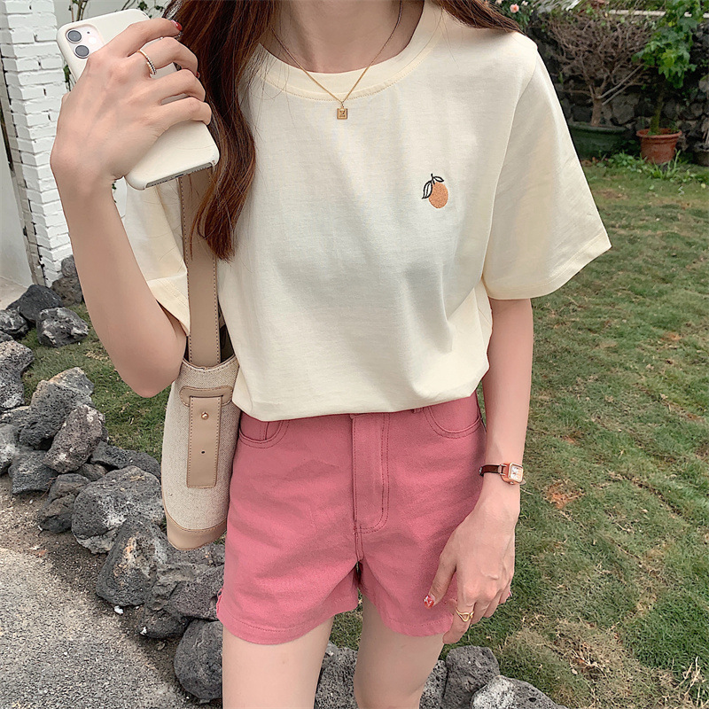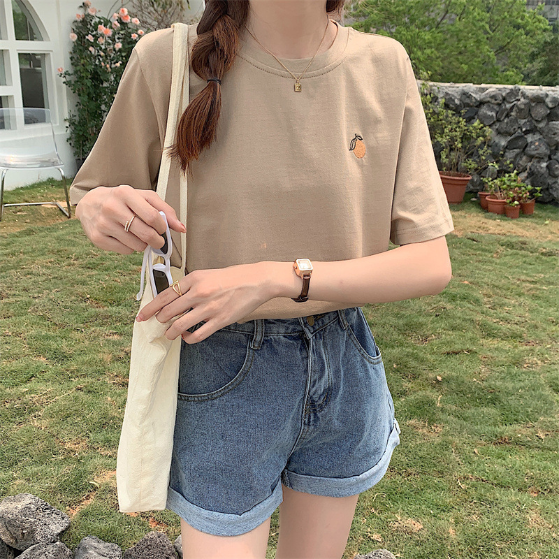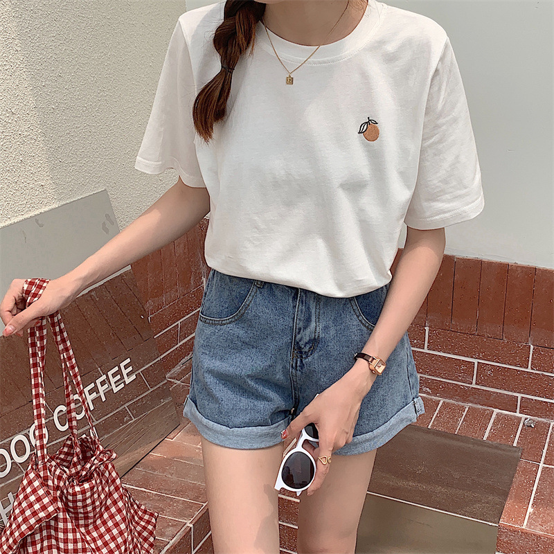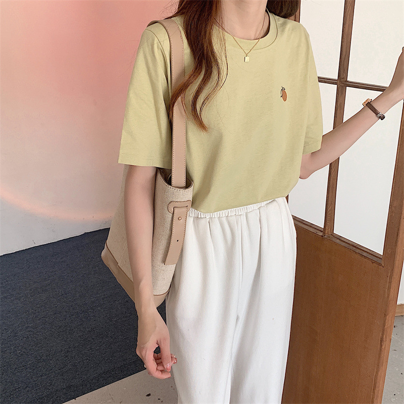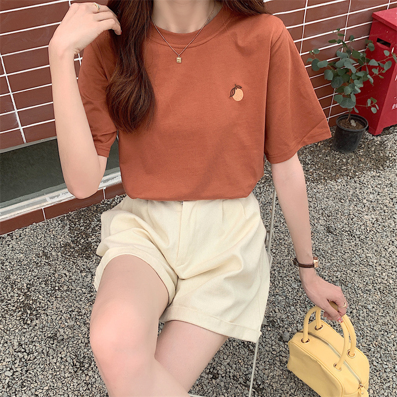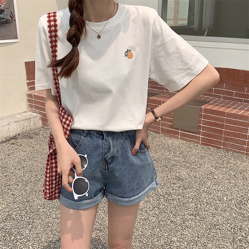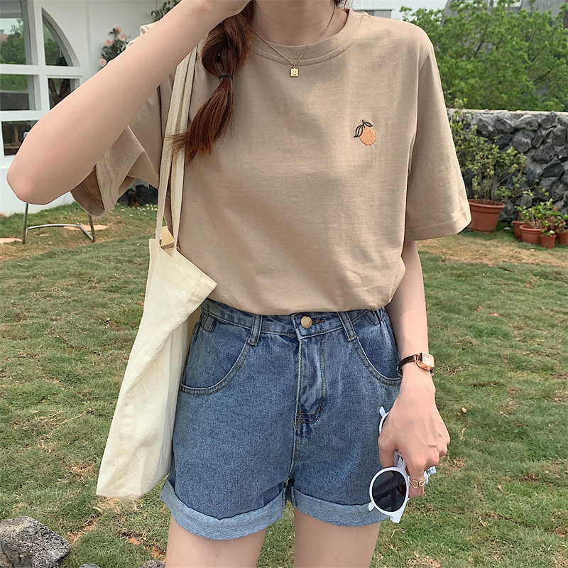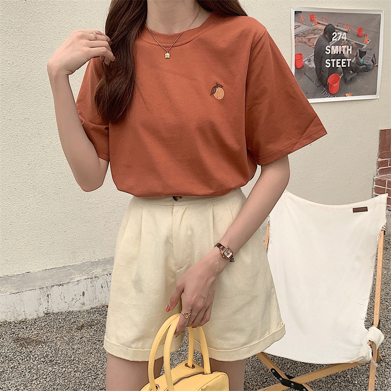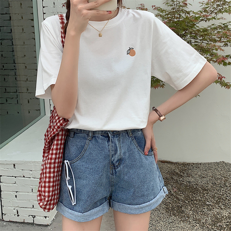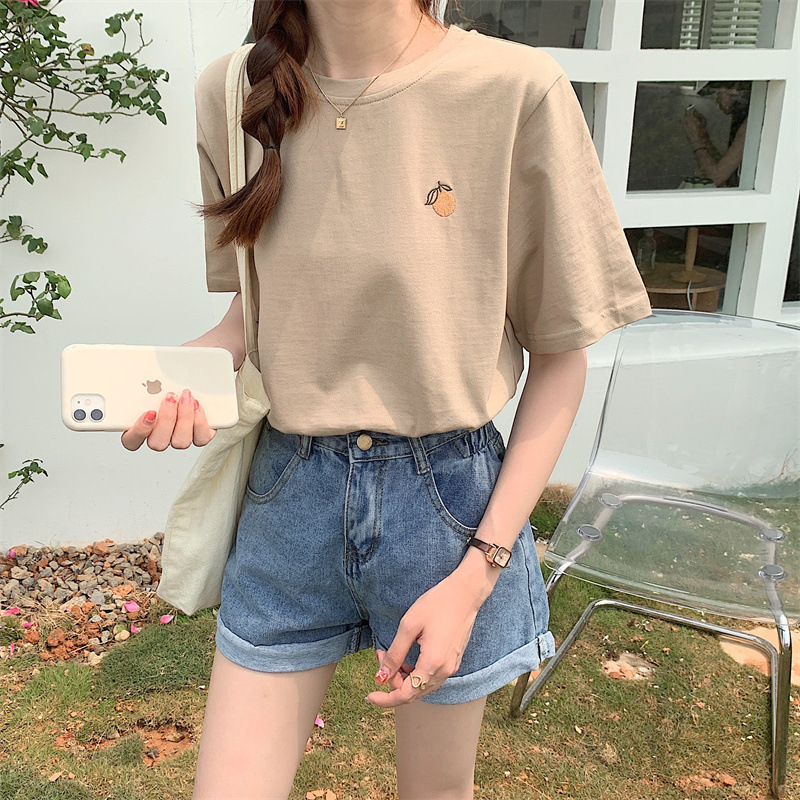 여성을위한 순수 코튼 오렌지 자수 반팔 티셔츠 여름 새로운 느슨한 작은 신선한 학생 바닥 셔츠 탑