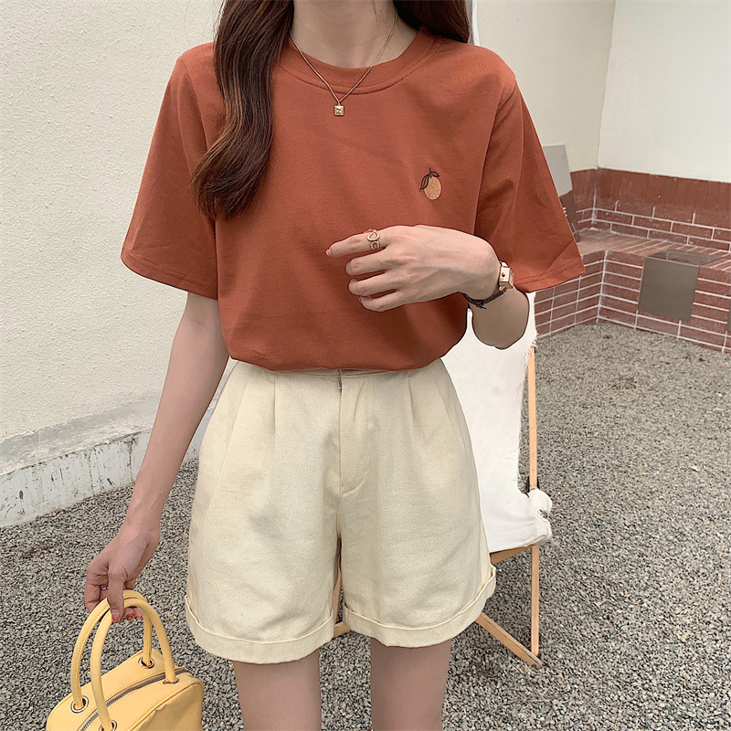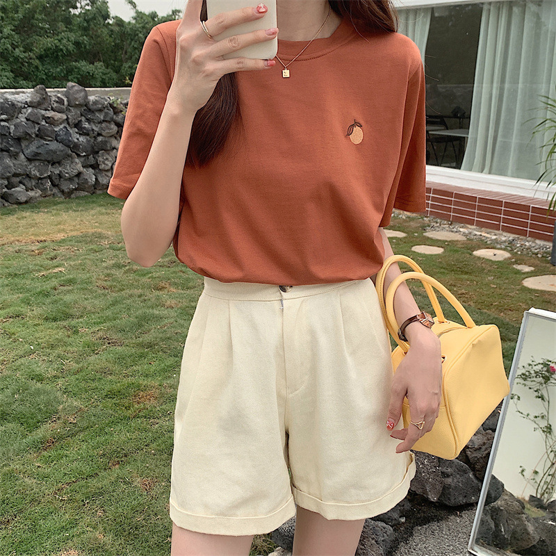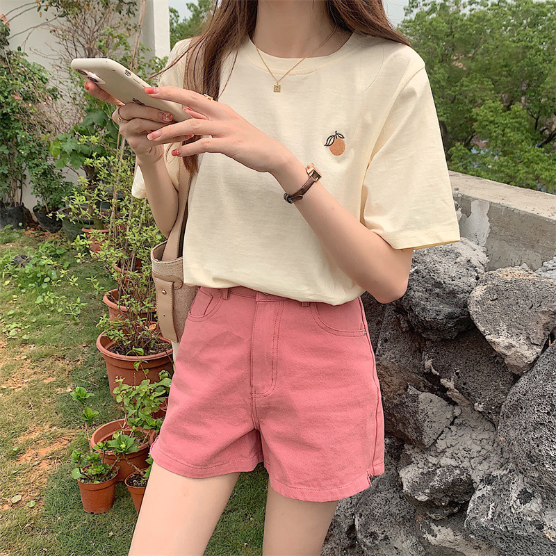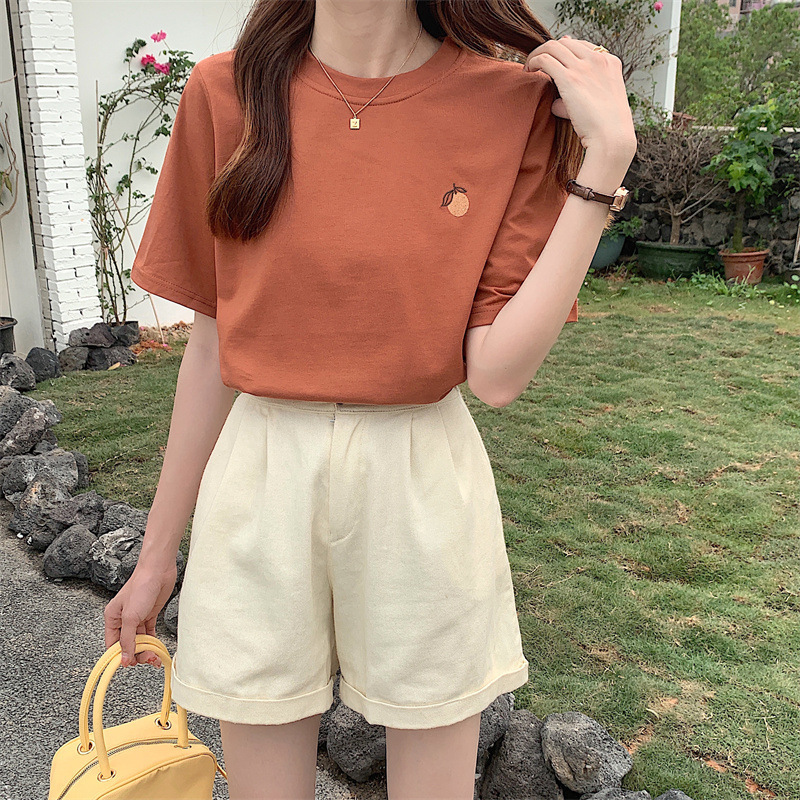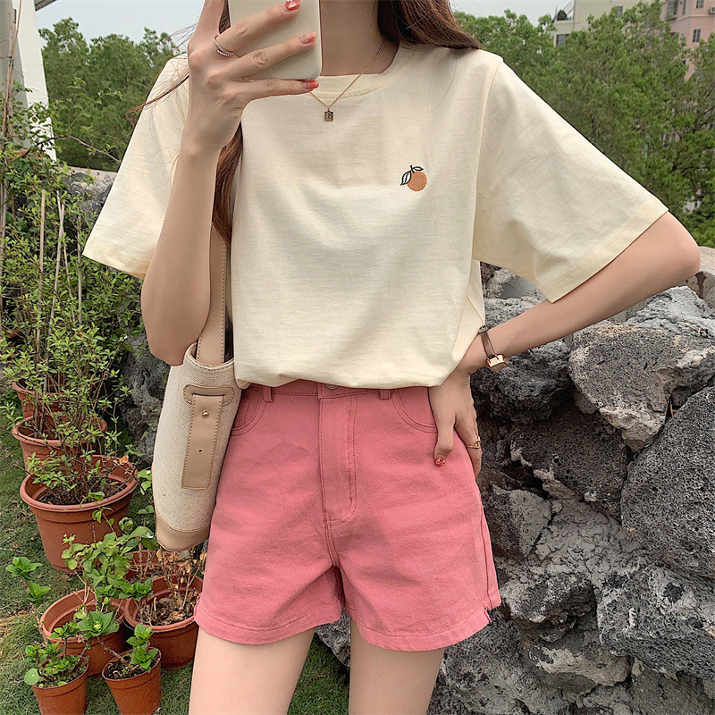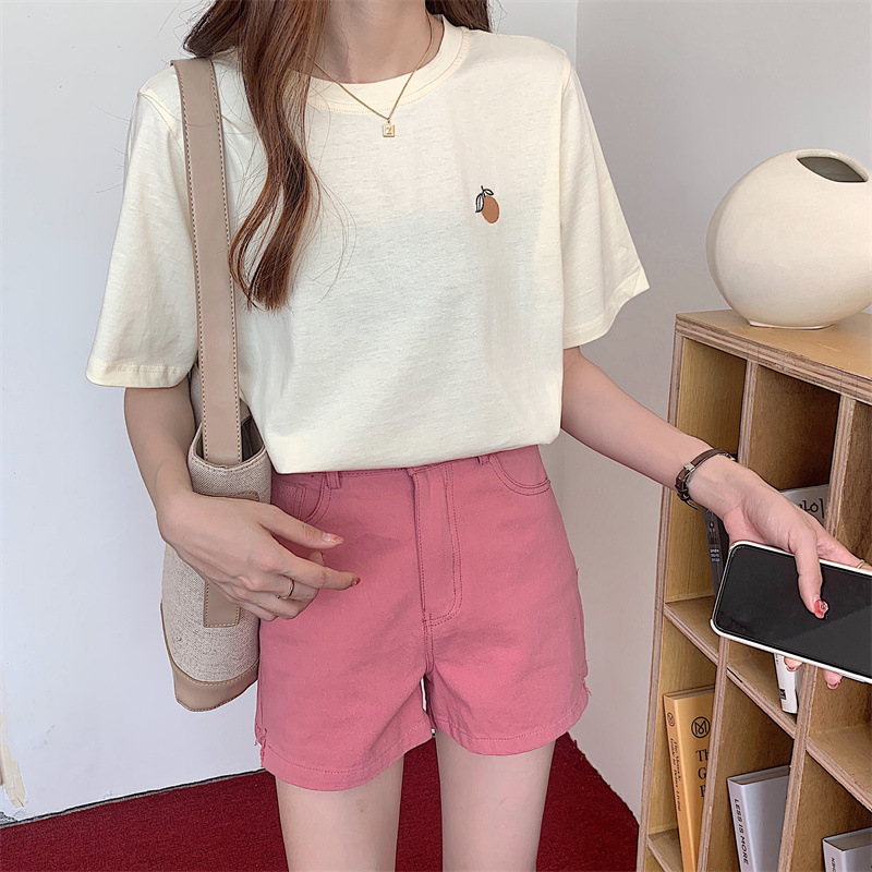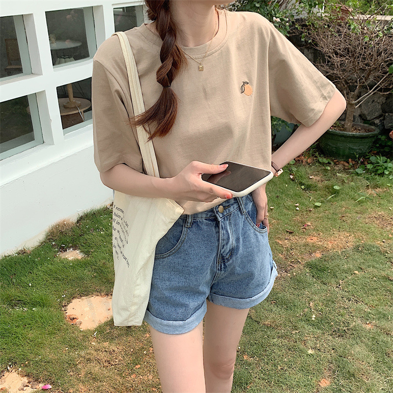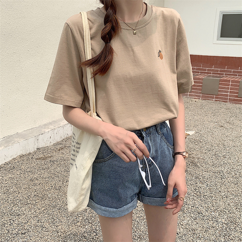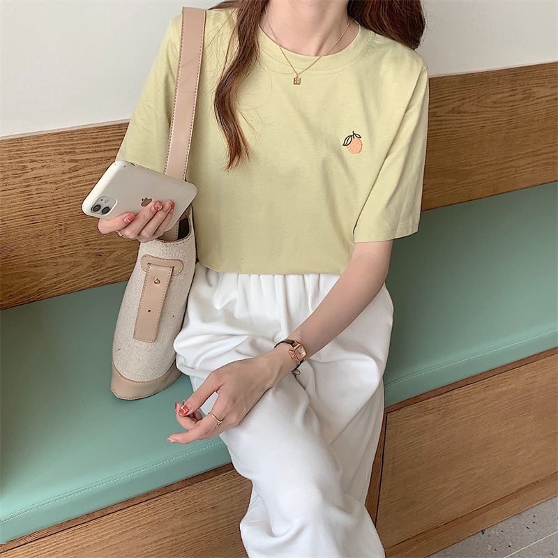 여성을위한 순수 코튼 오렌지 자수 반팔 티셔츠 여름 새로운 느슨한 작은 신선한 학생 바닥 셔츠 탑