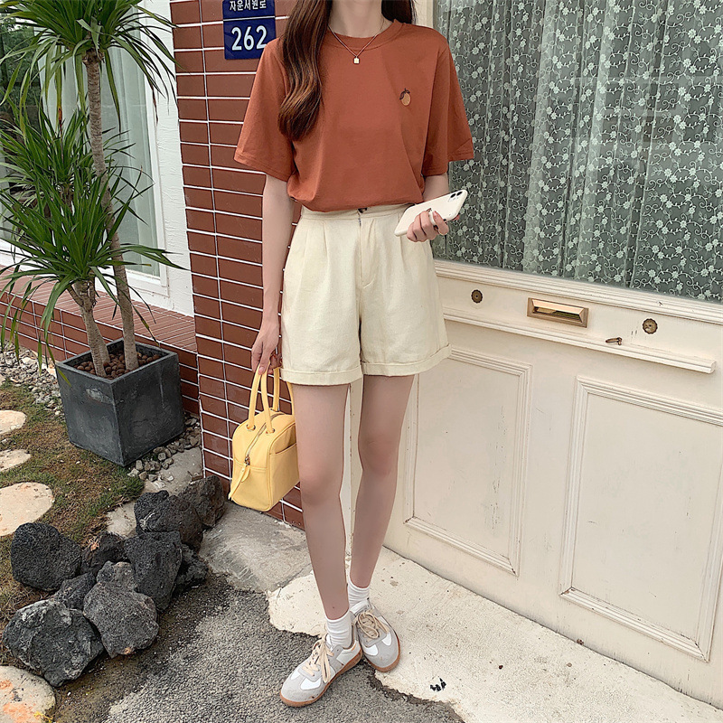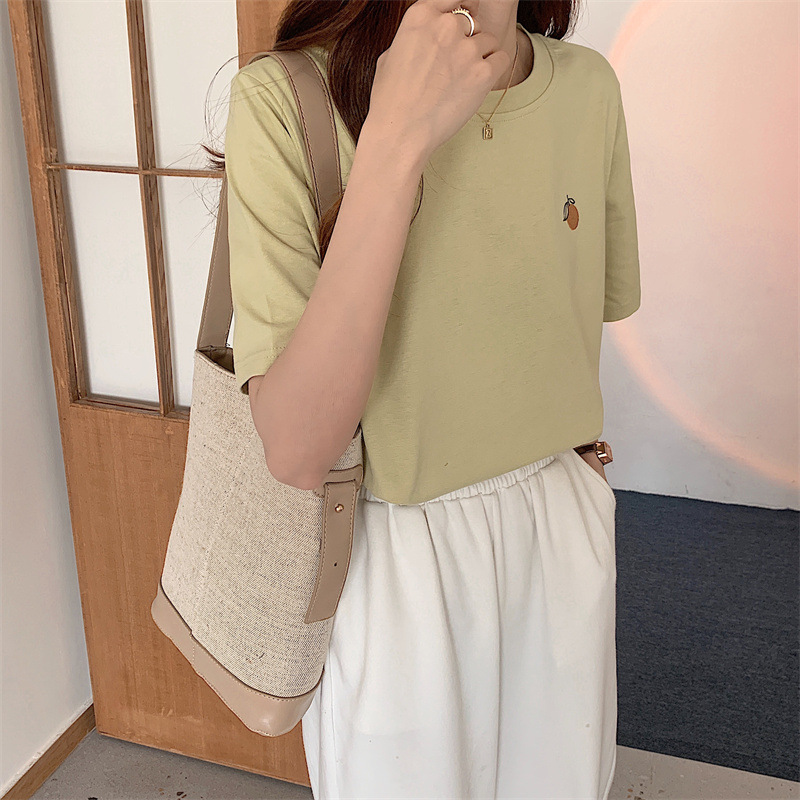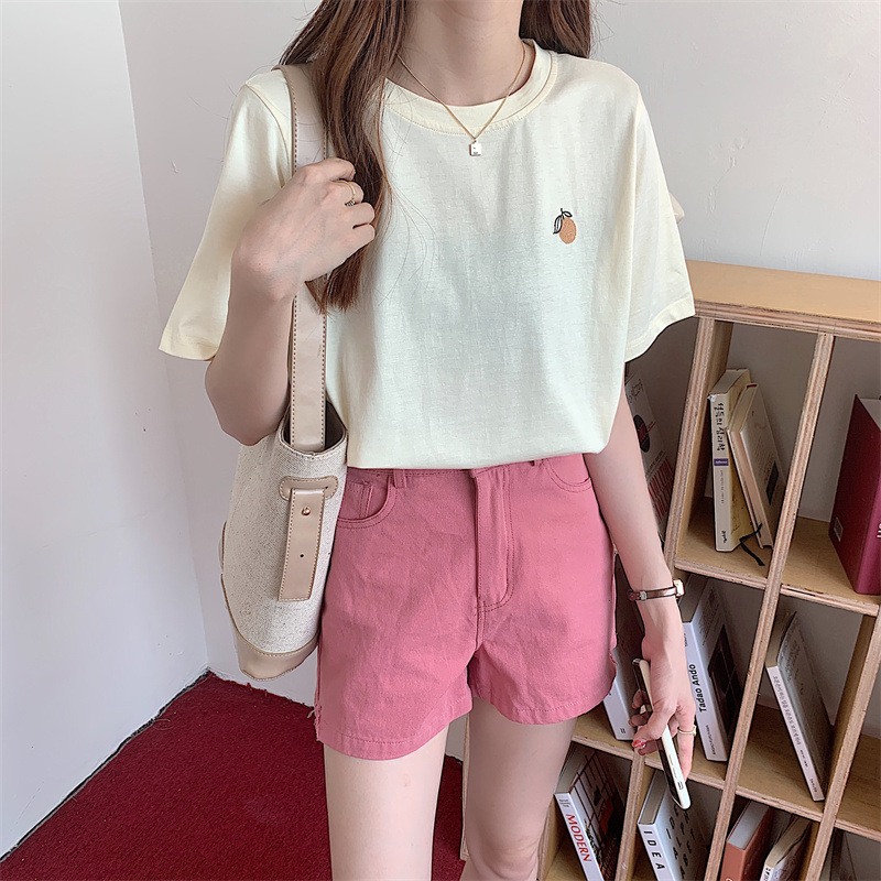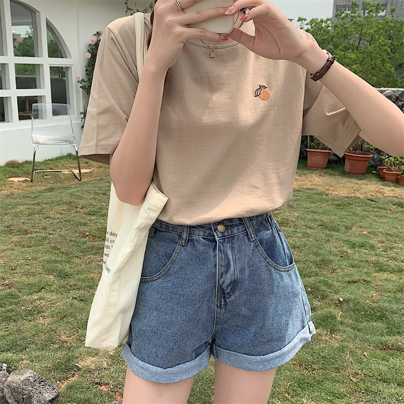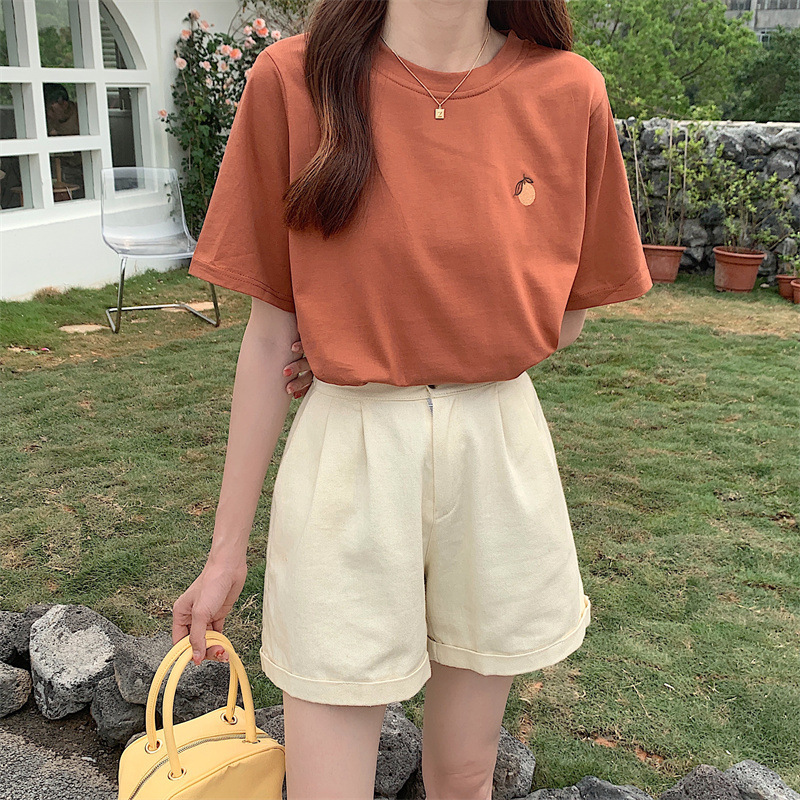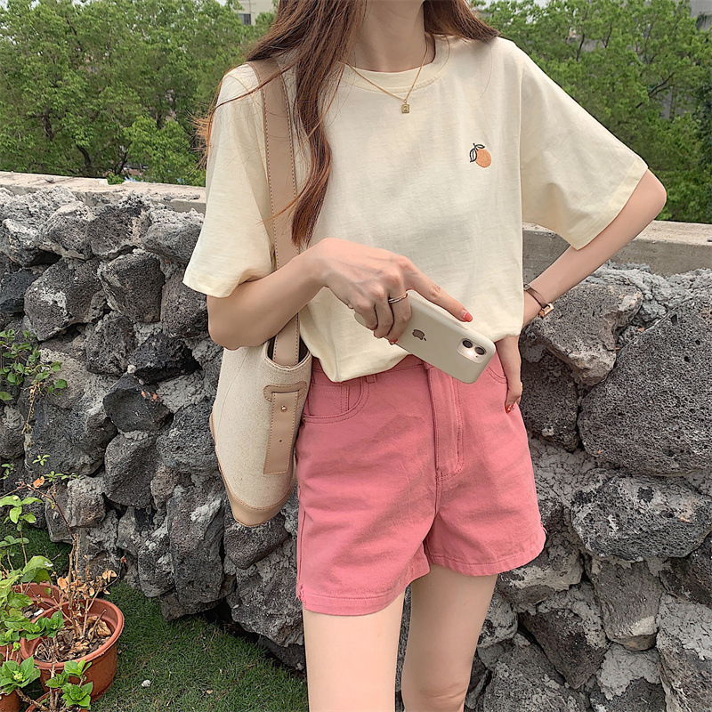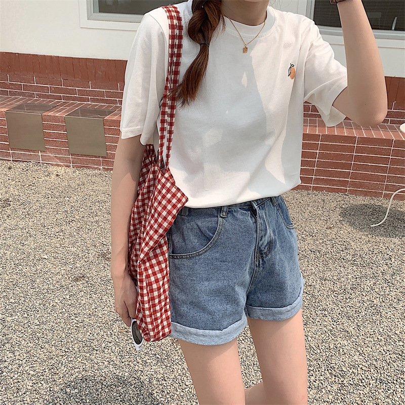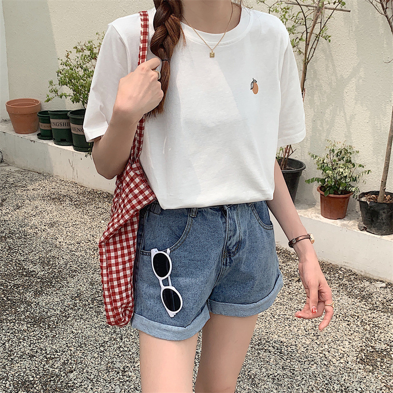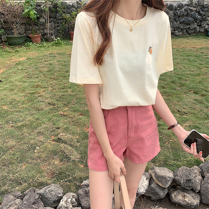 여성을위한 순수 코튼 오렌지 자수 반팔 티셔츠 여름 새로운 느슨한 작은 신선한 학생 바닥 셔츠 탑