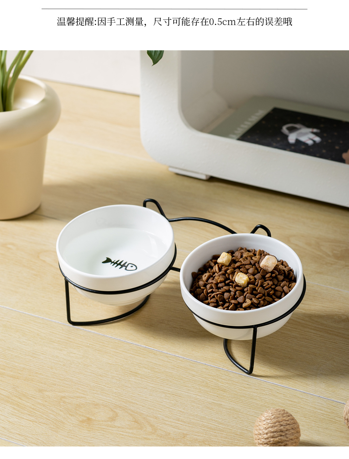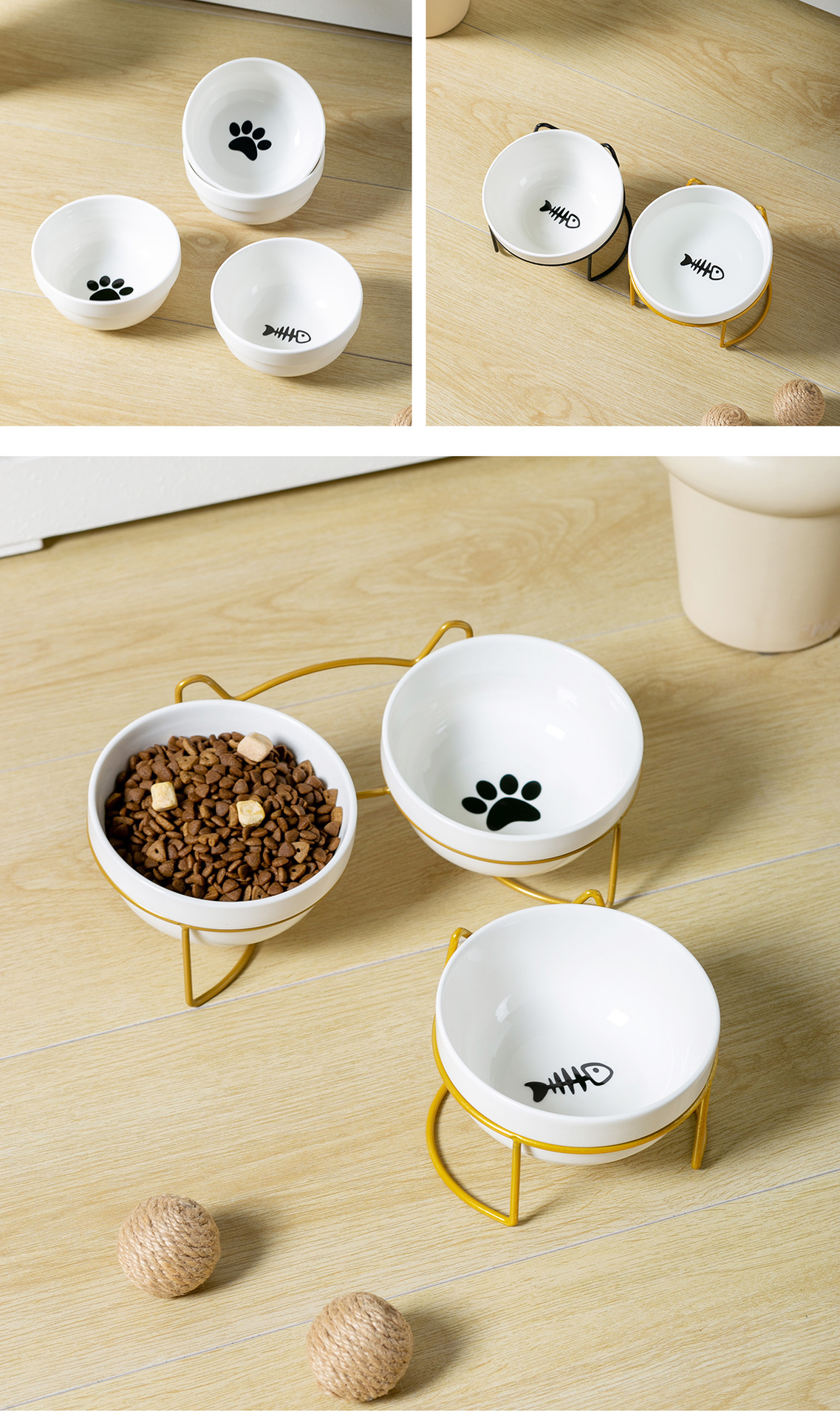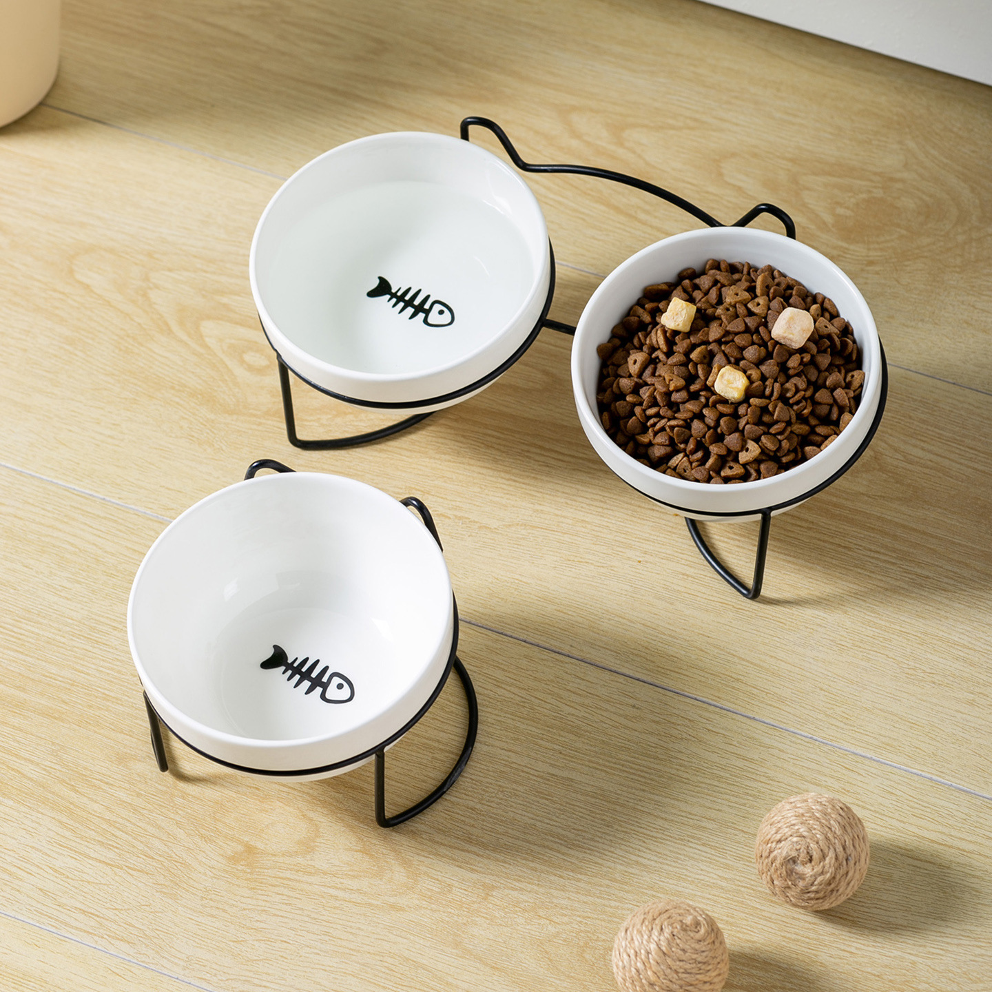 순백색 도자기 그릇 [생선뼈 + 고양이 발톱] + 더블 [검은 철제 프레임 - 고양이 귀]