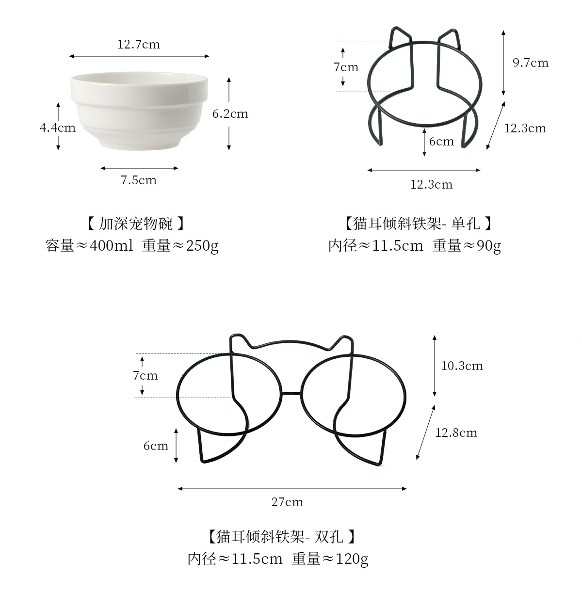 순백색 도자기 밥그릇 + [블랙 철제 거치대 - 고양이 귀] 세트
