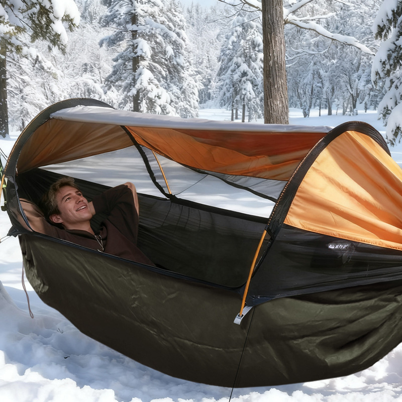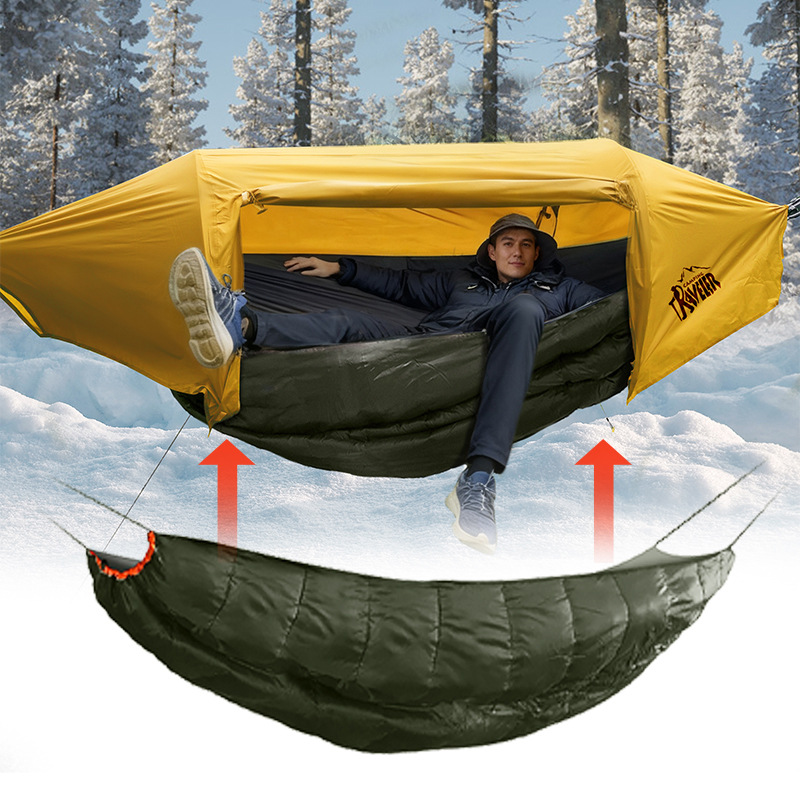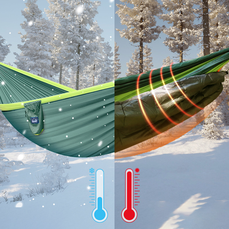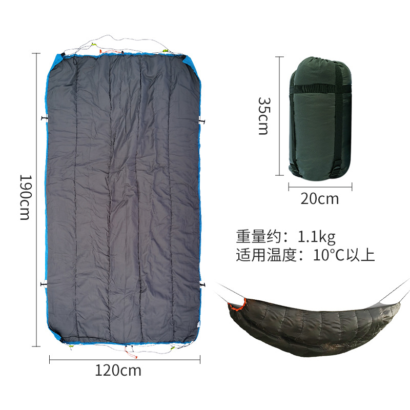 此款睡袋设计是无拉链款式,专业搭配吊床使用,作为吊床底下的被子,具有防寒防风保暖的作用;外袋采用压缩设计,可压缩体积便于携带;