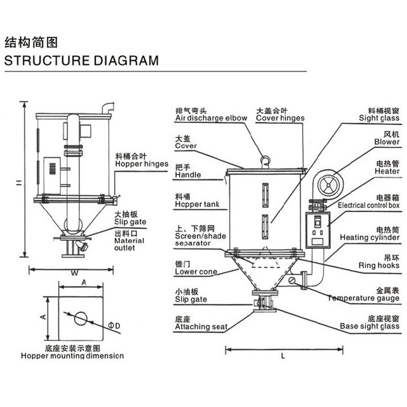 새로운 도트 뜨거운 공기 호퍼 플라스틱 건조기 pc 플라스틱 원료 과립 뜨거운 공기 건조기 사출 성형 보조 기계