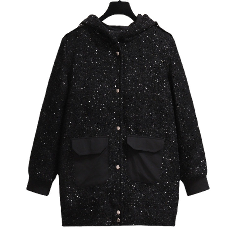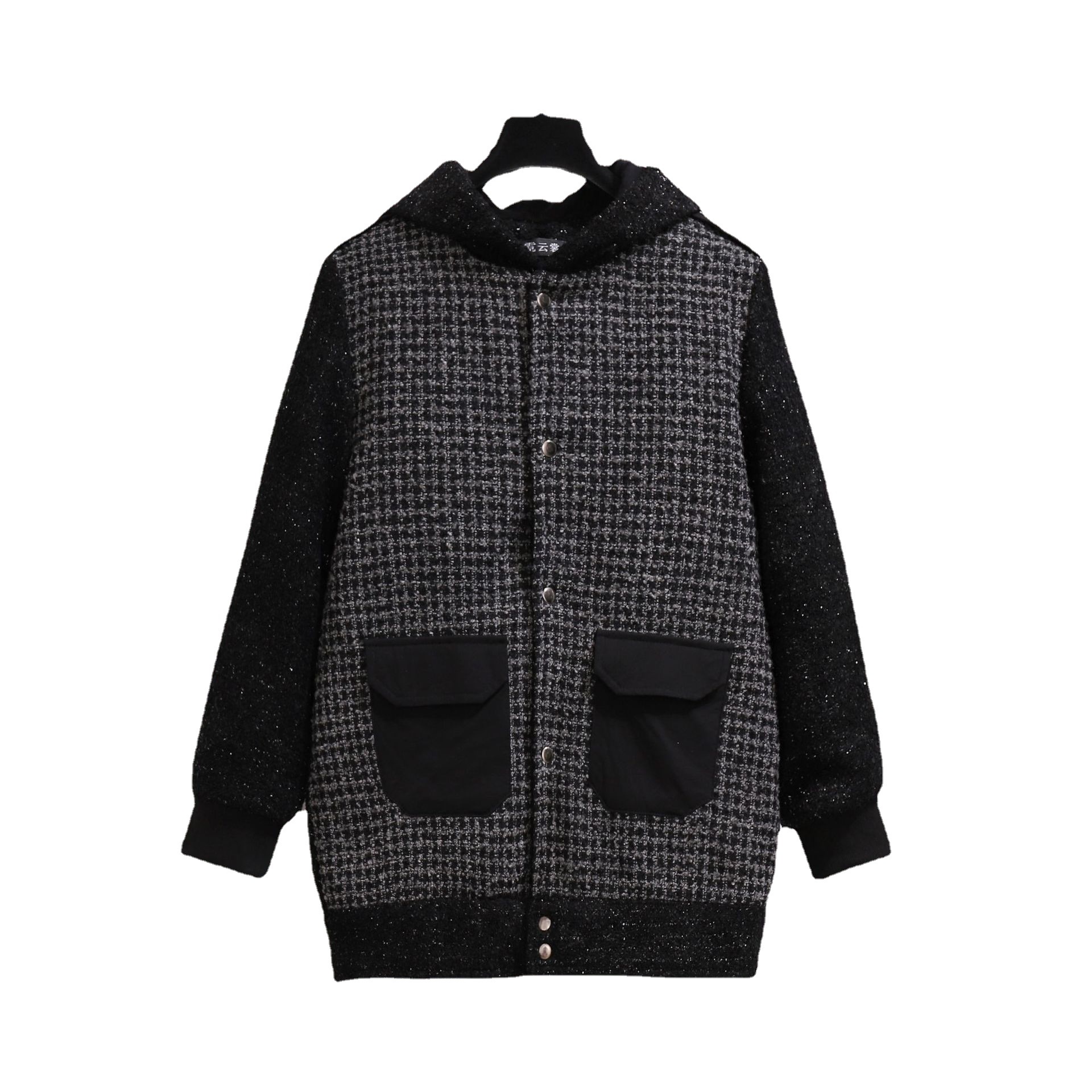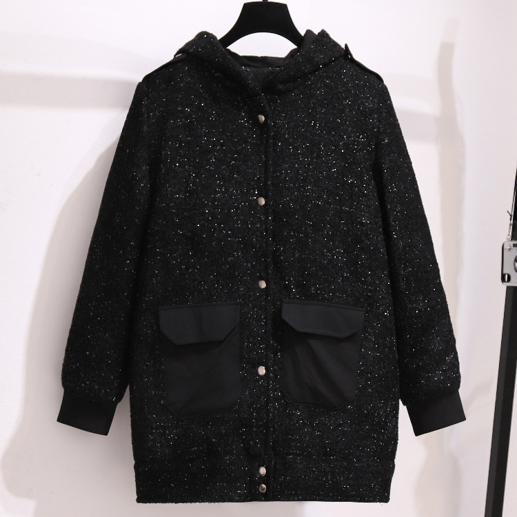 这款是中长款外套,有里布,里布是加绒的不倒绒,是冬天里的小太阳,很厚实,有份量,连帽设计,黑色布料有闪光金线在里面,很质感高档的一款面料,小格子撞色超级显瘦怀旧风格,集时尚和古典于一身,限价168,低于此价格取消代理资格