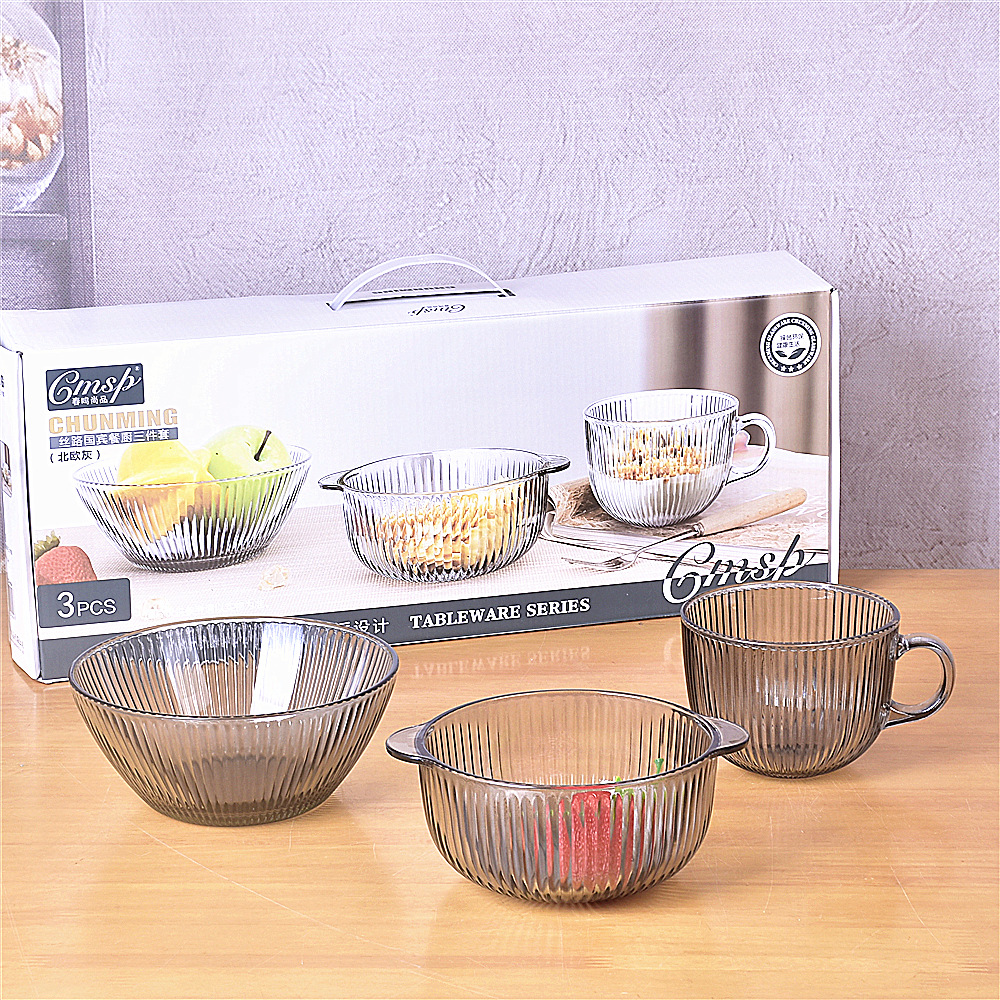欧式茶色玻璃煲 带盖家用玻璃碗泡面碗三件套 沙拉碗汤碗礼品批发
