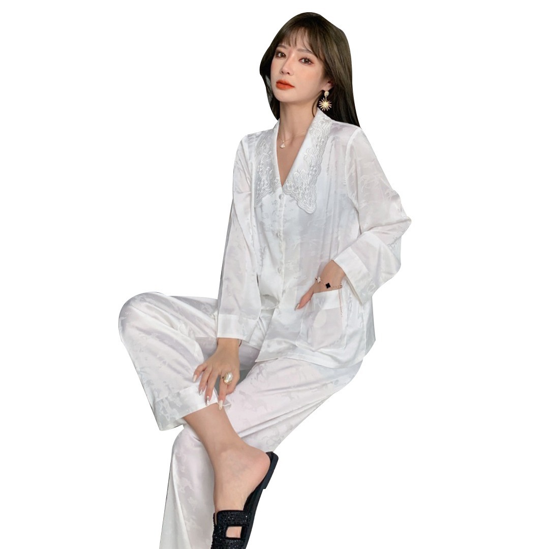 2023 새로운 잠옷 여자의 봄과 가을 긴 소매 얇은 인형 칼라 자카드 아이스 실크 세트 단색 고급 감각 홈 옷
