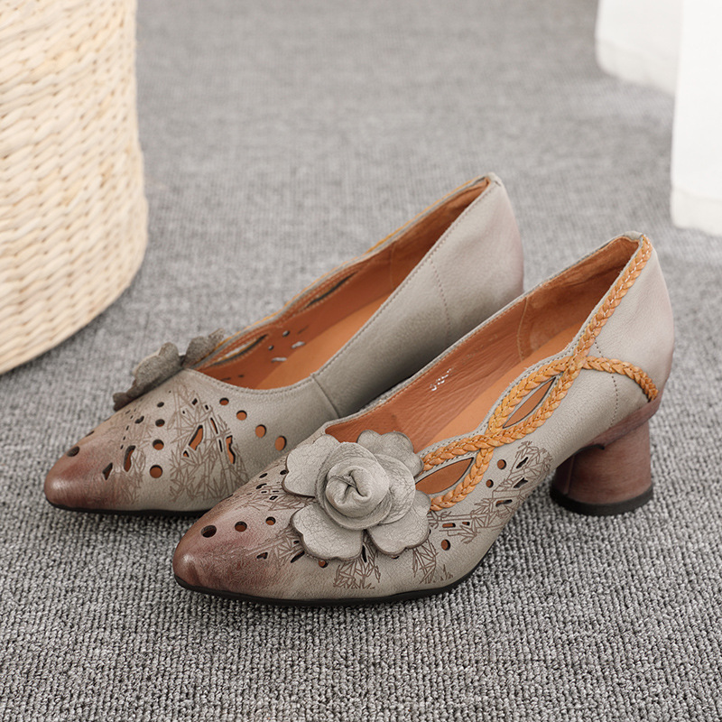 2026 신상품, 독보적인 디자인, 꽃무늬 여성 싱글 슈즈, 컬러 러빙 가공된 뾰족한 앞코, 두꺼운 굽, 통풍이 잘되는 고급스러운 소가죽 여성화