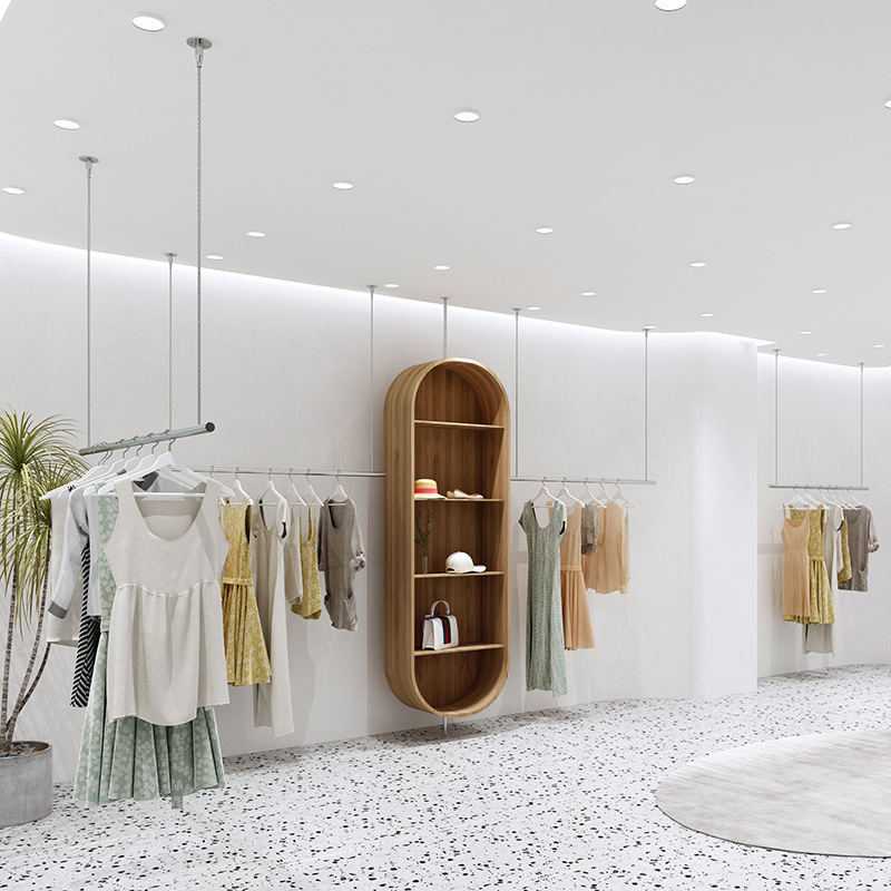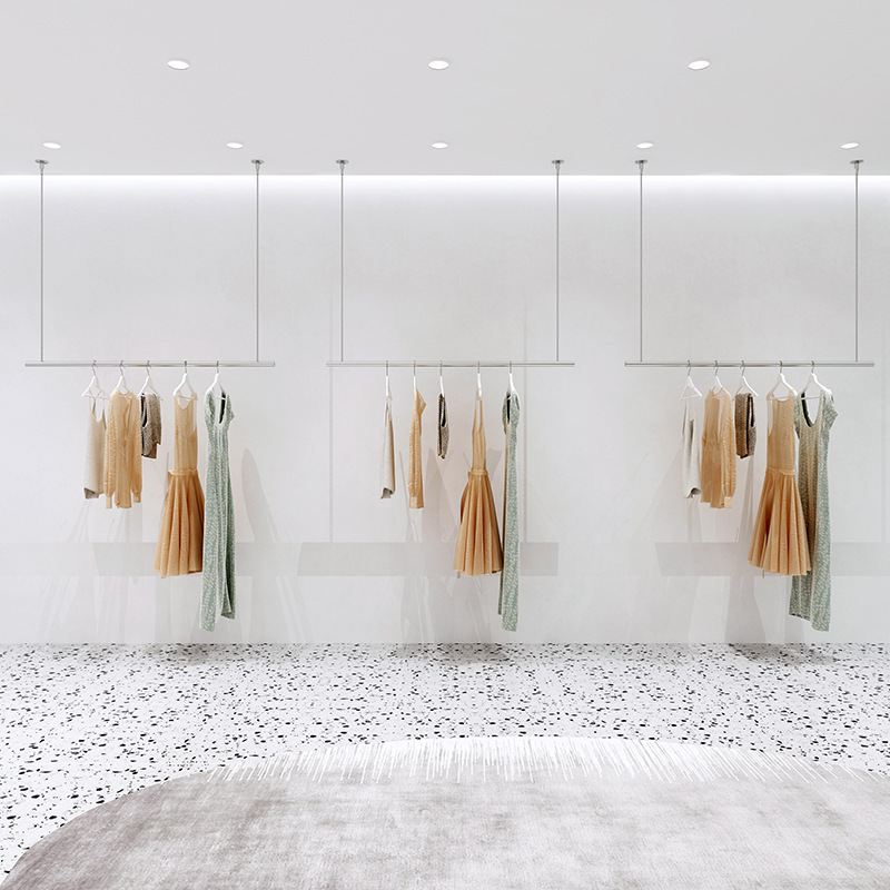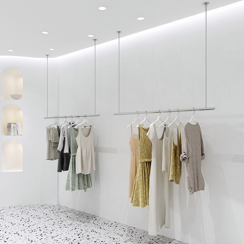 의류 매장 디스플레이 랙 천장 교수형 여성 의류 매장 옷걸이 웨딩 와이어 로프 조정 디스플레이 랙 스테인레스 스틸 행거