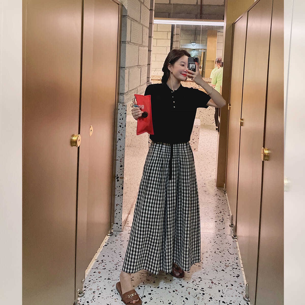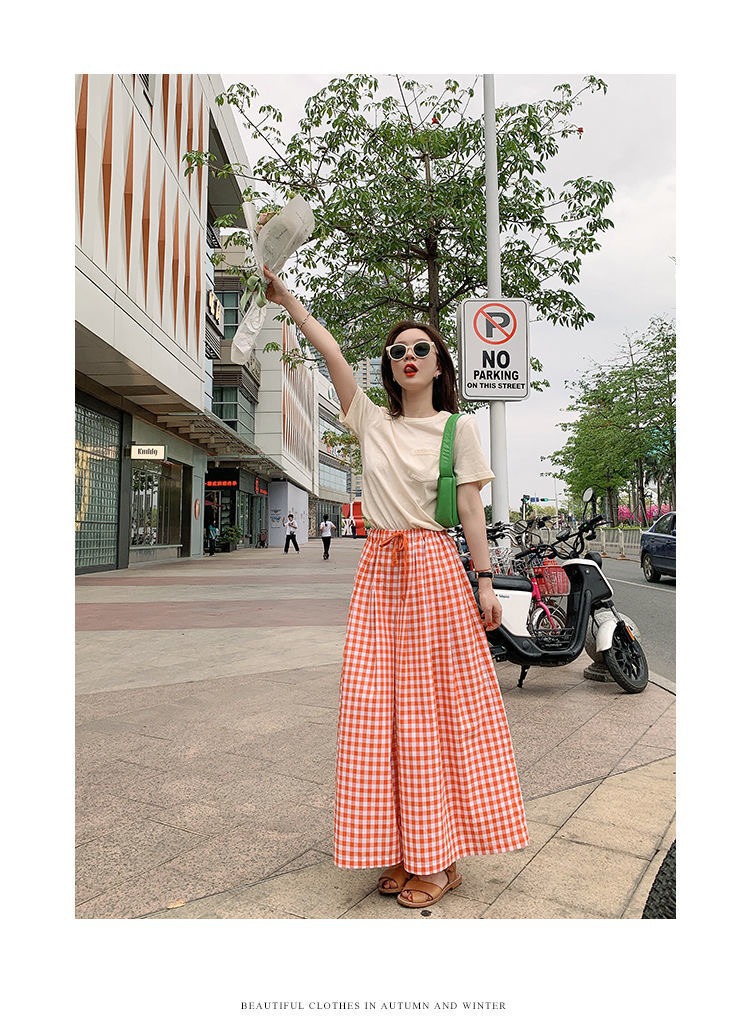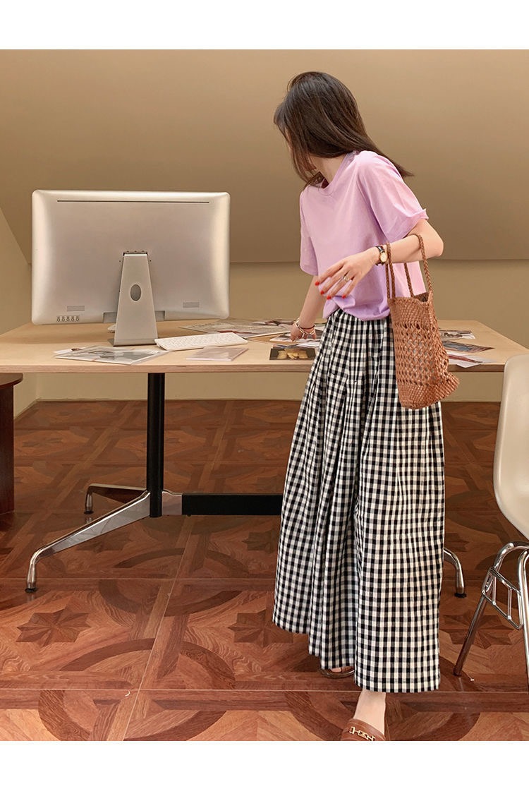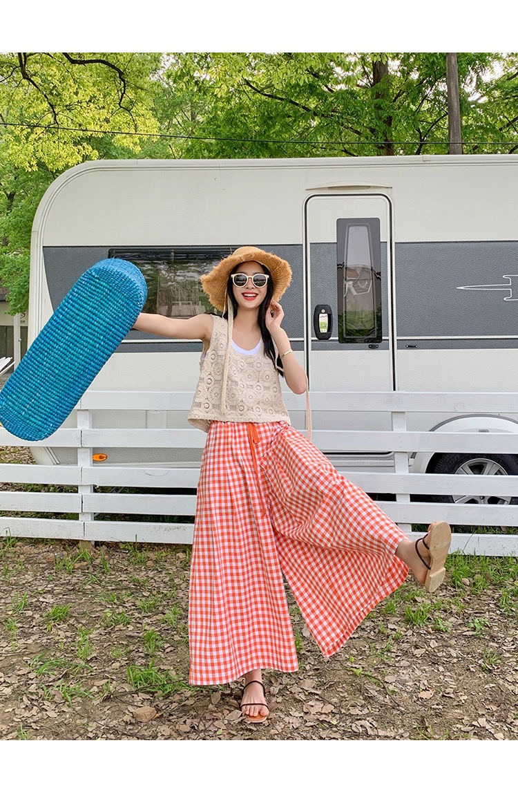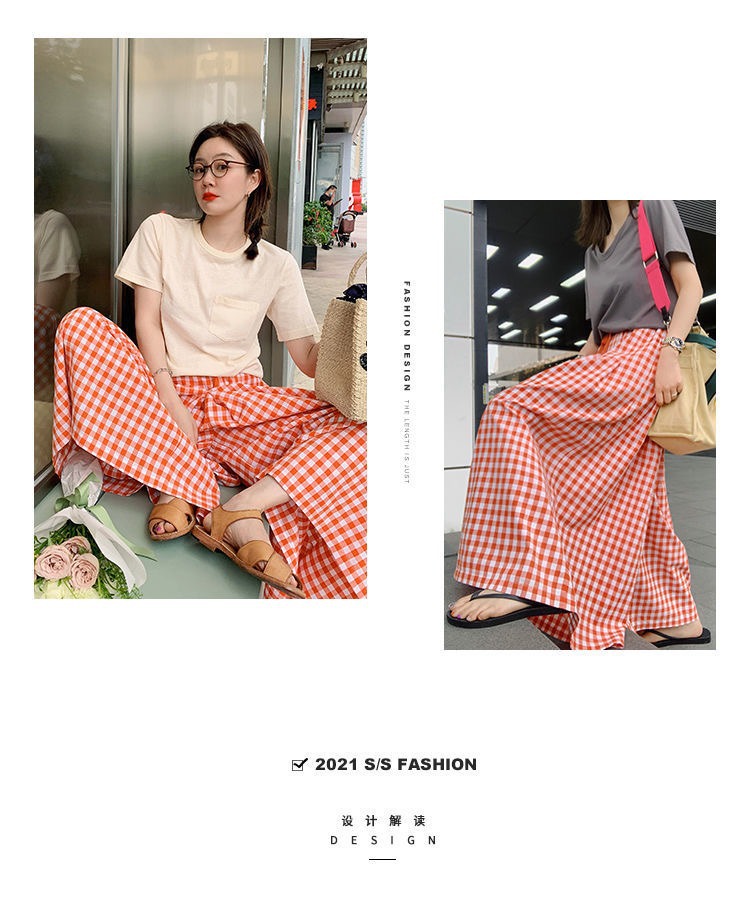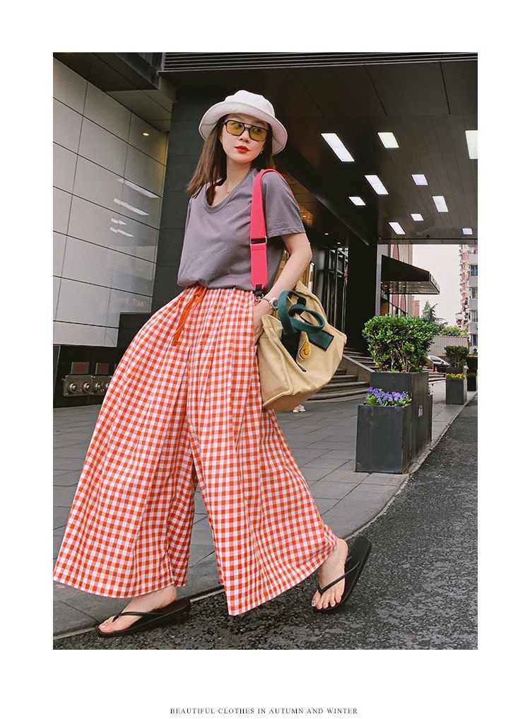 2025 새로운 여름 격자 무늬 넓은 다리 퀼로트 탄성 높은 허리 슬림 다목적 바지 여성을위한 느슨한 캐주얼 바지