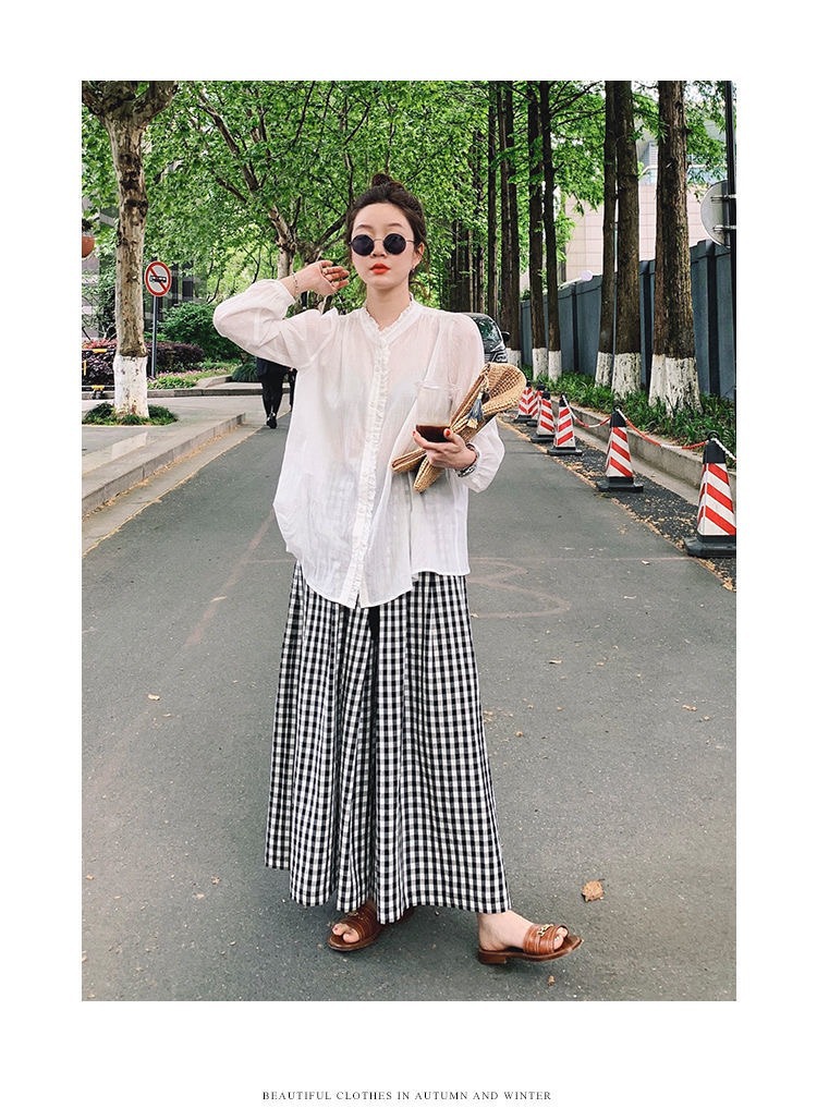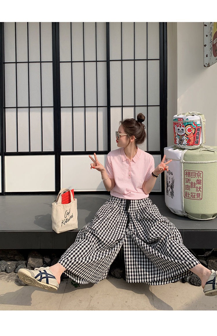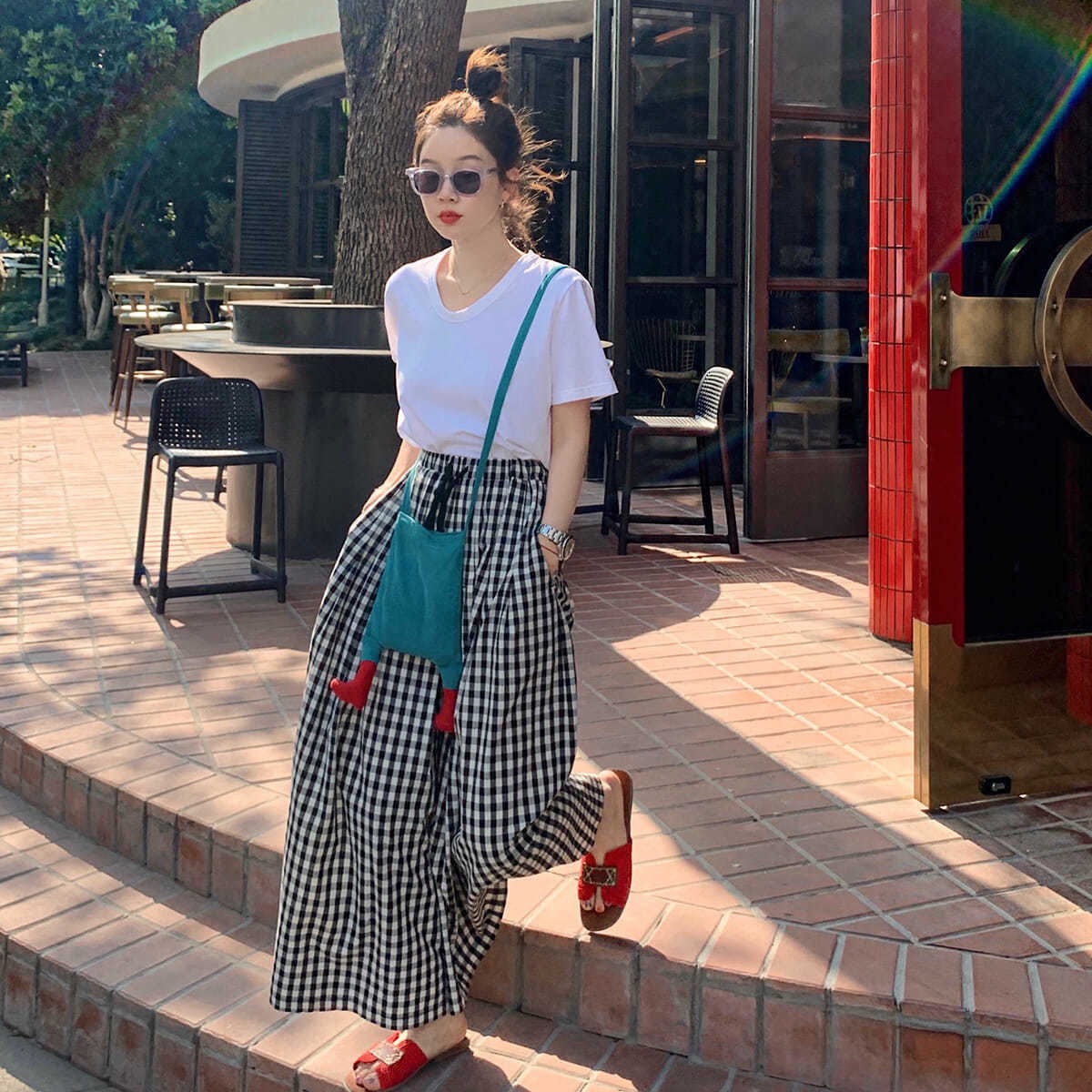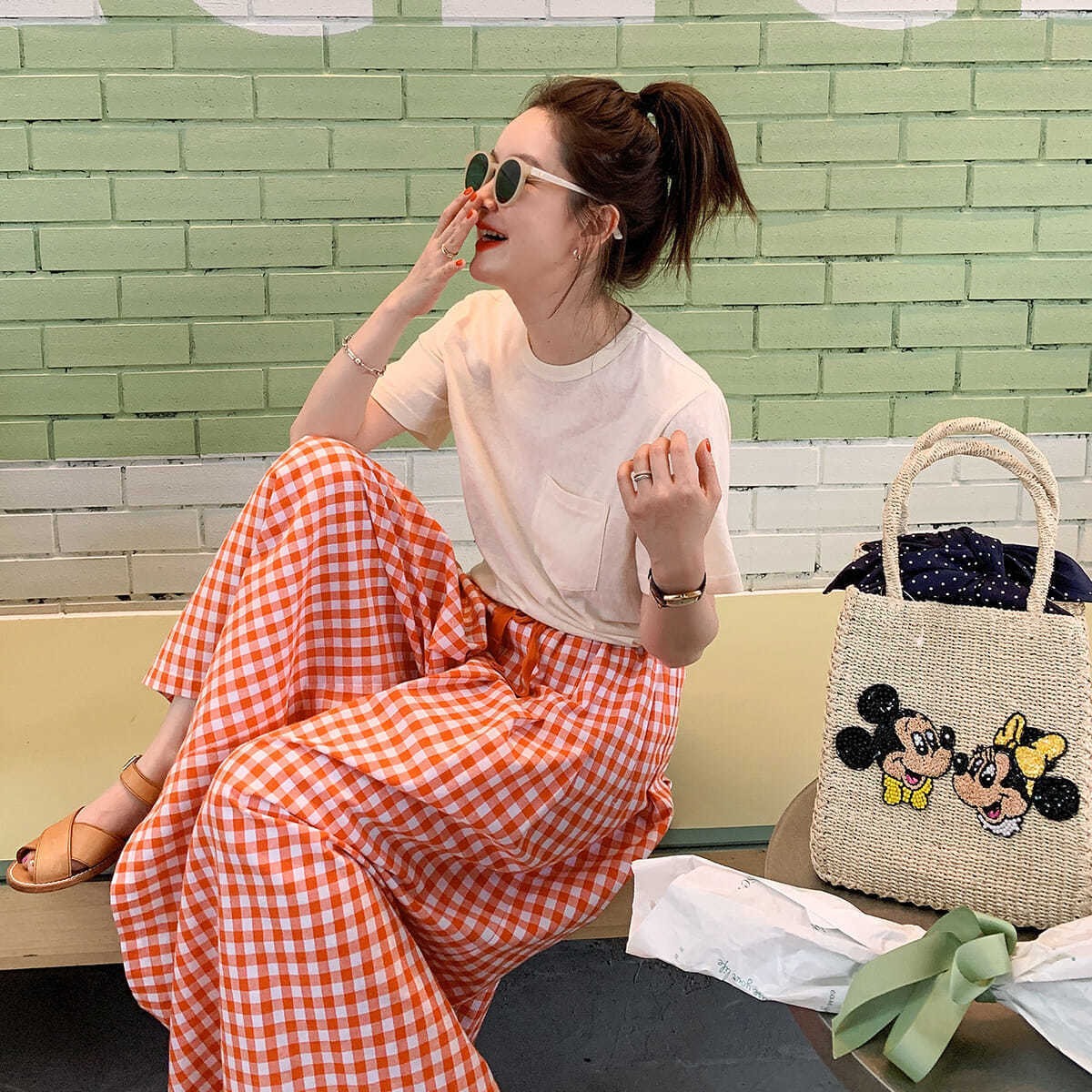 2025 새로운 여름 격자 무늬 넓은 다리 퀼로트 탄성 높은 허리 슬림 다목적 바지 여성을위한 느슨한 캐주얼 바지